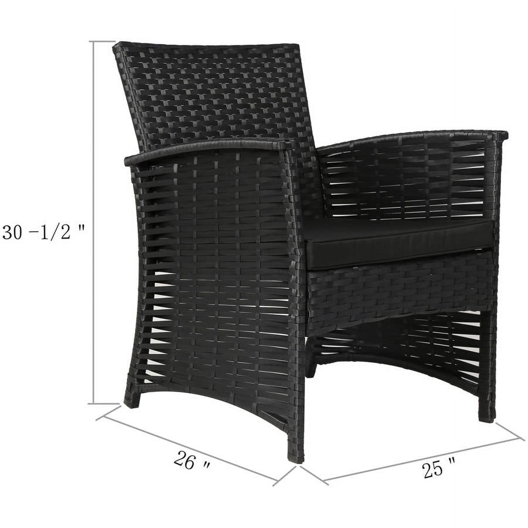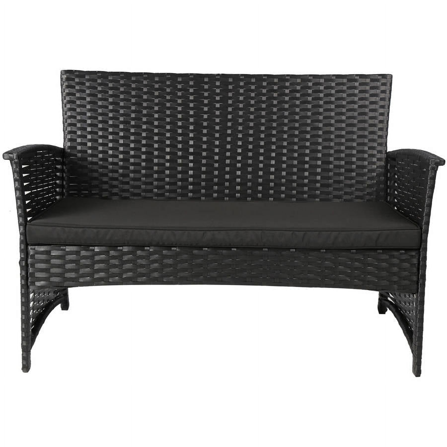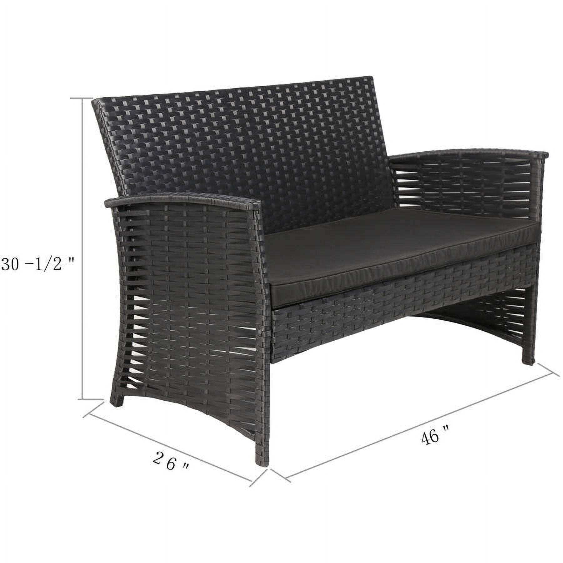 Baner Garden 4-Piece Outdoor Furniture Complete Set, Black: Complete outdoor patio set with tailored cushions Low-maintenance weather-resistant resin wicker and powder-coated steel frame 2 double sofas (46″ x 26″ x 30-3/8″) Single sofa (24-3/4″ x 26″ x 30-3/8″) Coffee table (31-7/8″ x 18-7/8″ x 15-3/4″) Weight capacity: 350 lbs