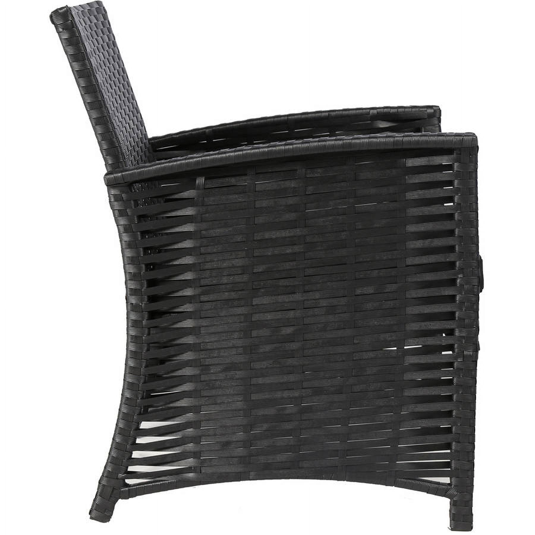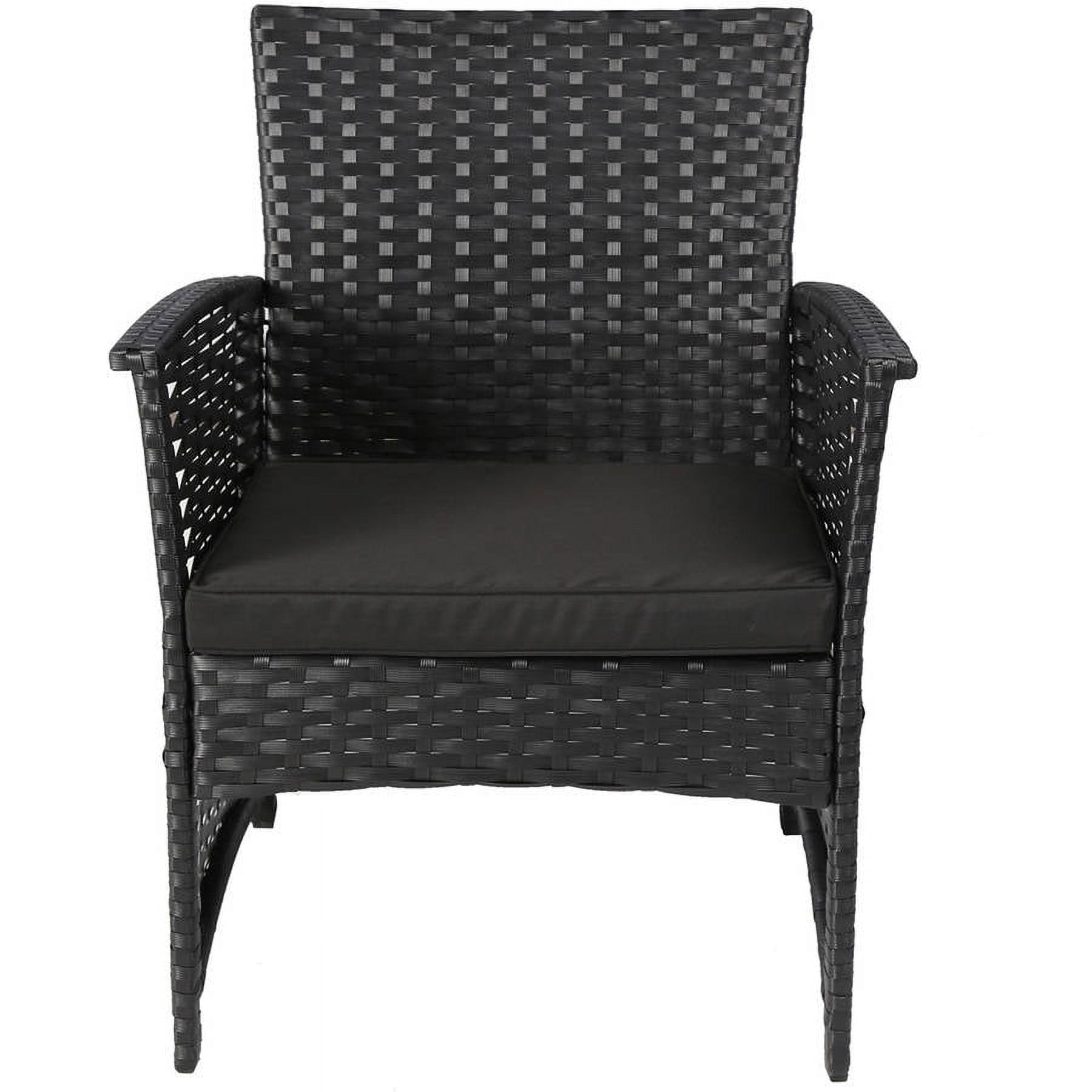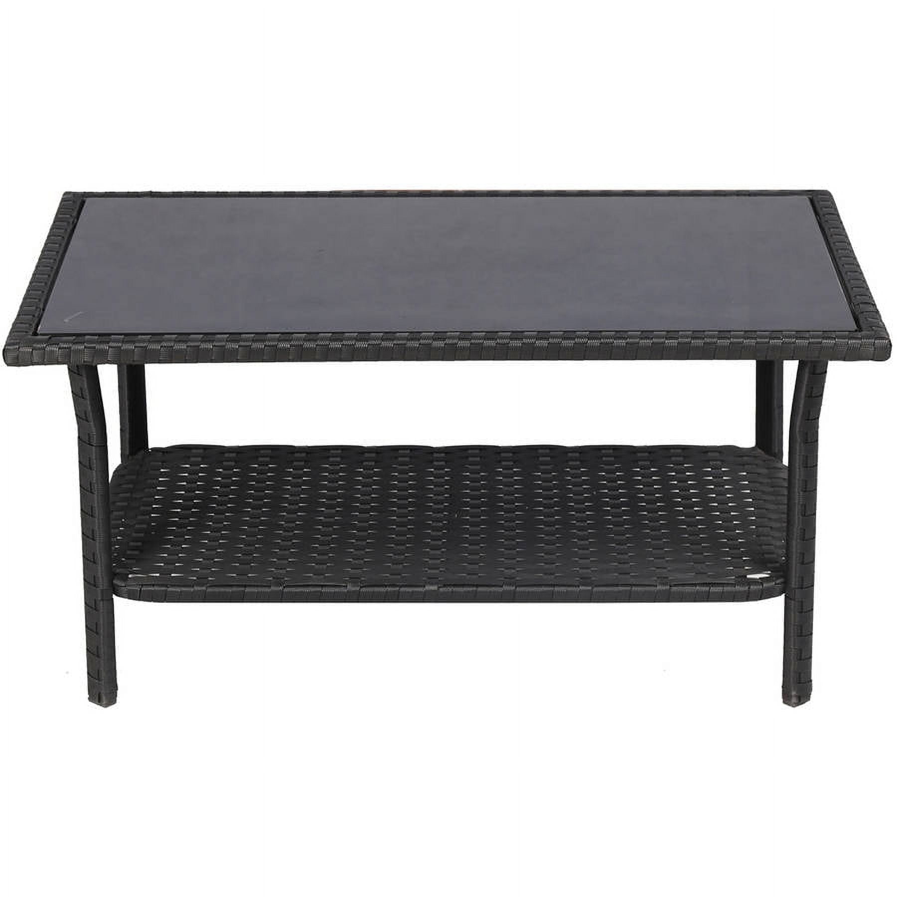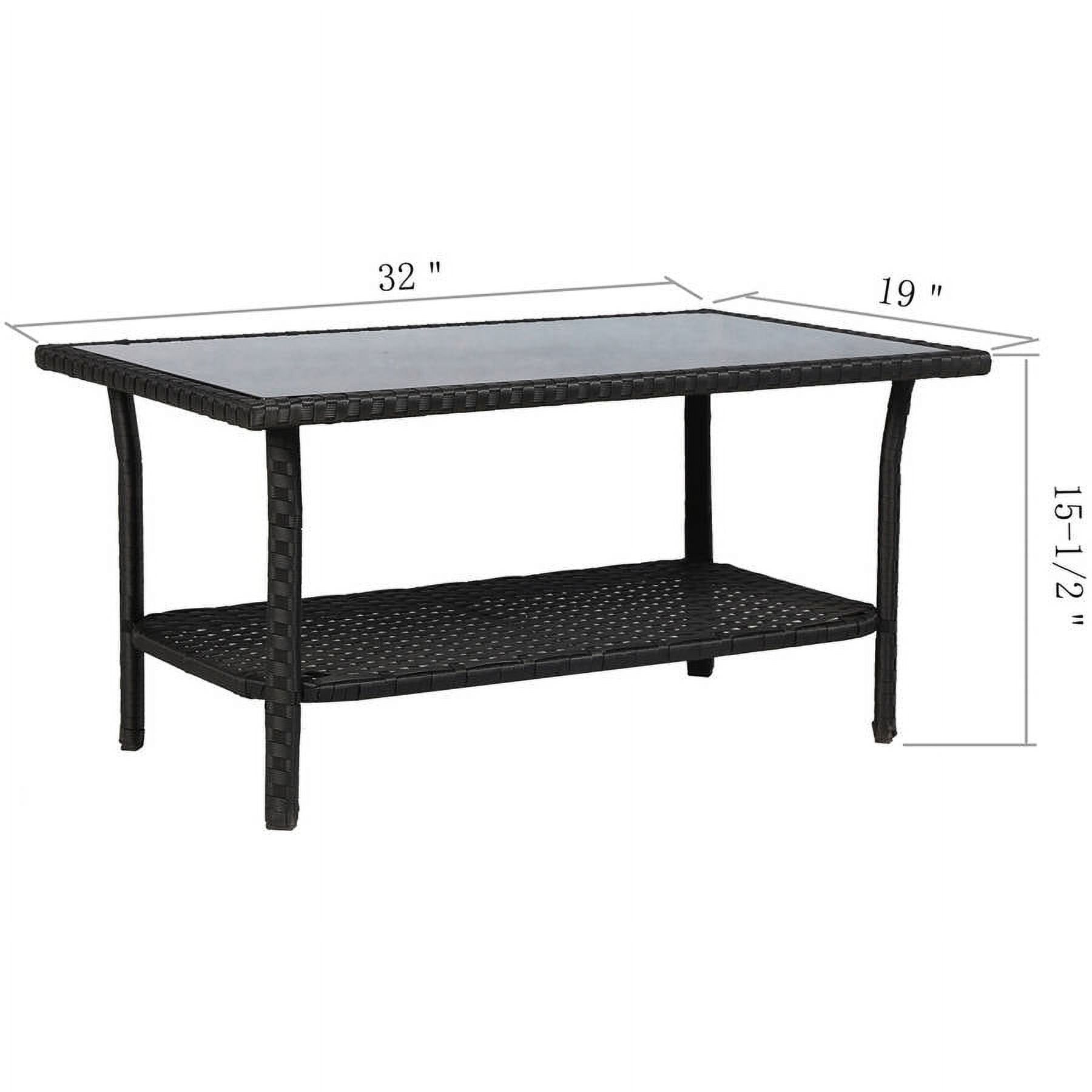 Baner Garden 4-Piece Outdoor Furniture Complete Set, Black: Complete outdoor patio set with tailored cushions Low-maintenance weather-resistant resin wicker and powder-coated steel frame 2 double sofas (46″ x 26″ x 30-3/8″) Single sofa (24-3/4″ x 26″ x 30-3/8″) Coffee table (31-7/8″ x 18-7/8″ x 15-3/4″) Weight capacity: 350 lbs