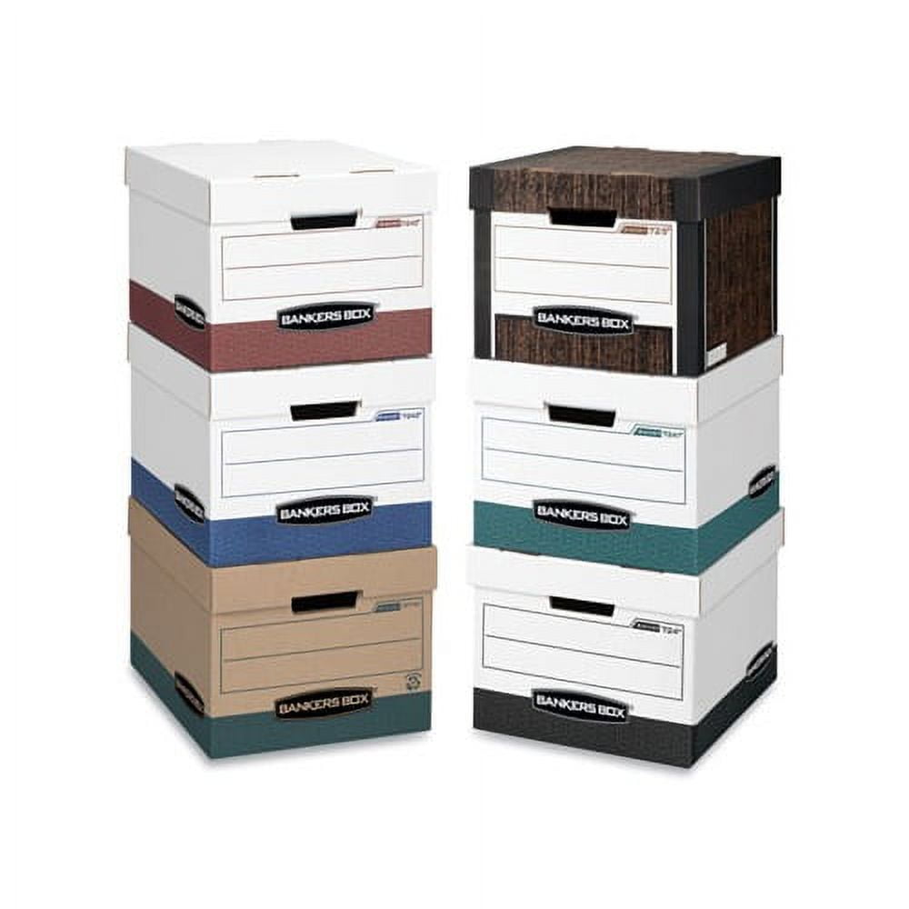 Bankers Box Recycled Stor/File Box has double-end, single-side construction. Medium-duty for use with or without shelving. FastFold quick and easy assembly. Deep, locking, lift-off lid stays in place for secure file storage. Perfect for storing important home or office papers and other items that you need to keep organized for future use. Made from recycled corrugated cardboard. Perfect for use in the office, home office, school, or wherever you need to store important papers, documents or important items.