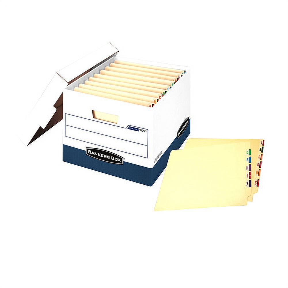 Product Type – File Boxes-File Storage Boxes Box Type – Stackable File Storage Box Style – FastFold Quick & Easy Assembly Strength – Heavy-Duty File Size Format – Letter/Legal Inner Width – 12.75″ Inner Depth – 15″ Inner Height – 10″ Closure – Lift-Off Lid Fastener Style – Tab Lock Materials – 2-Ply Cardboard Bottom Colors – White/Blue Color Family – Multicolor Stacking Strength – 850 lb Handle – Side Hand Holes Number Of Bins – 1 Package Includes – 12 Lids Pre-consumer Recycled Content Percent – 10% Post-consumer Recycled Content Percent – 50% Total Recycled Content Percent – 60% Footnote 1 – Stacking Strength is the amount of evenly distributed weight lbs. that can be safely stacked on top of a box Package includes – 12 Lids