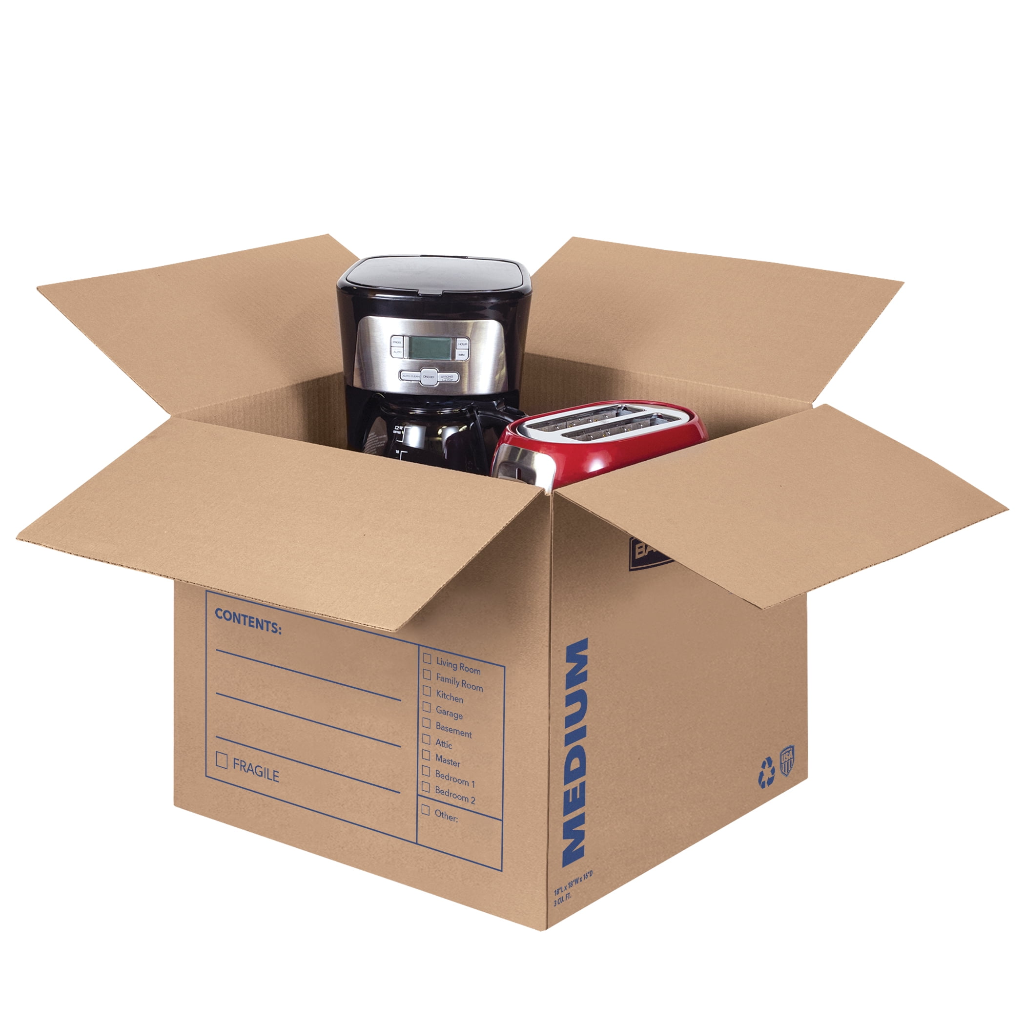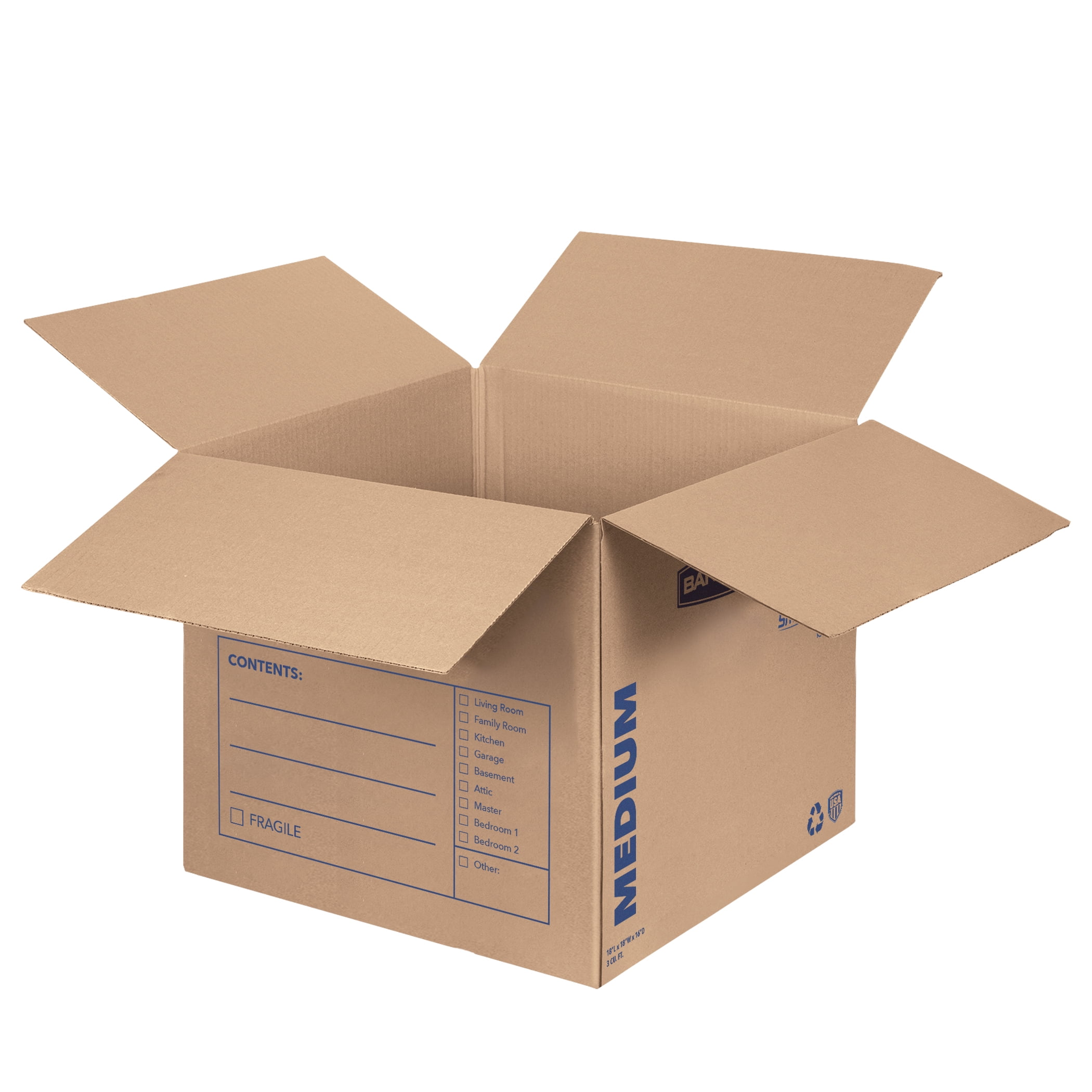 Bankers Box Smooth Move Moving Boxes are designed to hold mid-weight items such as toys, kitchen appliances, clothing and shoes. Constructed of strong 32 ECT C-Flute corrugated cardboard, they are thicker and more durable for lasting performance. The medium-sized storage and moving boxes come in a convenient 10 pack. Each one displays a pre-printed, ruled area, which makes labeling simple and provides a space for the shipping and return addresses. The earth-friendly corrugated moving boxes are 85 percent recyclable and reusable. They are quick and easy to assemble using your preference of packing tape. Using strong containers will keep your precious belongings protected during the transition from one location to the next.