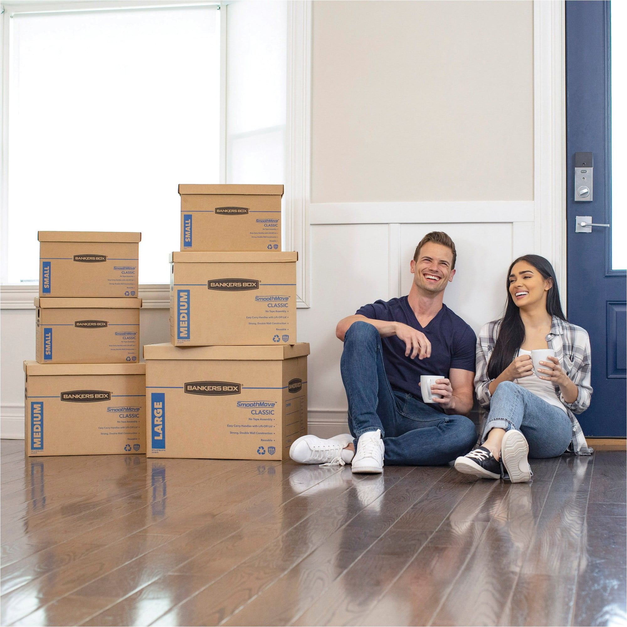 Fast assembly—no tape required. Convenient lid locks into place for secure closure. Strong, durable handles for comfortable moving and lifting. Durable double end, double bottom construction. Easy to break down and store flat until ready to reuse. Recyclable.