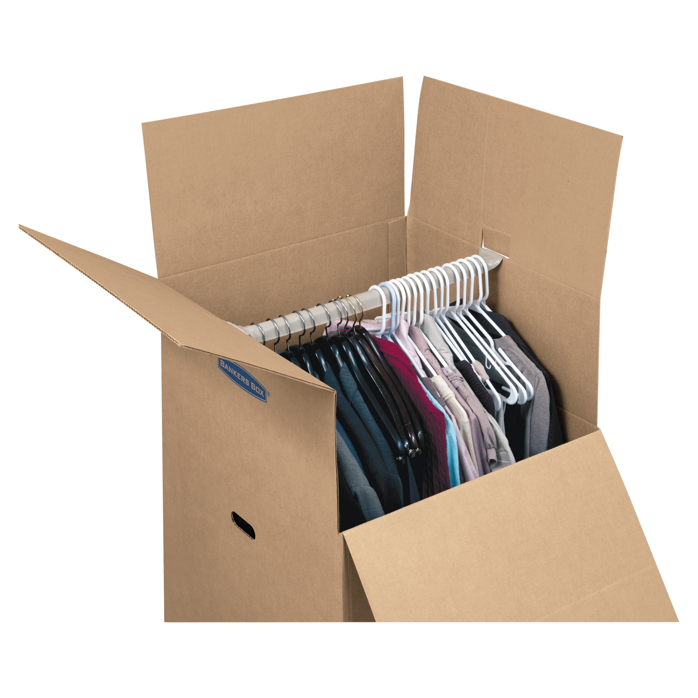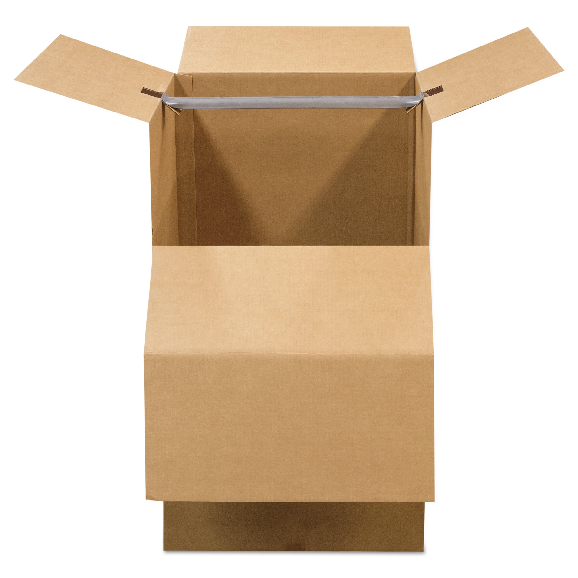 Designed to specifically store and move hanging items. Includes 24†bar to accommodate up to 2 linear feet of items. Complete closure to keep articles clean. Strong, durable handles for moving and lifting. Perfect for moving and storing clothing and other important items while you move. Tape required for assembly. Reusable, recyclable and .
