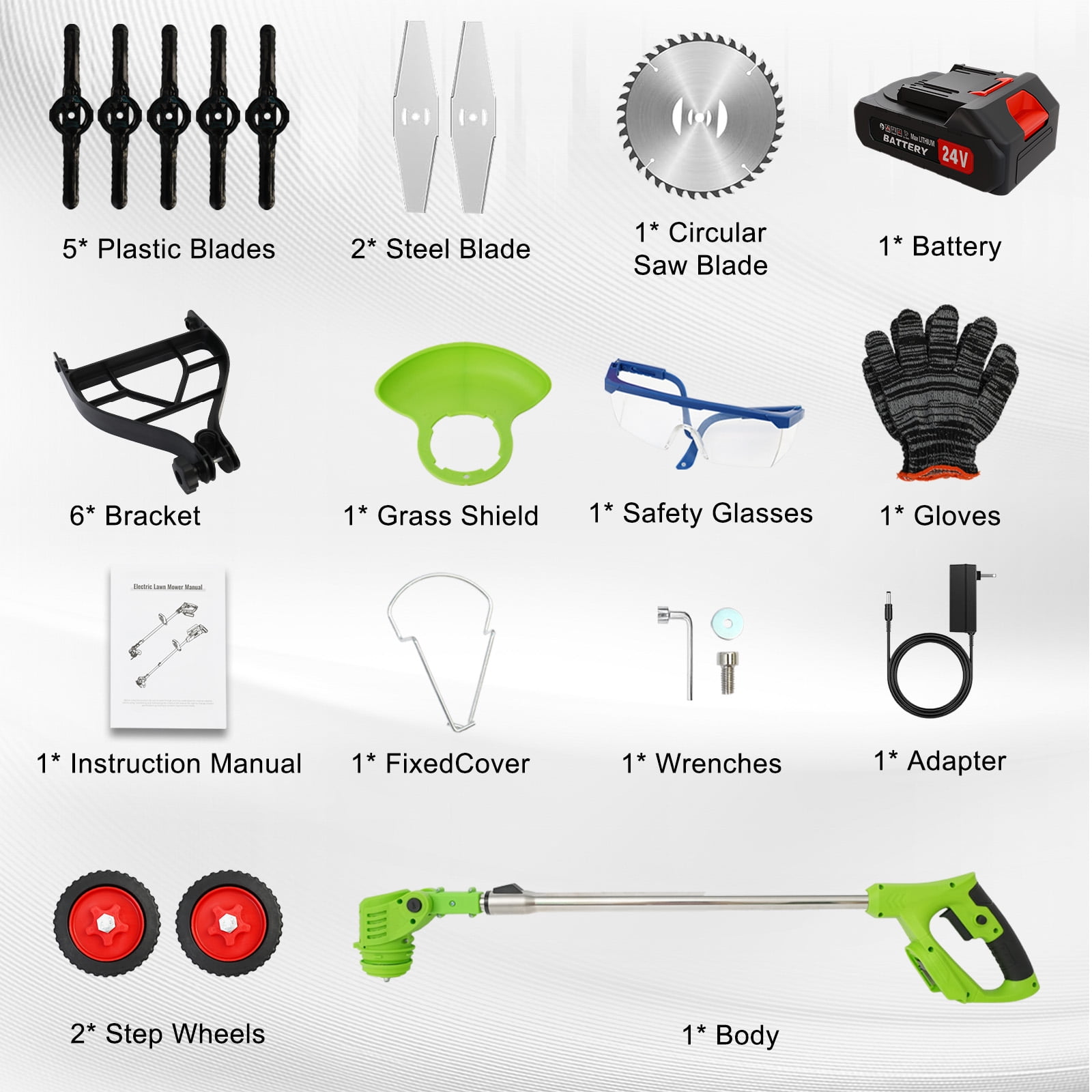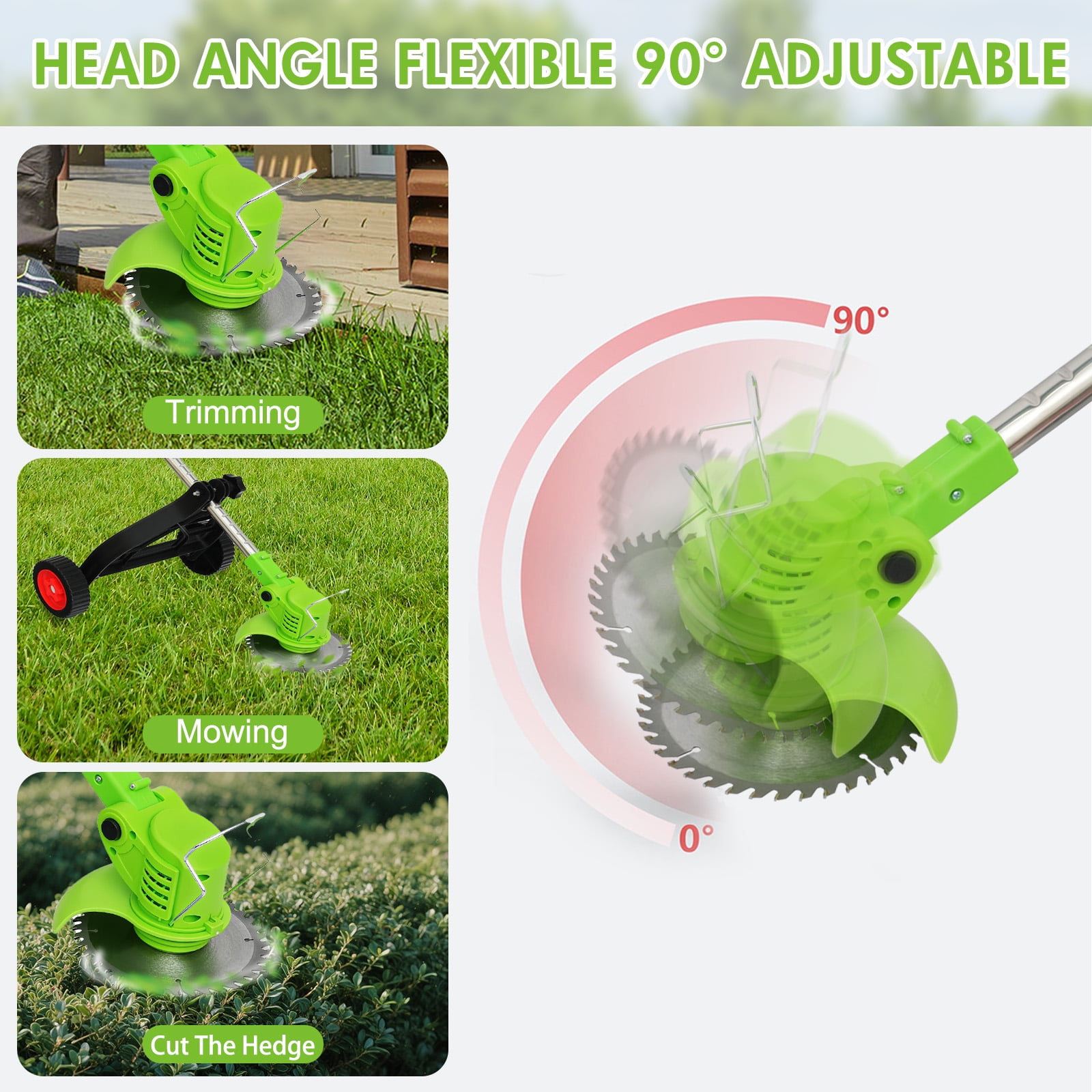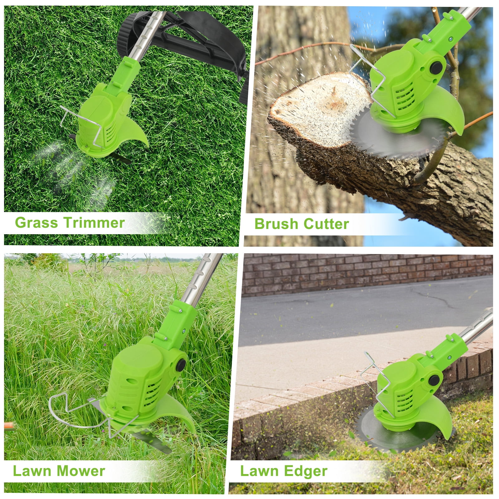 ????About Item: 【Lightweight and Powerful, Grass Worry-free】On the journey of lawn trimming, let our cordless electric grass trimmer be your powerful assistant.No longer constrained by wires, no longer worried about motor burnout, our product brings a new grass trimming experience with its powerful performance and lightweight design. 【Powerful Functionality】Utilizing a durable and reliable cordless grass trimmer motor with a 18000 RPM no-load speed, it effortlessly tackles various lawn conditions. 【Lightweight and Convenient】Weighing only 3.6 pounds and equipped with a lightweight portable charger, grass trimming work is no longer tedious.Even women and the elderly can easily handle it and enjoy the pleasure of grass trimming. 【Efficient Battery】Equipped with an 650W high-power motor, 8500 RPM, and two rechargeable 2000mAh high-capacity 24V batteries, it completes grass trimming tasks at once.With 10% higher grass trimming capacity than other products, it’s safer and more durable. 【Multi-functional Design】A 3-IN-1 lawn trimming tool that not only acts as a lawn trimmer but also effortlessly converts into a wheeled lawn trimmer and sidewalk trimmer.With a full 90° rotating head and adjustable telescopic shaft, you can easily trim even in narrow spaces, enjoying a comfortable experience. 【Multiple Blades】Equipped with 6-inch saw blades, stainless steel blades, and plastic blades, suitable for different lawn conditions, allowing you to quickly and efficiently complete trimming tasks. 【Version Upgrade】The new version features a step-type brush cutter with side cutting blades, making it more effective in handling tender grass, avoiding motor entanglement, and extending its lifespan. 【Safe and Practical】Featuring a protective ring design, it protects plants and landscapes, avoiding contact with hard objects, ensuring a stable and efficient trimming experience. 【Ergonomic Design】With a small push design that conforms to ergonomics, it provides a comfortable and balanced operating experience, allowing easy control and movement in the garden, achieving quick and efficient grass trimming. ????Specification: Type: Lithium Battery Grass Trimmer Power Input: 24V No-load Speed: 18000 RPM Working Speed: 8500 RPM Battery Type: 2000mAh Lithium Battery Charging Time: 2 hours per battery Dimensions: 45 x 5.9 x 5.9 inches / 114 x 15 x 15 cm Assembly Required: Yes ????Package Contents: Machine * 1 Lithium Battery * 1 (2000mAh 5C) Charger * 1 Socket Wrench * 1 Saw Blade * 1 Stainless Steel Blade * 2 Plastic Blade * 5 Safety Goggles * 1 Protective Gloves * 1 Instruction Manual * 1