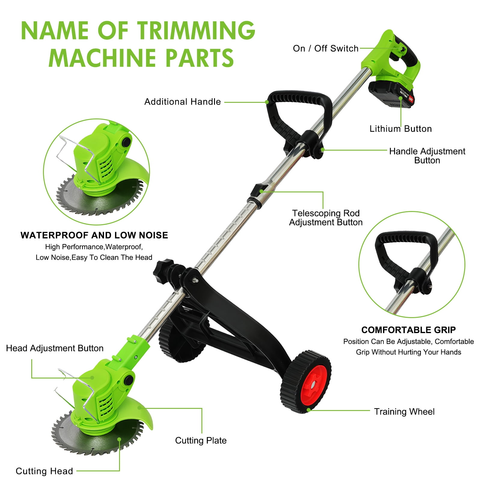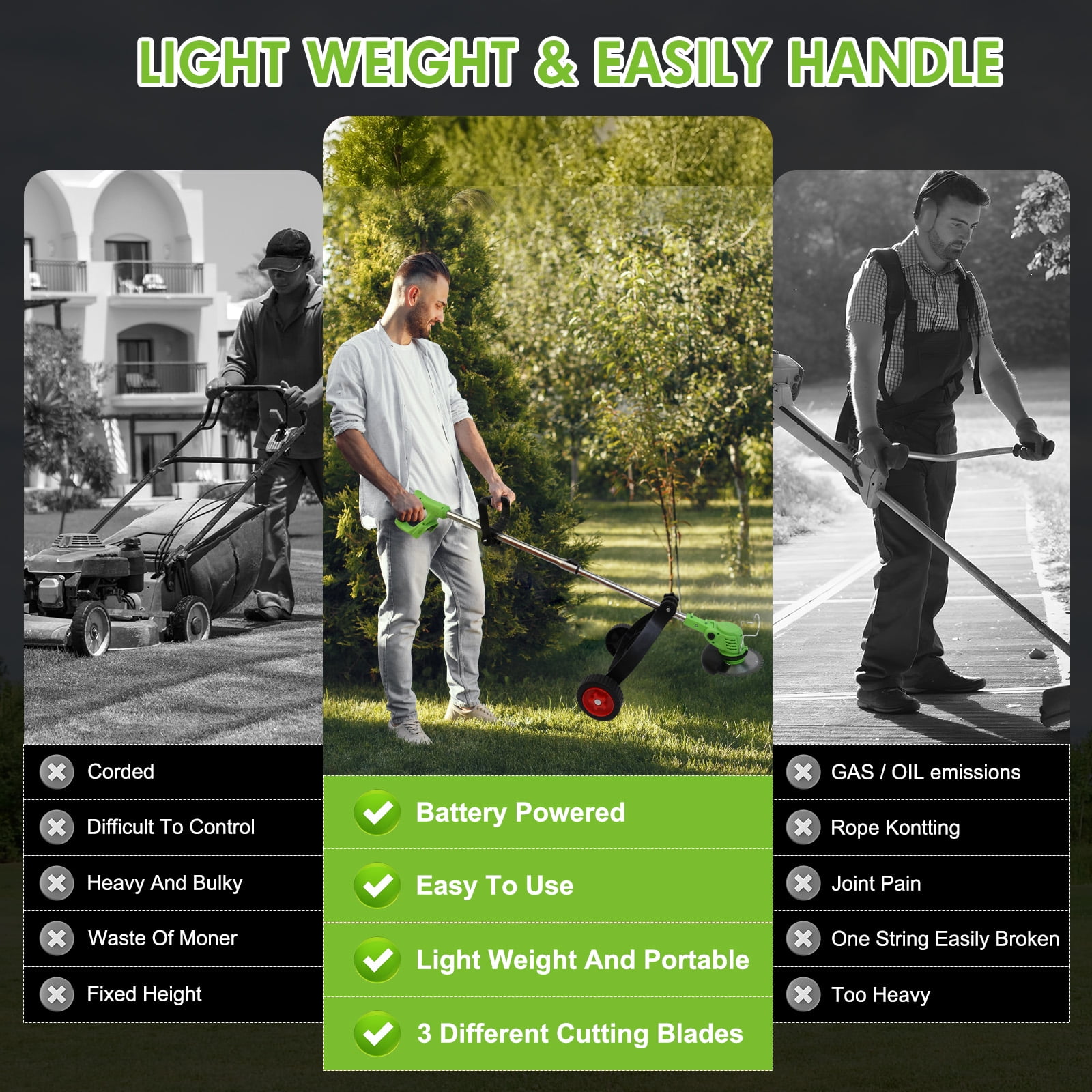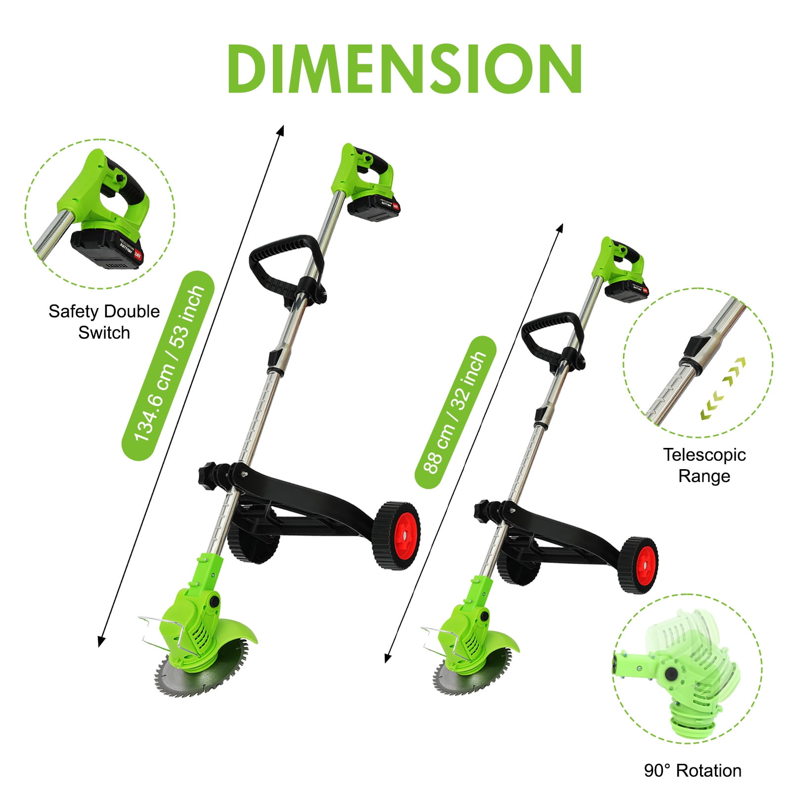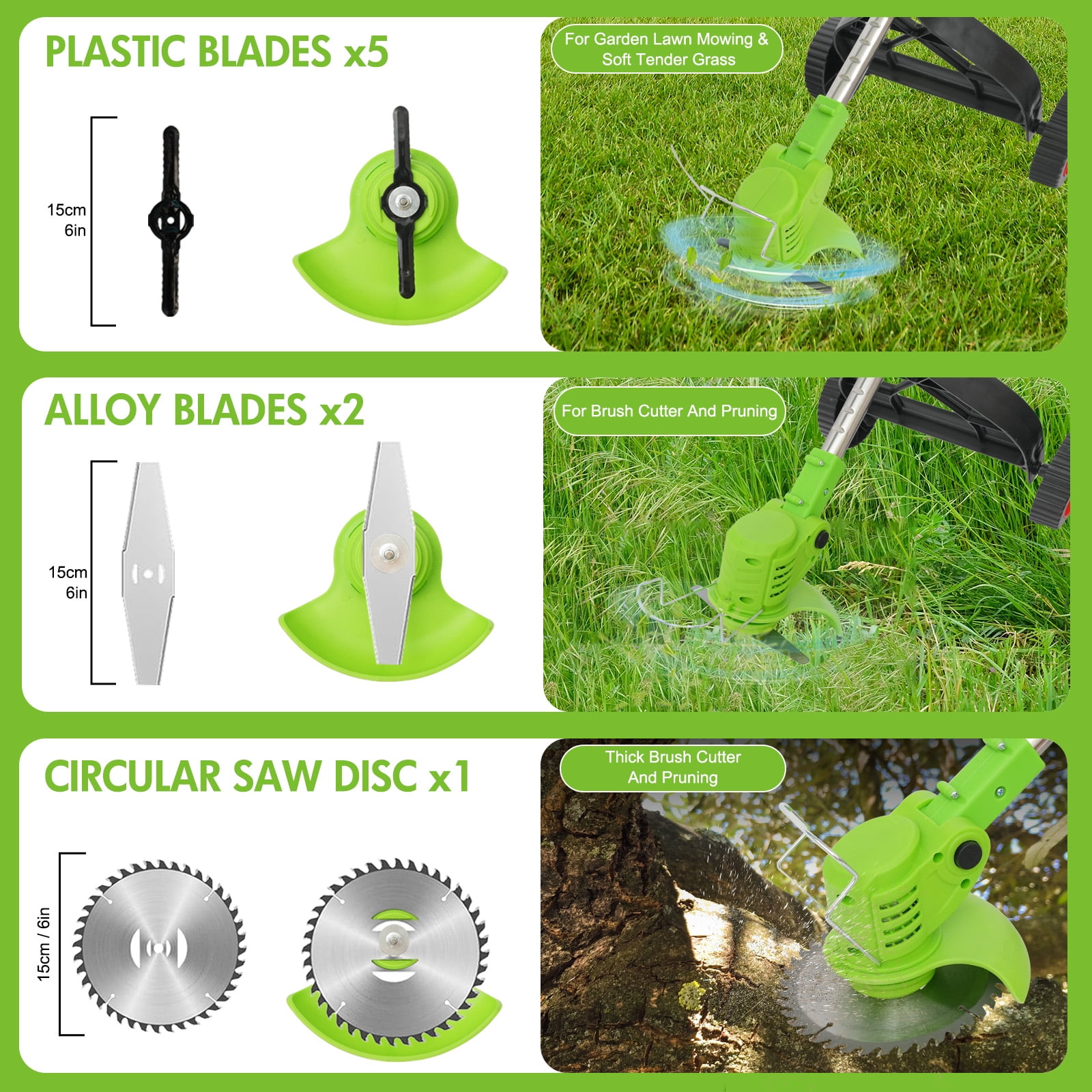 ????About Item: 【Lightweight and Powerful, Grass Worry-free】On the journey of lawn trimming, let our cordless electric grass trimmer be your powerful assistant.No longer constrained by wires, no longer worried about motor burnout, our product brings a new grass trimming experience with its powerful performance and lightweight design. 【Powerful Functionality】Utilizing a durable and reliable cordless grass trimmer motor with a 18000 RPM no-load speed, it effortlessly tackles various lawn conditions. 【Lightweight and Convenient】Weighing only 3.6 pounds and equipped with a lightweight portable charger, grass trimming work is no longer tedious.Even women and the elderly can easily handle it and enjoy the pleasure of grass trimming. 【Efficient Battery】Equipped with an 650W high-power motor, 8500 RPM, and two rechargeable 2000mAh high-capacity 24V batteries, it completes grass trimming tasks at once.With 10% higher grass trimming capacity than other products, it’s safer and more durable. 【Multi-functional Design】A 3-IN-1 lawn trimming tool that not only acts as a lawn trimmer but also effortlessly converts into a wheeled lawn trimmer and sidewalk trimmer.With a full 90° rotating head and adjustable telescopic shaft, you can easily trim even in narrow spaces, enjoying a comfortable experience. 【Multiple Blades】Equipped with 6-inch saw blades, stainless steel blades, and plastic blades, suitable for different lawn conditions, allowing you to quickly and efficiently complete trimming tasks. 【Version Upgrade】The new version features a step-type brush cutter with side cutting blades, making it more effective in handling tender grass, avoiding motor entanglement, and extending its lifespan. 【Safe and Practical】Featuring a protective ring design, it protects plants and landscapes, avoiding contact with hard objects, ensuring a stable and efficient trimming experience. 【Ergonomic Design】With a small push design that conforms to ergonomics, it provides a comfortable and balanced operating experience, allowing easy control and movement in the garden, achieving quick and efficient grass trimming. ????Specification: Type: Lithium Battery Grass Trimmer Power Input: 24V No-load Speed: 18000 RPM Working Speed: 8500 RPM Battery Type: 2000mAh Lithium Battery Charging Time: 2 hours per battery Dimensions: 45 x 5.9 x 5.9 inches / 114 x 15 x 15 cm Assembly Required: Yes ????Package Contents: Machine * 1 Lithium Battery * 1 (2000mAh 5C) Charger * 1 Socket Wrench * 1 Saw Blade * 1 Stainless Steel Blade * 2 Plastic Blade * 5 Safety Goggles * 1 Protective Gloves * 1 Instruction Manual * 1