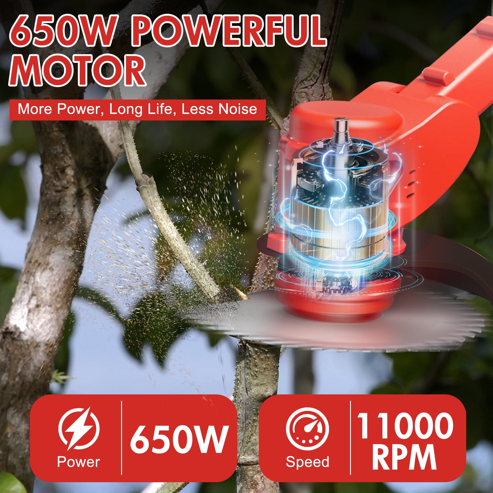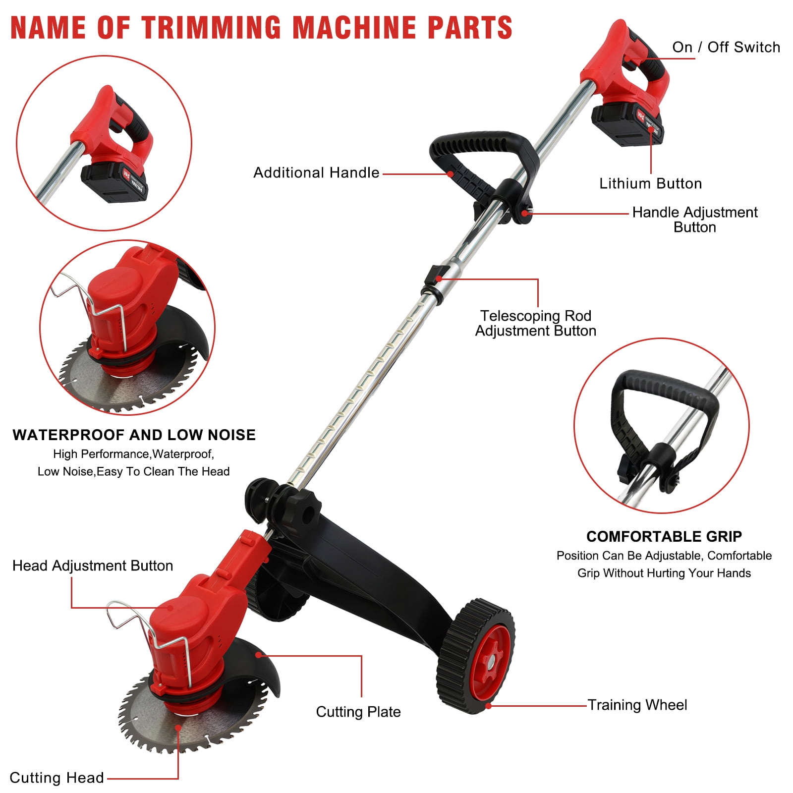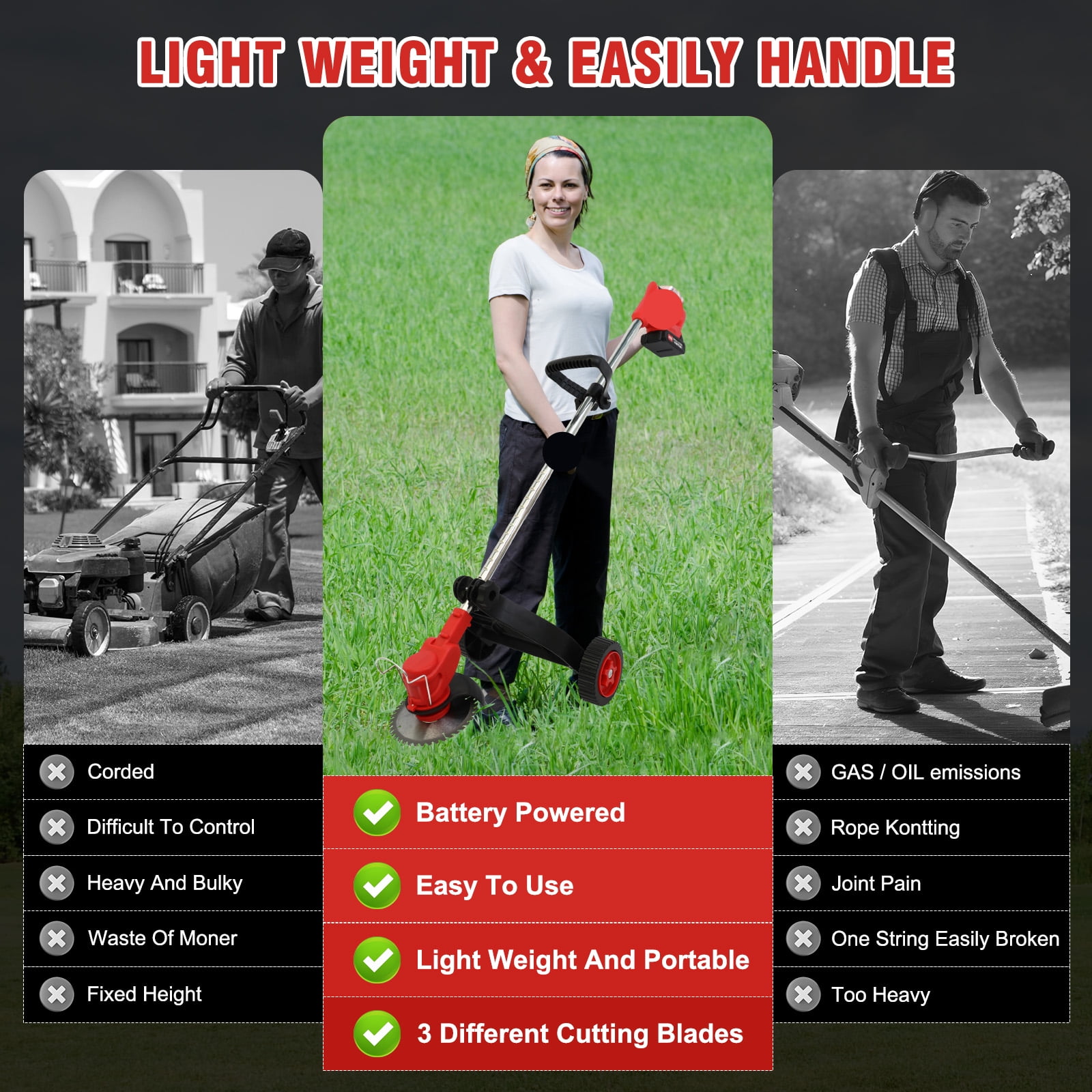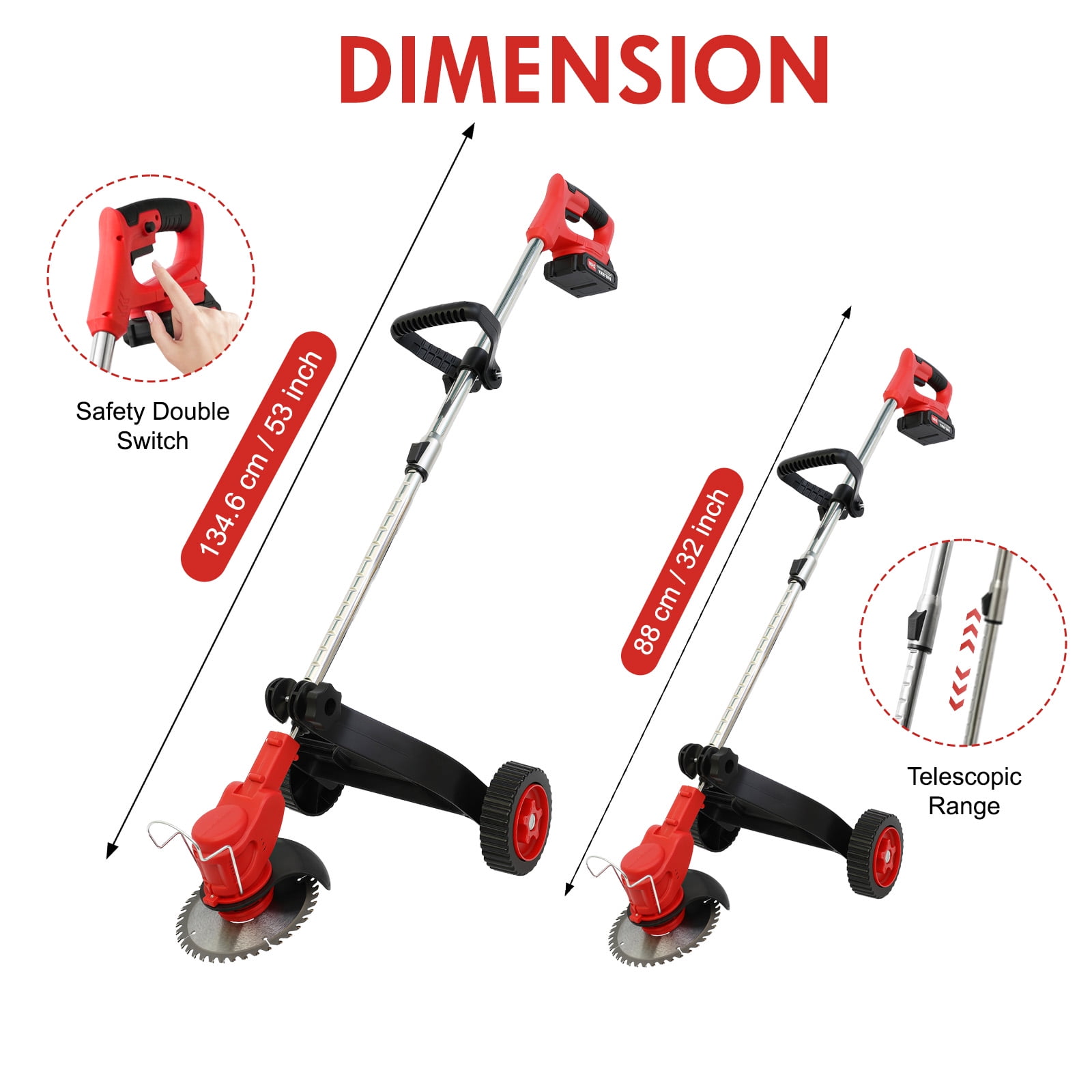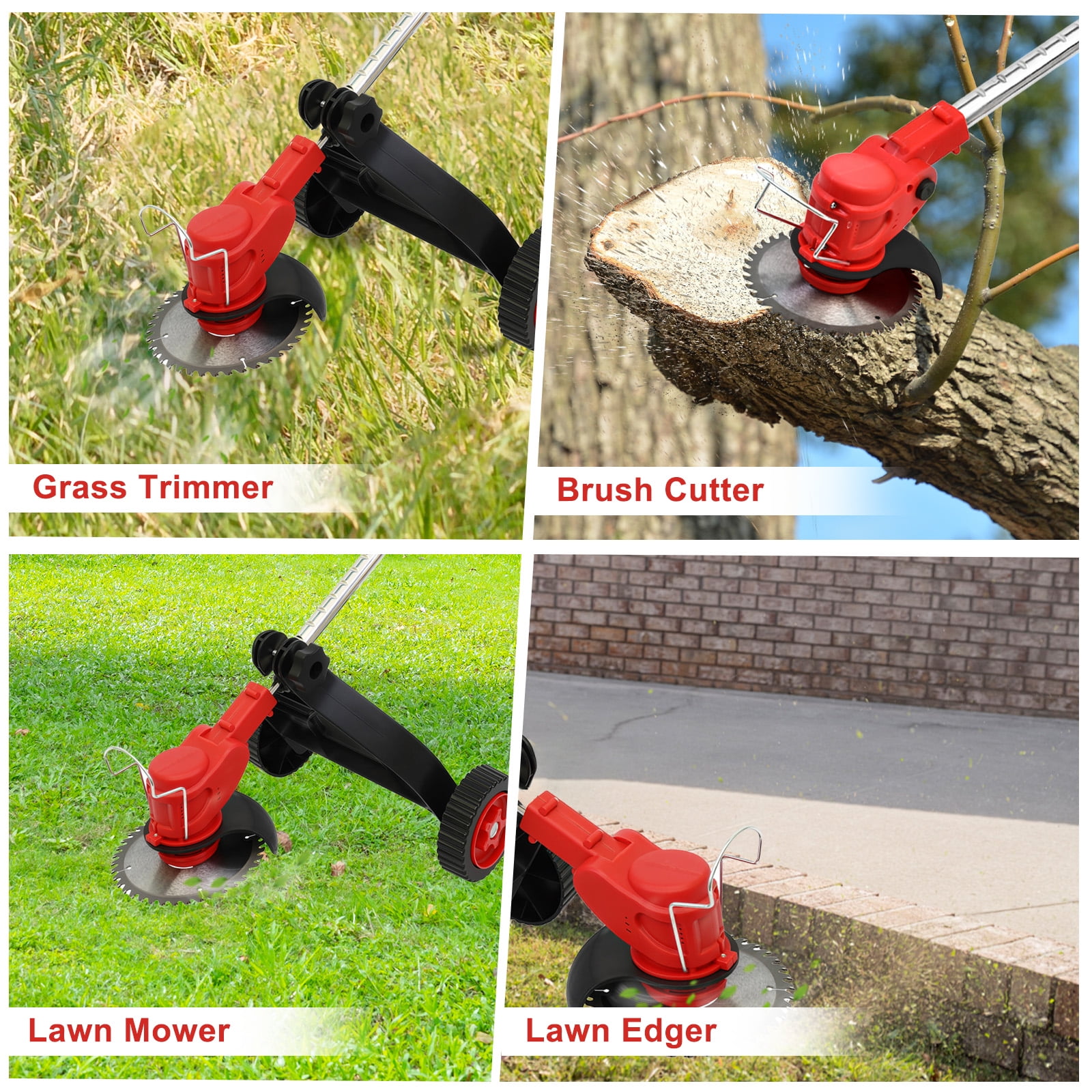 ????About Item: 【High Power and High Efficiency】This lawn mower is equipped with a high-power motor, which can easily cope with a variety of grass types, whether it is a dense lawn or a messy weed, it can be cut in a short time.The efficient motor drive makes the mower more stable during operation, reducing the possibility of jamming and malfunctions, so that your mowing work is twice as effective with half the effort. 【Portable Cordless Design】Say goodbye to cumbersome wire bondage, this lawn mower adopts a cordless design, allowing you to mow the grass as you want in the yard without being limited by wires.The built-in large-capacity lithium battery is durable, allowing you to maintain high efficiency and stability even during long mowing operations. 【Telescopic Handle and Adjustable Wheel】The height of the telescopic rod can be adjusted freely according to your needs.Therefore, it provides maximum safety regardless of the size of the body and works in a comfortable position to reduce the pressure on the lower back.At the same time, the lawn mower is also equipped with adjustable wheels, which can easily cope with flat grass or undulating small slopes, making your mowing experience smoother. 【Safety Design】This weeder has double switches, double safety controls, and comes with a protective cover to prevent debris from splashing, while the safety lock design can ensure your safety. 【Low Noise Design】This lawn mower adopts a low noise design, which has very low noise during operation, allowing you to maintain a quiet courtyard environment while enjoying the fun of mowing.Whether it’s early morning or late afternoon, you can enjoy mowing the grass in tranquility. 【3 kinds of lawn mower blade integrated design】The lawn mower innovatively adopts the integrated design of 3 kinds of lawn mower blades, whether it is fine trimming or rough cutting, it can easily deal with it.The plastic blade is suitable for mowing on soft lawns;The stainless steel metal blade is suitable for pruning weeds and small shrubs, and the 40-tooth alloy blade is ideal for cutting coarse shrubs, twigs and seedlings.(Please choose the correct blade when weeding to avoid damaging the blade.) ????Specification: Type: Weeder Material: Aluminum + plastic Color: Red Plug: American plug Power input :24V Battery: Lithium battery, 24V Power :650W Number of batteries :1 5C2000 battery No-load speed (without tool):21000r/min Charging time: about 2h Dimensions :45×5.9×5.9 inches /114*15*15CM Assembly required: Yes ????Package Contents: 1x Weeder 1x 24V rechargeable lithium-ion battery 1x Charger 1x 6″ saw blade 1x side-cutting blade 2 metal blades 5x plastic blades 1x wheels 2 rotary wrenches 1 pair of non-slip gloves 1 pair of safety glasses 1x User Manual ????Note: When you use the electric weeder brush trimmer for the first time, please fully charge the battery. Charge before use for longer life. Uninstall the battery immediately after use to keep the power off. Please pay attention to safety when using, wear protective measures, stay away from crowds and bodies, and avoid being cut by blades. It is forbidden to replace the blade in the energized state!
