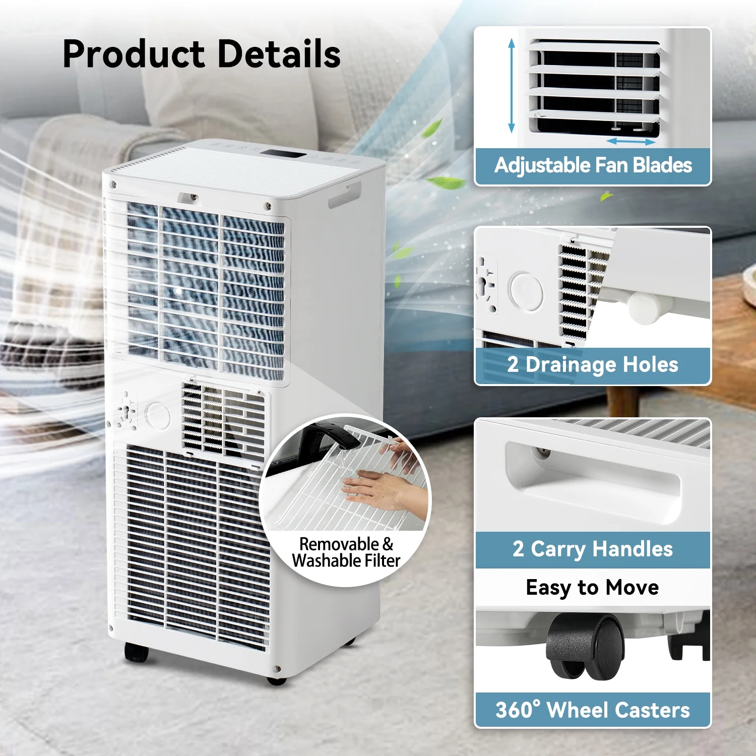 Smart WiFi Control & Portability Control your AC via Smart Life APP (WiFi), remote, or touch panel. Features 360° wheels & built-in handles for easy mobility between rooms. Powerful 10,000 BTU Cooling Covers 300 sq.ft. with fast cooling (61°F-90°F range). Maintains comfort even in extreme heat. 4-in-1 All-Season Functionality Switch between cooling, dehumidifier, fan, and sleep modes for year-round climate control. Ideal for homes, offices, or dorms. Ultra-Quiet ≤55dB Operation Sleep mode reduces noise for nighttime use. Includes 24H timer & child lock for safety and convenience. Easy Setup & Low Maintenance Includes adjustable window kit (quick installation). Features a washable filter & dual drainage for minimal upkeep.