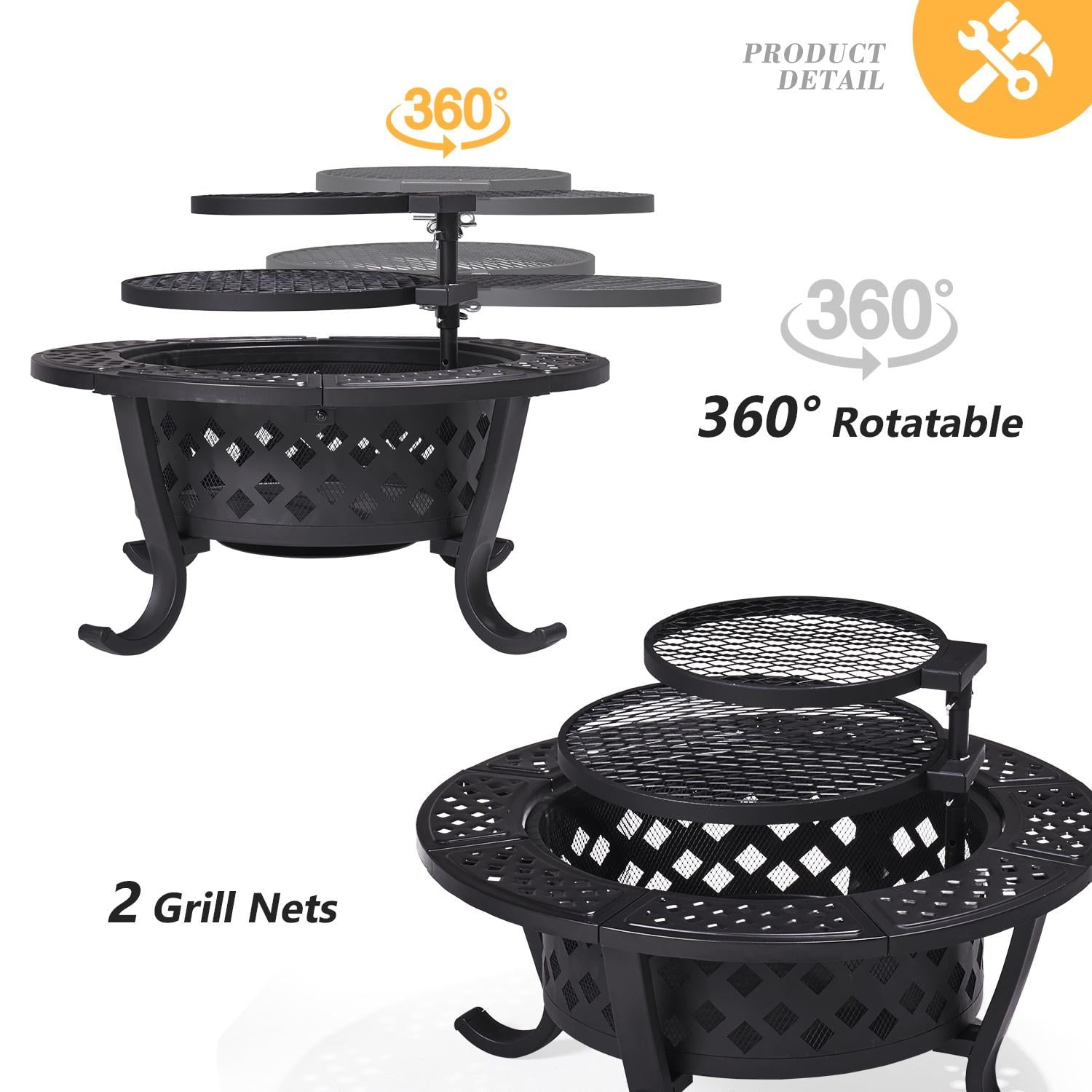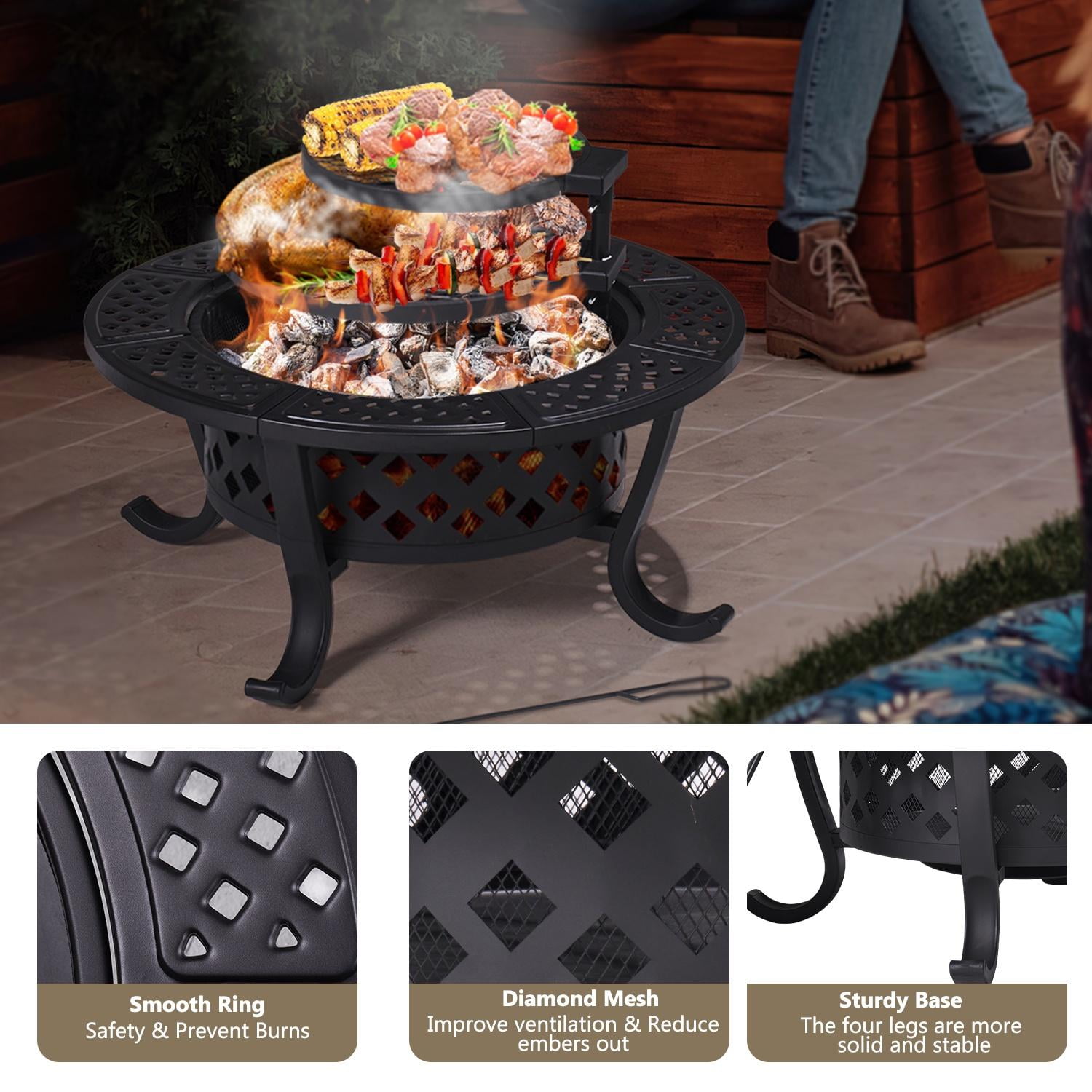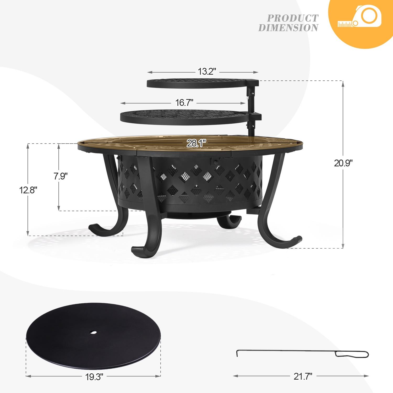 Key Feature [Alloy steel structure with heat-resistant coating] This outdoor fire pit is constructed of heavy metal and coated with a heat-resistant coating to withstand temperatures from 400°C/752°F to 600°C /1112°F. Its base is reinforced with four support feet and a metal ring for additional stability. [Uniform diamond pattern] The 28″ round fire pit is evenly distributed around the diamond pattern, and the interior has a denser lining grid to prevent the drop of charcoal and sparks to ensure safety. [Rotating and adjustable grille] The fire pit features two rotating detachable circular grates measuring 16.7″ and 13.2″. It can be rotated 360 degrees and can be easily used even by people with little strength. It’s perfect for preparing grills and lighting fires for year-round events. [Dimension] The stove is 7.9″ deep, the fire poker is 21.7″ long, and the lid is 19.3″. The grille is 8.1″ high. [Note] We use high-quality steel, but to reduce ash, we recommend using baking foil. For your safety, please use this fire pit outside on non-combustible surfaces such as cement floors, rocks, or sand. Specifications Color: black Material: iron Overall dimensions: 28.1″ x 20.9” (DxH) Fire bowl opening size: 19.1” Fire bowl depth: 7.9” Cooking grate diameter: 16.7”&13.2” n/a n/a