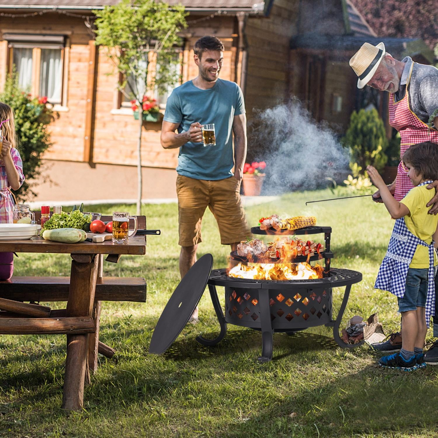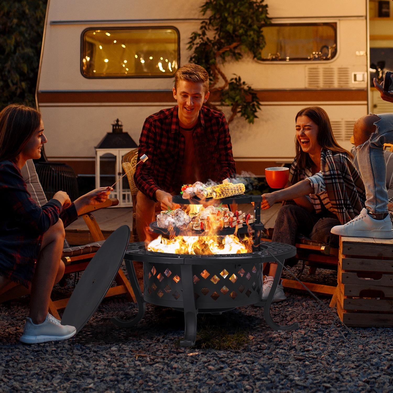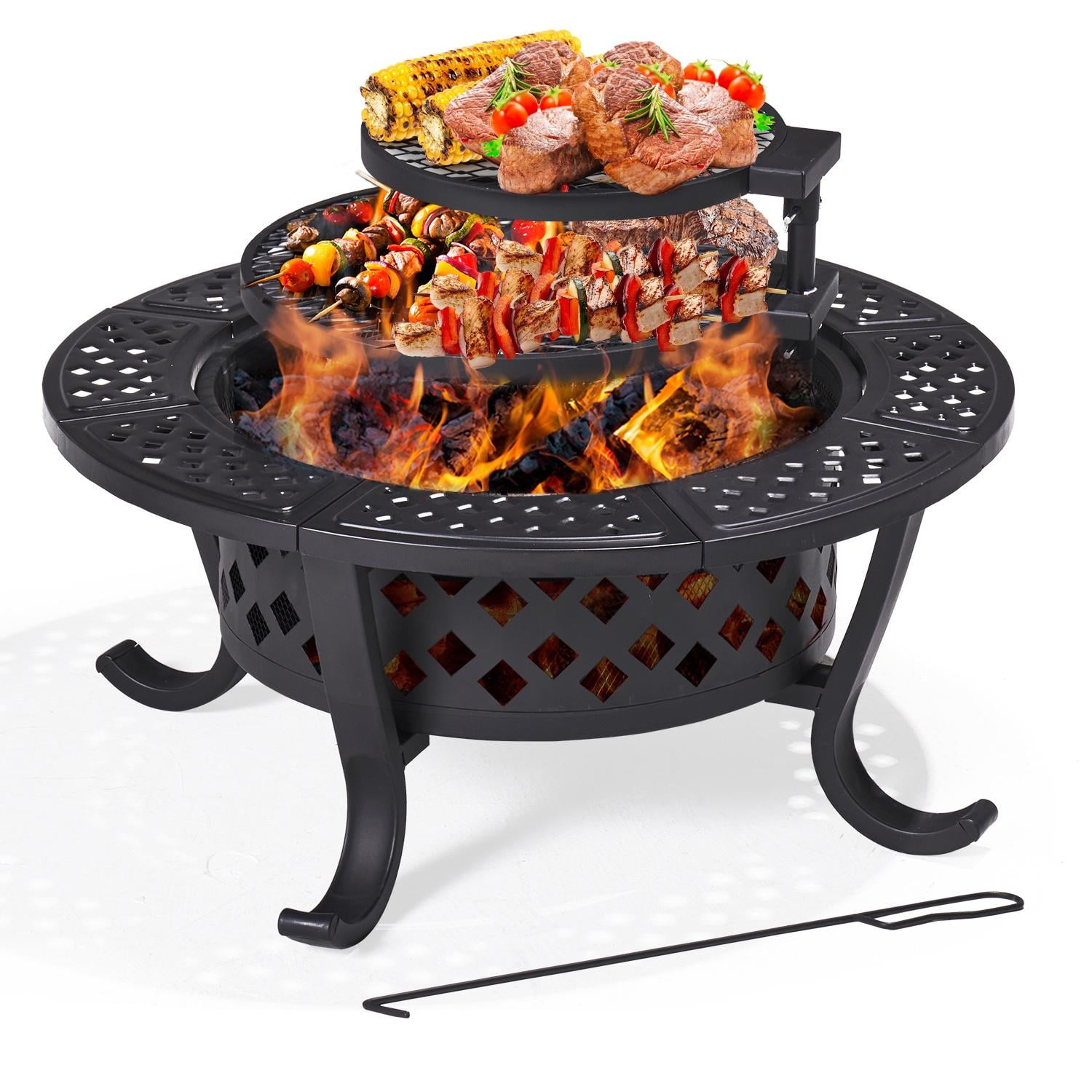 Key Feature [Alloy steel structure with heat-resistant coating] This outdoor fire pit is constructed of heavy metal and coated with a heat-resistant coating to withstand temperatures from 400°C/752°F to 600°C /1112°F. Its base is reinforced with four support feet and a metal ring for additional stability. [Uniform diamond pattern] The 28″ round fire pit is evenly distributed around the diamond pattern, and the interior has a denser lining grid to prevent the drop of charcoal and sparks to ensure safety. [Rotating and adjustable grille] The fire pit features two rotating detachable circular grates measuring 16.7″ and 13.2″. It can be rotated 360 degrees and can be easily used even by people with little strength. It’s perfect for preparing grills and lighting fires for year-round events. [Dimension] The stove is 7.9″ deep, the fire poker is 21.7″ long, and the lid is 19.3″. The grille is 8.1″ high. [Note] We use high-quality steel, but to reduce ash, we recommend using baking foil. For your safety, please use this fire pit outside on non-combustible surfaces such as cement floors, rocks, or sand. Specifications Color: black Material: iron Overall dimensions: 28.1″ x 20.9” (DxH) Fire bowl opening size: 19.1” Fire bowl depth: 7.9” Cooking grate diameter: 16.7”&13.2” n/a n/a
