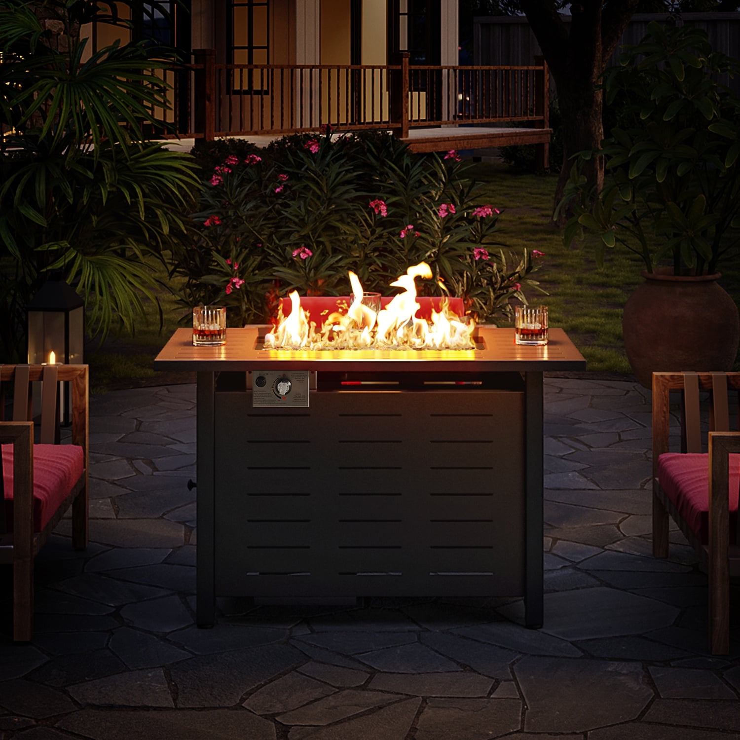 Durable Carbon Steel Material: Crafted from high-quality carbon steel, this fire pit table ensures exceptional durability and long-lasting performance. The robust material is designed to withstand outdoor elements, providing a reliable and sturdy centerpiece for your outdoor space. 50,000 BTUs of Heat: Equipped with a powerful burner capable of producing 50,000 BTU of heat, this outdoor fire pit table offers impressive warmth and comfort. Its high heat output is perfect for creating a cozy ambiance during cool evenings and enhancing your outdoor gatherings. Waterproof Lid and Storage Shelf: The patio fire pit table includes a waterproof lid that protects the burner when not in use, keeping it safe from the elements. Additionally, a convenient side storage shelf provides ample space for storing fire pit accessories, fire starters, or other essentials. 2 in 1 Versatile Table : Beyond its function as a fire pit, this product can be used as a wonderful table to put drinks and food on or decorative piece. Its versatile design allows it to seamlessly integrate into your outdoor setting, providing practical use and style. Waterproof Cover and After Sales: A waterproof cover is included to safeguard the fire pit table from rain, dust, and debris, ensuring it remains in excellent condition.The fire pit table comes with detailed instruction books. All necessary hardware and tools are also included. If you have any questions, please feel free to contact us. Specification: Modern and elegant design Electronic ignition devices Beautiful blue glass beads Two side hooks for easy using Waterproof PVC cover for easy storage Secure and spacious metal desktop Suitable for 20 lbs propane stove