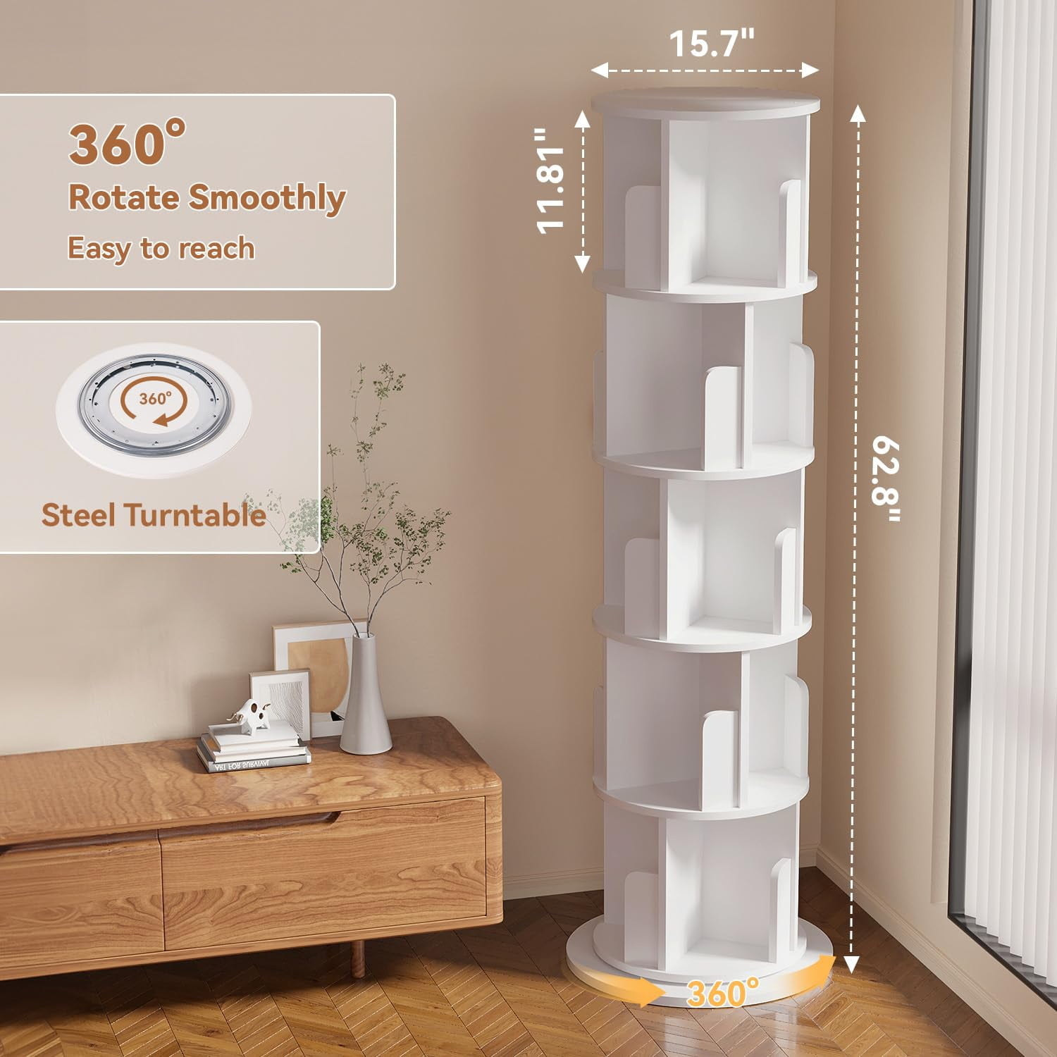 360-Degree Rotating Design: This bookshelf features a unique rotating mechanism that allows for easy access to all your books and decorations from every angle, making it both functional and stylish. 5-Tier Storage Capacity: With four spacious tiers, this bookshelf provides ample storage space for all your books, magazines, and decorative items, helping you keep your living space tidy and organized. Ideal for Small Spaces: Perfect for small apartments, dorm rooms, or any corner of your home, this compact and space-saving bookshelf maximizes vertical space, fitting seamlessly into even the tightest areas. Floor-Standing Bookcase: Designed to stand securely on the floor, this bookshelf offers stability and support for all your belongings, while also adding a touch of elegance to your bedroom or living room. Wooden Narrow Book Shelf Organizer: Crafted from high-quality wood, this narrow bookshelf combines durability with a sleek finish that complements any decor, making it an ideal choice for organizing your books and accessories in style.