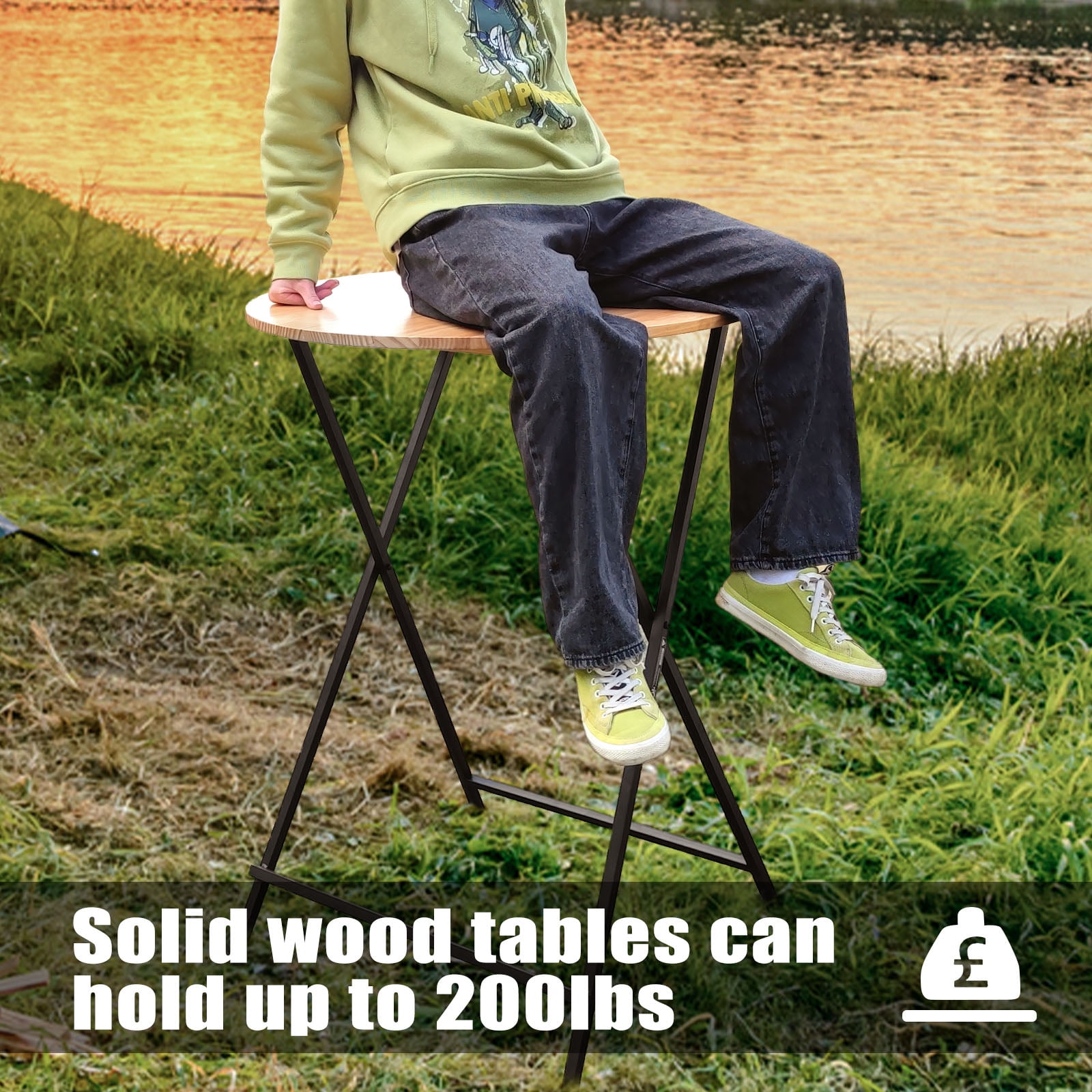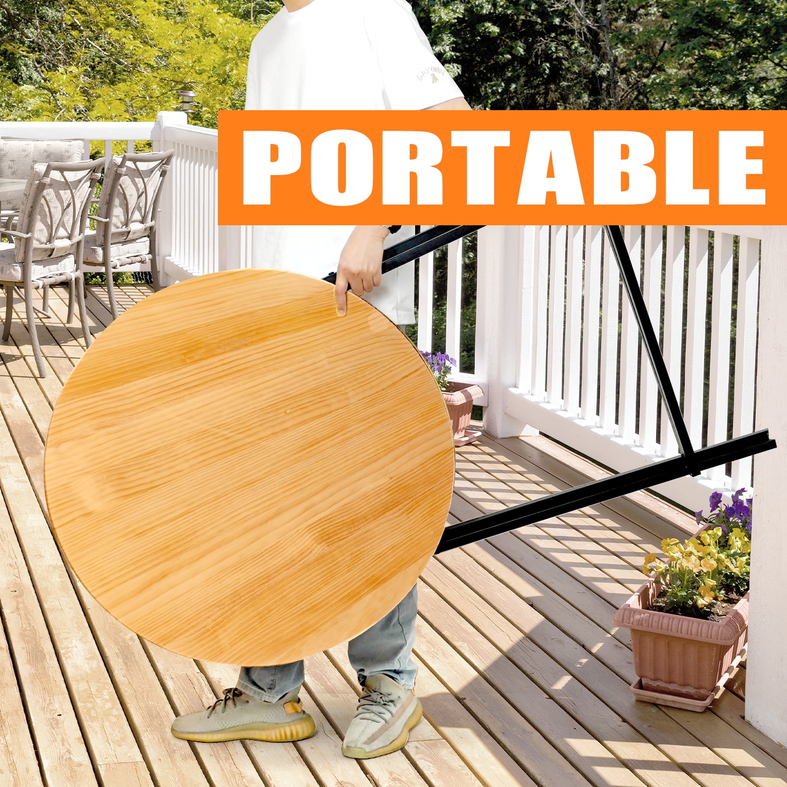 Dimensions: 31″(W) x 44.6 “(H) Material: Solid wood + metal Weight: 22 lbs Strengthen the metal frame and legs for increased durability. Rubber leg plugs enhance the grip of the floor surface and do not wear out the floor. The foldable design makes it perfect for carrying around, suitable for outdoor barbecues, outdoor activities, parties or gatherings. The 31-inch round table top is large enough to hold a variety of snacks or drinks and can be used together by four adults.