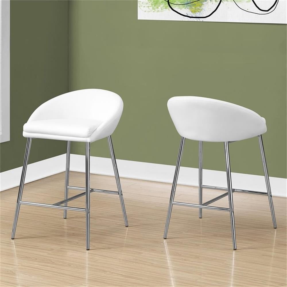 With simple lines and contemporary styling, this set of 2 counter height bar stools will transform your dining and entertainment area. The smooth and supple cushioned white leather-look seat with a low profile curved back gives a sleek modern look to a room. The sturdy chrome metal base with a convenient foot rest makes it easy and comfortable to hang around whether you are entertaining, jamming out a new tune with friends, or simply dining at the breakfast counter. This is the perfect seating for an open loft, condo, or small eat-in spaces. Features: Set of 2 counter height bar stools Upholstered in an easy to clean white leather-look fabric Sleek chrome metal legs with foot rest for stable support Modern design with thick cushioned low profile back Easy to assemble, no special tools required