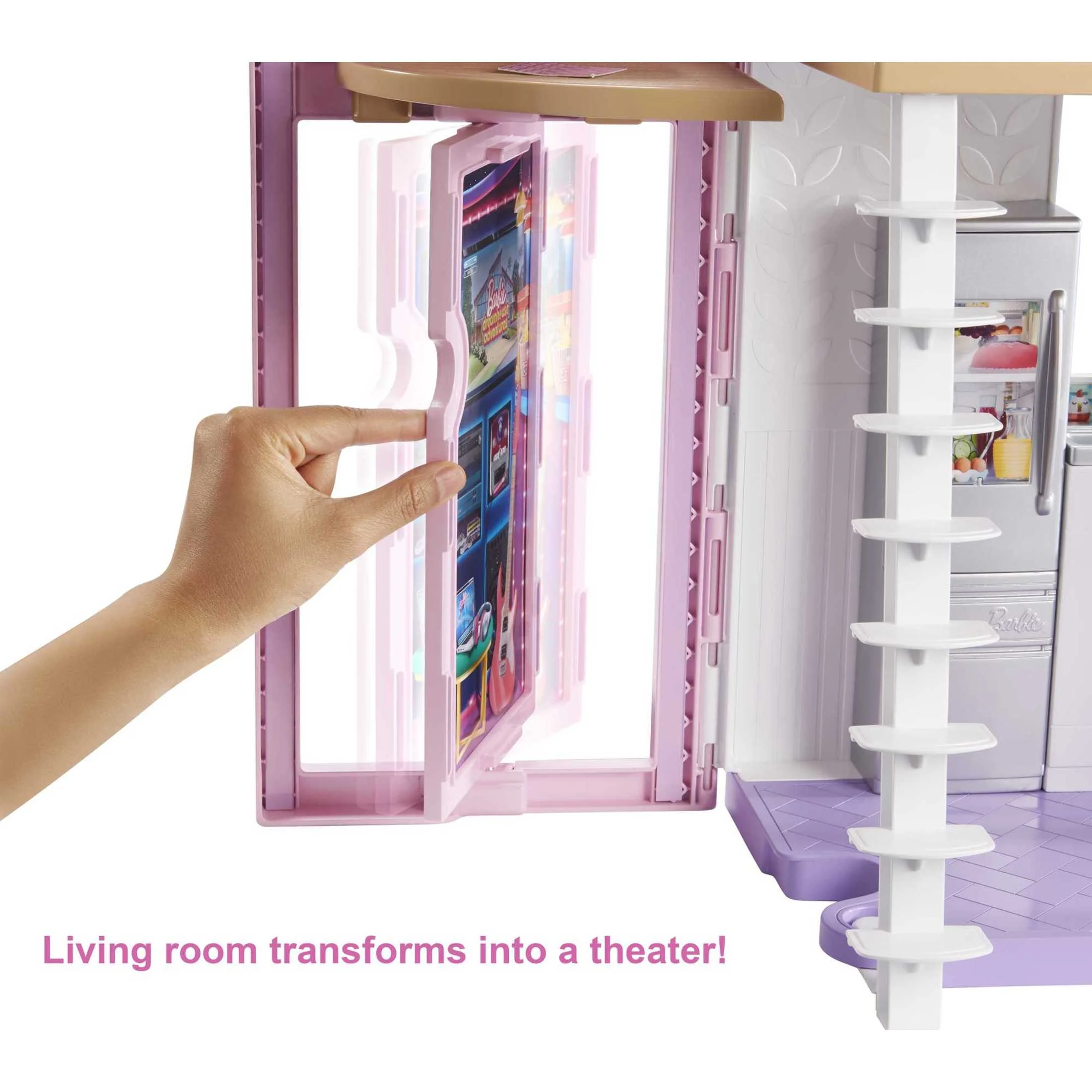 The Barbie Malibu House playset is ready for imaginations to move right in with cool transformations and lots of storytelling pieces! The Barbie dollhouse opens to reveal so many play spaces and double-the-fun features. Kids can make the 2-story, 2-foot wide dollhouse their own with more than 25 pieces to decorate its 6 rooms transformation elements bring even more possibilities into the playset. The living room transforms to an entertainment room, the shower becomes a vanity and the ceiling becomes a bunk bed to make room for 4 Barbie sisters to sleep. Classic features are there, too: the bathroom has a toilet with sink and shower; the fridge and oven open in the kitchen; and a fence piece sports a grill decal to bring the play outside. The doll-sized furniture and accessories include classic items with signature style, like a pink couch or white circle dining table, and smaller pieces that add big fun, like place settings and a gameboard. Some pieces have a handle a doll can hold (sold separately) and/or are designed with plug-and-play features that make it easy for active play or quick clean up. Fold the house to store away with ease. Tell stories where Barbie doll is hanging with her sisters, having sleepovers or backyard BBQs, celebrating a birthday, holiday or any day! There are endless stories to tell and limitless ways to explore living in the Barbie Malibu House because when a girl plays with Barbie, she imagines everything she can become! The Barbie Malibu House comes with 25+ accessories that include furniture and household items; doll not included. Colors and decorations may vary.