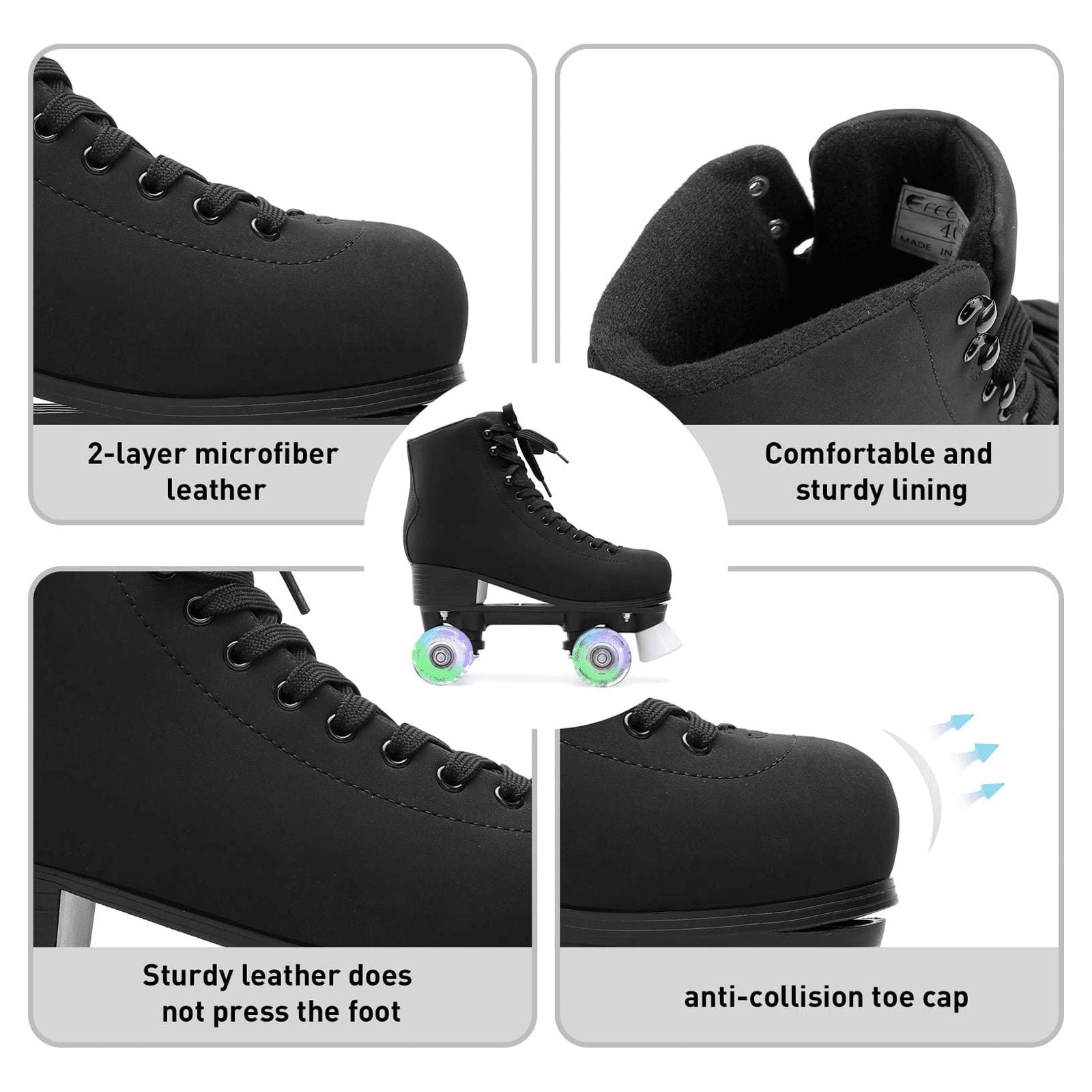 ????Light Up Roller Skates: Controllable high-top design to maintain optimal safety, and high-quality shoelaces provide adequate protection to ensure sturdy and safe feet. The ideal fit and a high degree of comfort can make your feet feel comfortable during use. There is a support column in the front, which is very suitable for beginners. It can better sustain control and break quickly. This structure ensures that the support will not be damaged. ????ABCE-7 Bearing: ABCE-7 Bearing, has strong bearing capacity, not stuck,safety and stability! The wireless stitching of the sole makes the shoes more beautiful. At the same time, we adopt professional seaming technology to make the shoes safer and more durable. ????High-top Roller Skates: The shoe body is made of cowhide.The design of the high-top shoe type can better fit our foot shape and provide maximum protection to ensure that our feet feel comfortable and safe. ????Wear-resistant Wheels: Roller skates are equipped with sturdy four-wheel skates, made of durable and molded materials, which can provide safe and reliable skating performance. The shiny wheels make you more cool in the skating. ????Ideal Gift: The roller skates in extremely vibrant colors will stand out from the crowd. They are perfect gifts for friends, ideal for indoor skating and outdoor cycling.