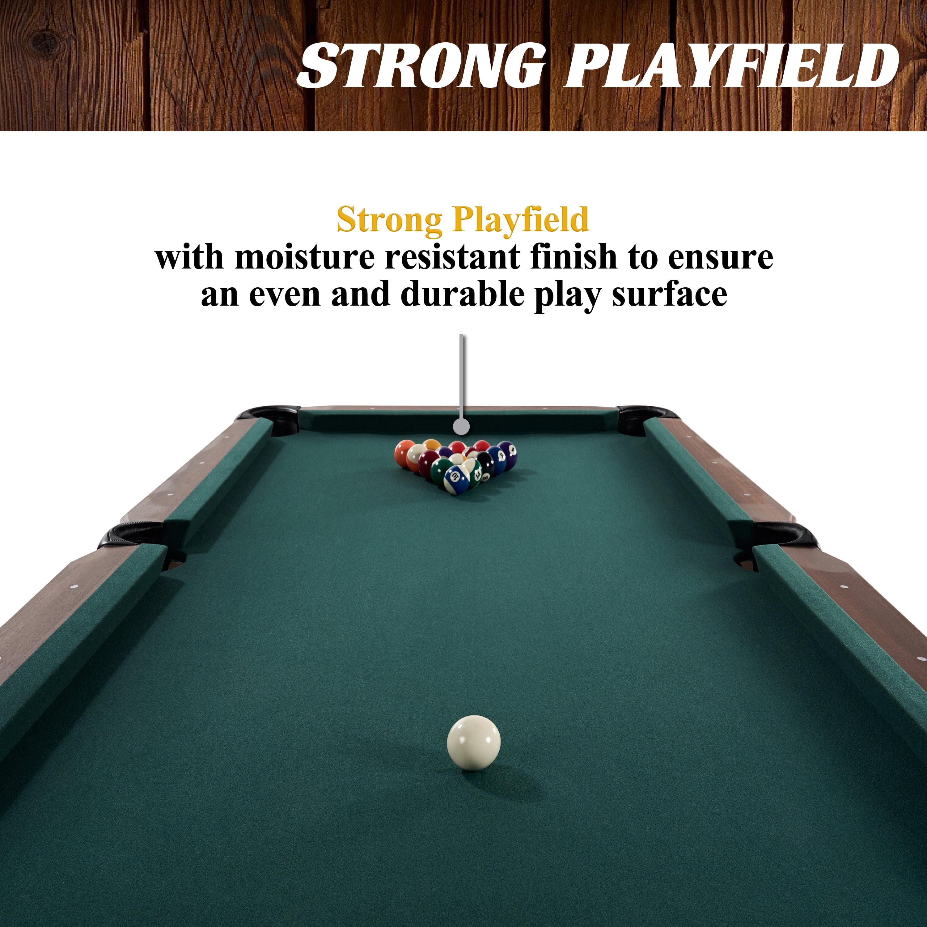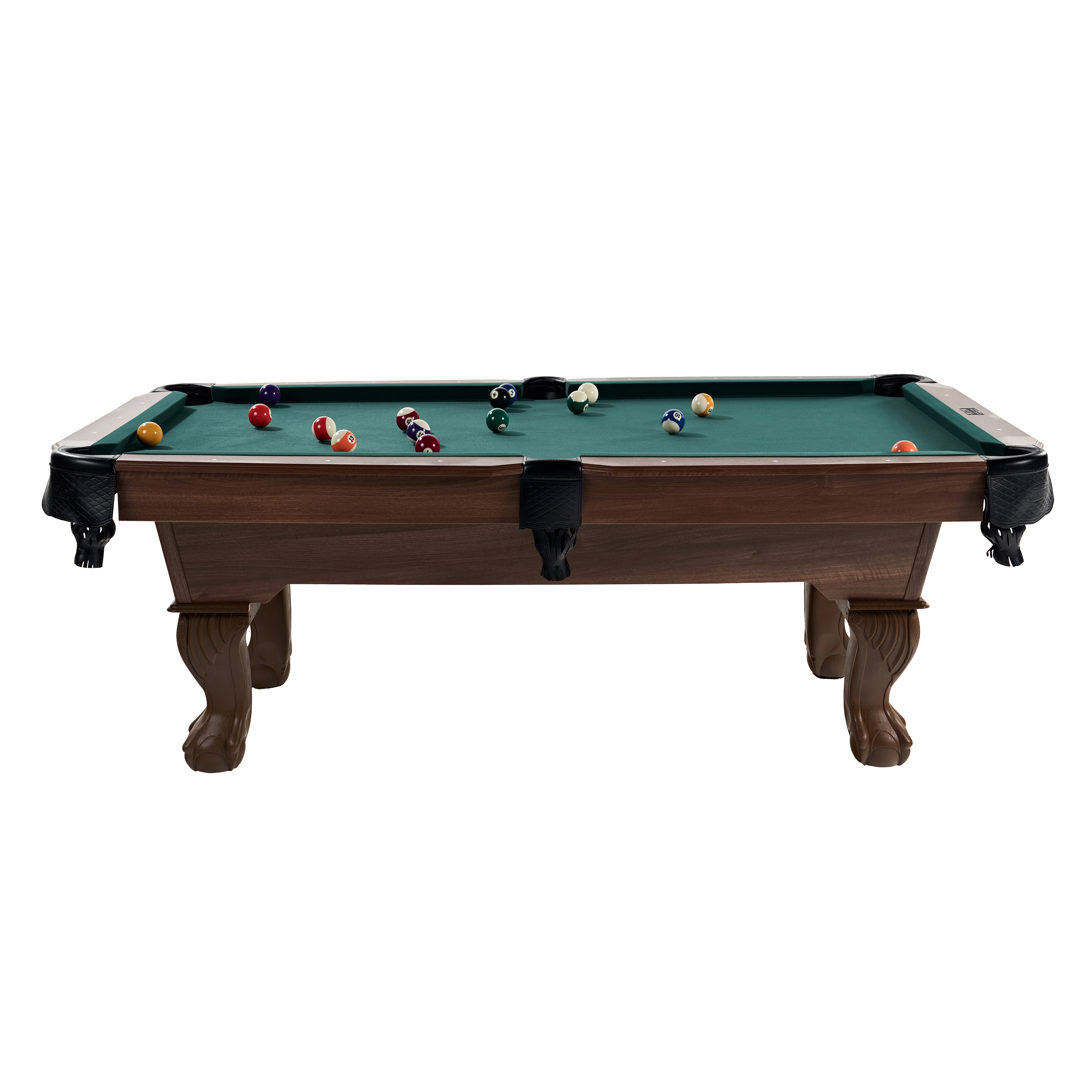 Standard 87-Inch Pool Table: Full-size table designed for competitive play with the same playfield size used in many pool halls Durable Construction: Scratch-resistant 5.75″ wood grain laminated top rails and sturdy MDF frame for long-lasting use Smooth Playing Surface: 3/4” (18mm) thick engineered wood playfield with moisture-resistant coating and tricot polyester felt Consistent Ball Roll: Premium K-818 side rail bumpers ensure accurate bounce and smooth gameplay Classic Claw Leg Design: Molded plastic legs with inner steel supports in elegant Ball and Claw style, built for stability Even Playing Surface: Includes 1.5” hidden leg levelers and two adjustable under-table brackets for leveling Perfect Room Fit: Recommended room size is 17’ x 14’ for optimal cue movement and comfortable gameplay Complete Accessory Set Included: 2 x 57” wood cue sticks, 1 set of 2.25” billiard balls, 1 triangle rack, 2 chalks, and 1 table brush Assembly Required: Attach the lower apron, legs, and support brackets before use Ship to Home: Standard shipping includes front door drop-off only Store Pick-Up: Item is oversized and does not fit in most vehicles Assembled Dimensions: 87″ L x 49″ W x 31″ H, 196 lbs. Box Dimensions: 91.5″ L x 54.5″ W x 6.5″ H, 233.20 lbs.