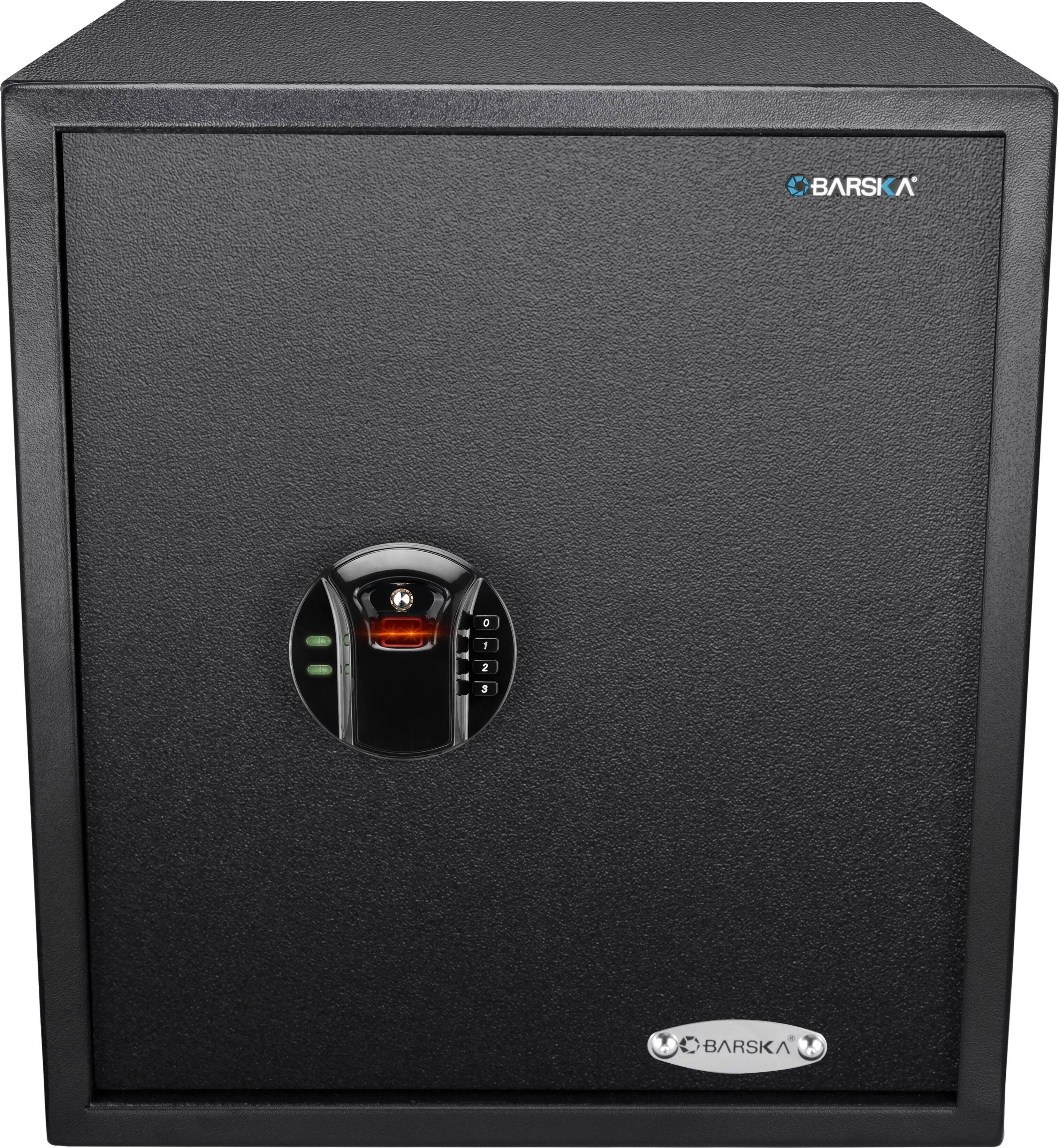 Secure and Protect your valuables with the HQ400 Large Biometric Digital Keypad Safe by Barska. The HQ400 Safe features an all-new module that provides both a Biometric Fingerprint Scanner and a Numeric Digital Keypad. Store up to 120 unique fingerprints and 1 PIN Code into the HQ400’s memory bank. The HQ400 by Barska is the perfect storage solution for small electronics, jewelry, documents, other valuables. The HQ100 comes complete with mounting hardware, a set of 2 back-up keys, protective floor mat, and 4 AA batteries.