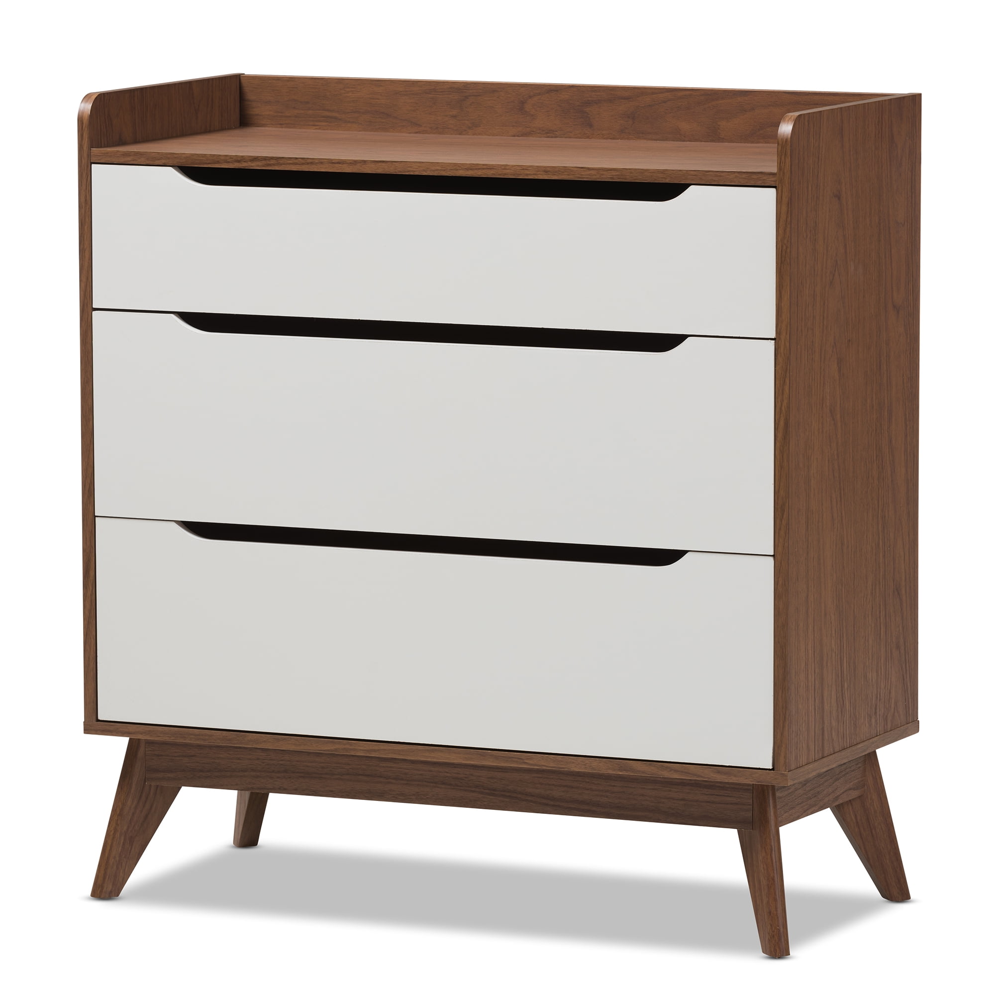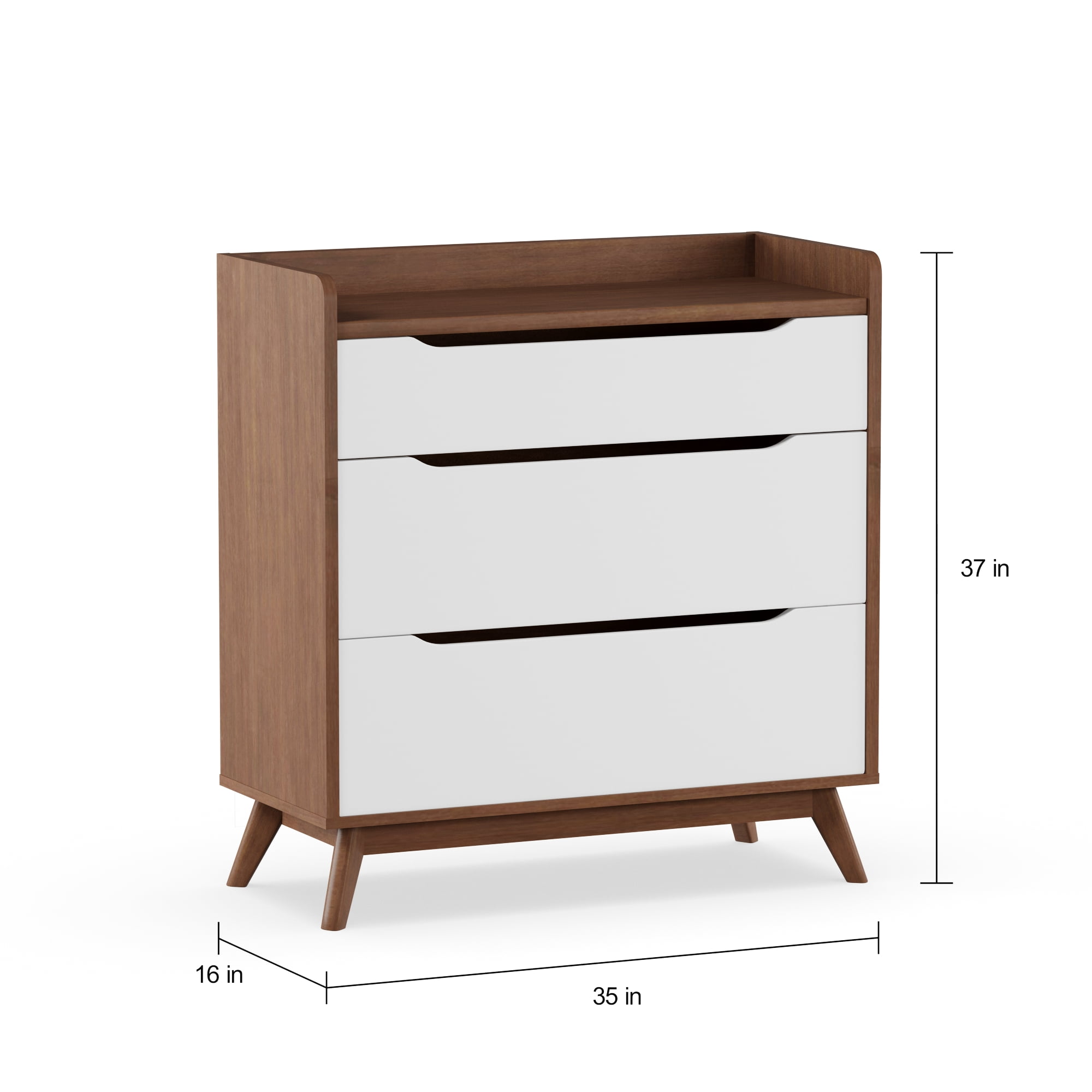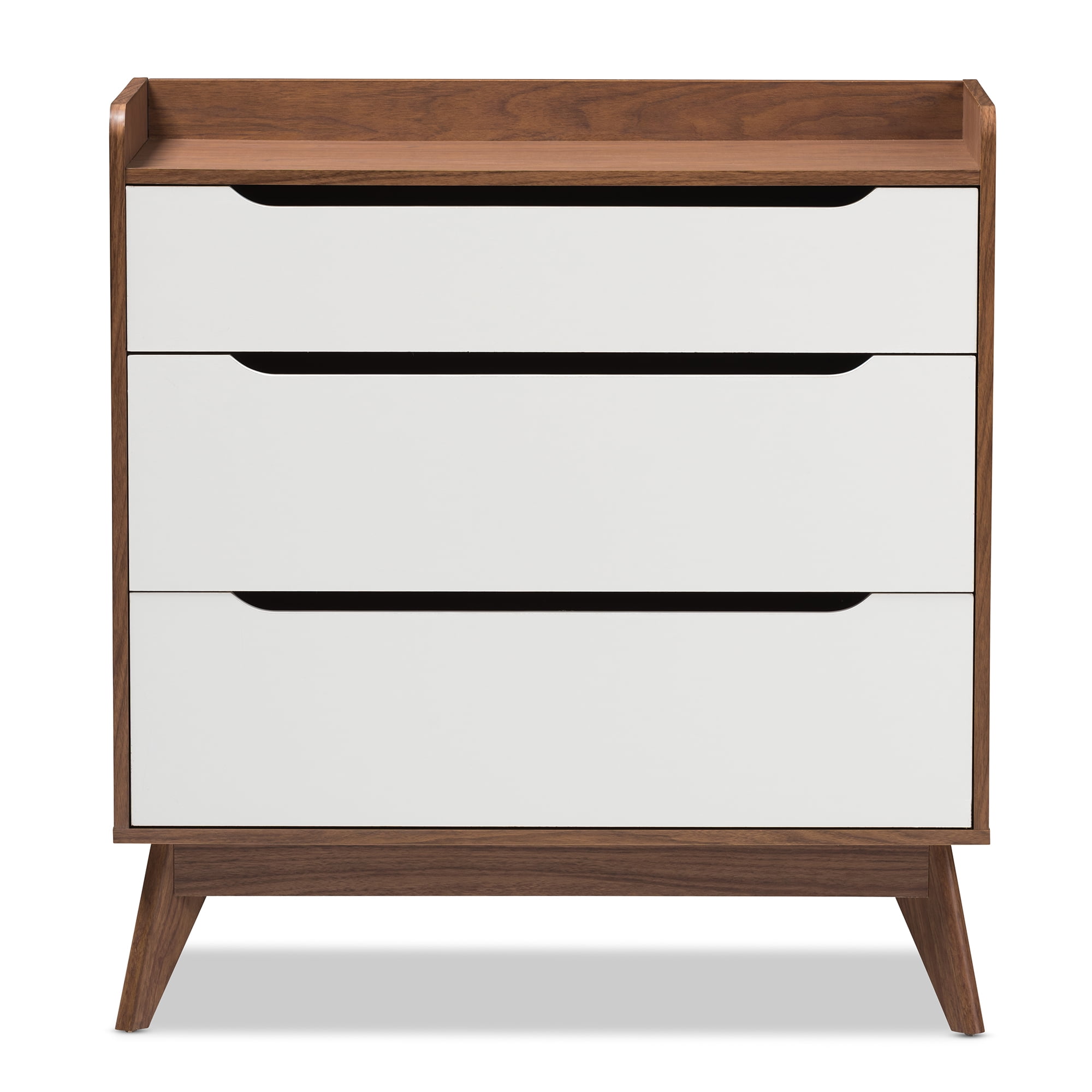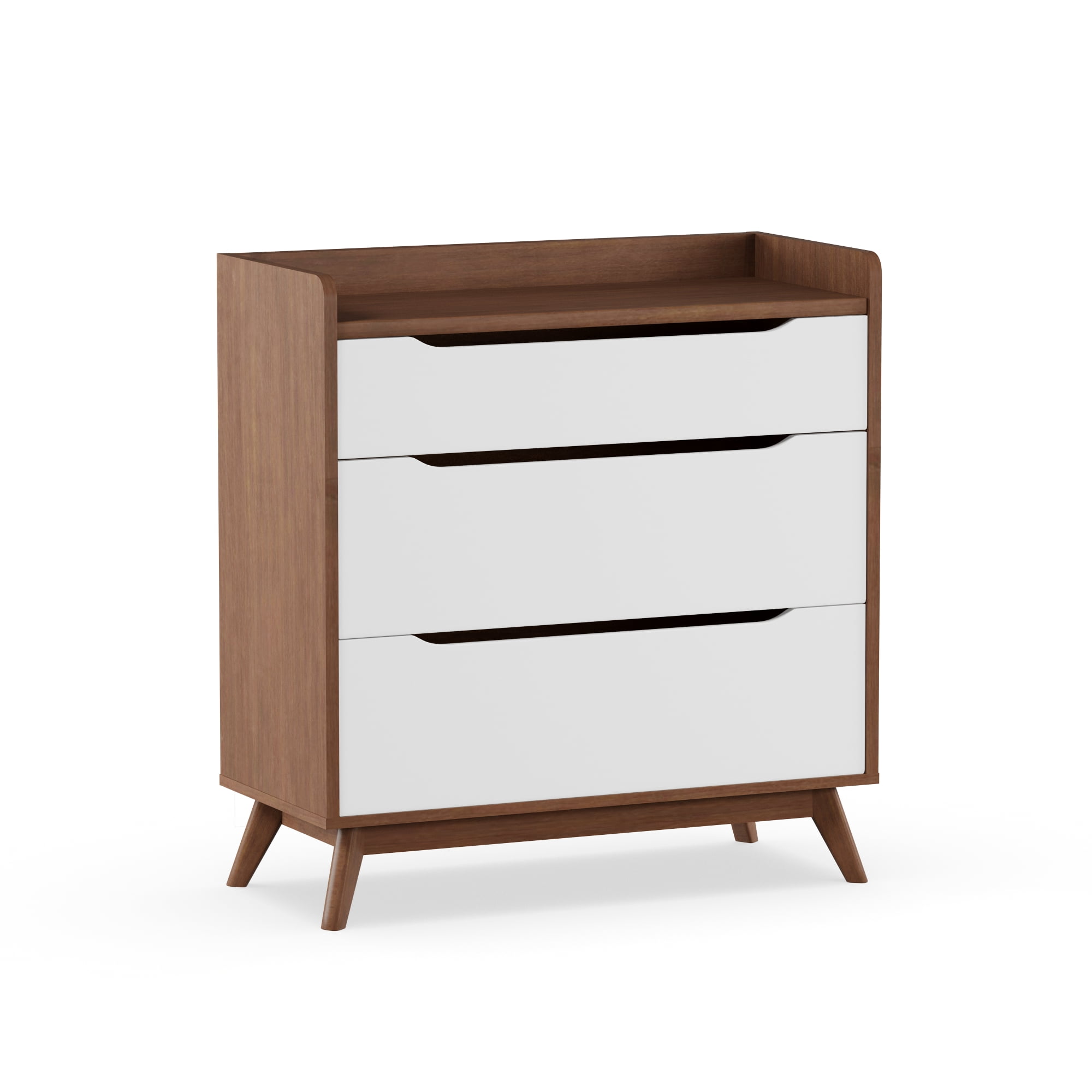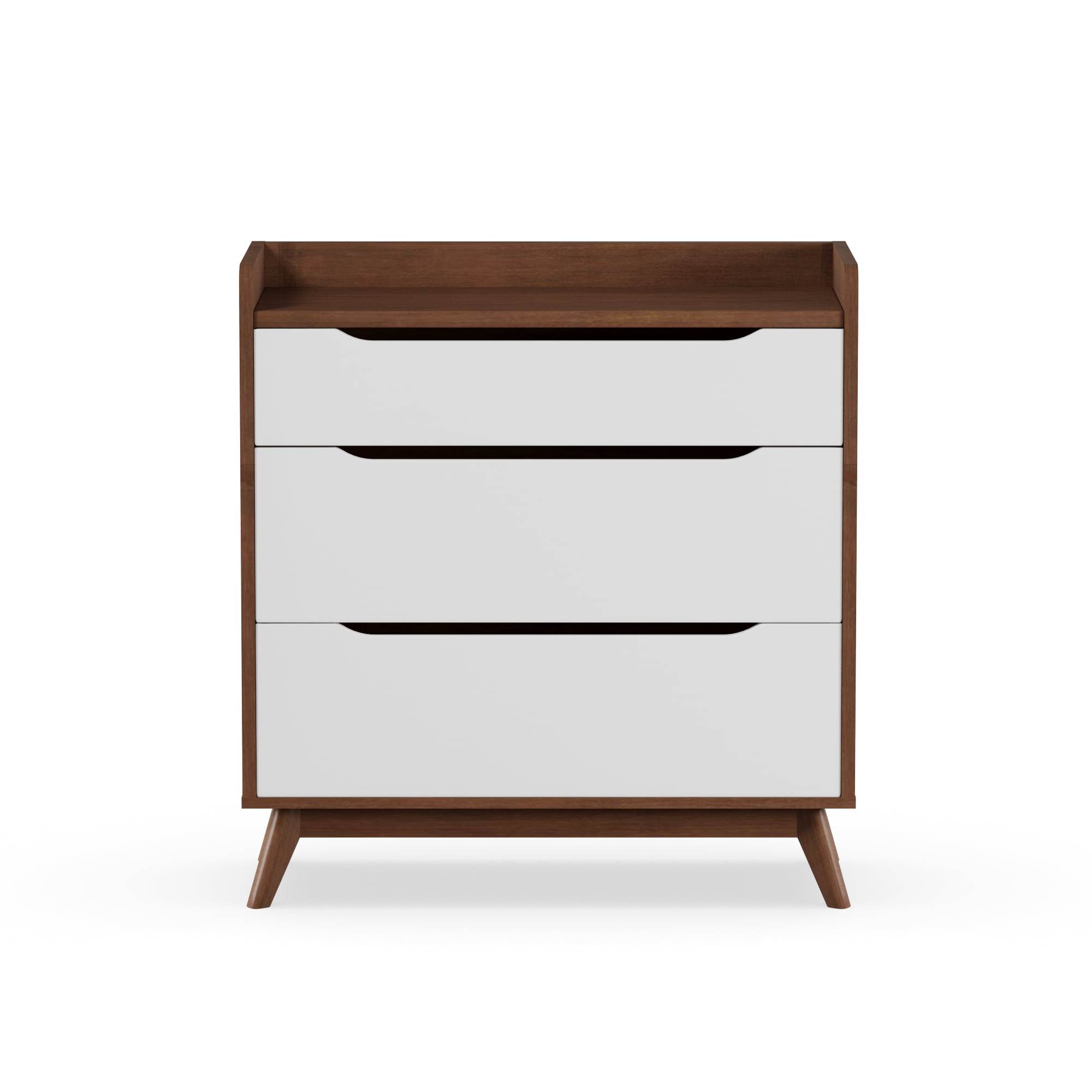 Bartel collection is a remake of a mid-century classic and bestseller, offering versatile storage with its drawers and shelf. Constructed of engineered wood and MDF, the Bartel 3-drawer storage chest is finished in white and walnut veneer for lasting good looks, suiting interiors from Scandinavian to contemporary. Featuring drawers with cut-out handles for a sleek and clean look, the Bartel provides storage solution for your clothes, lingerie’s, linen and your bedroom essentials. Practical top shelf surface allows you to decorate with flowers, photo frames and as an additional spot for books. Angular legs, for Scandinavian vibes in your space complete the look. Made in Malaysia, the Bartel 3-drawer chest requires assembly.