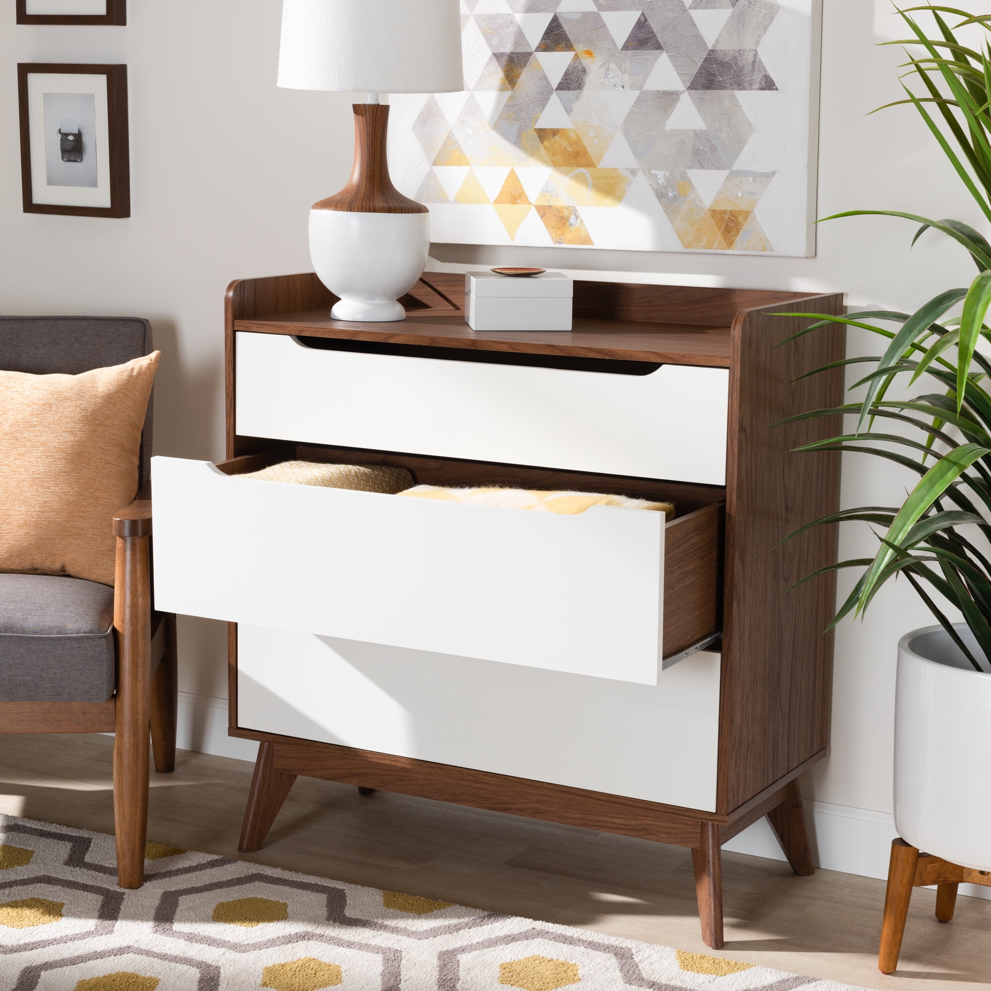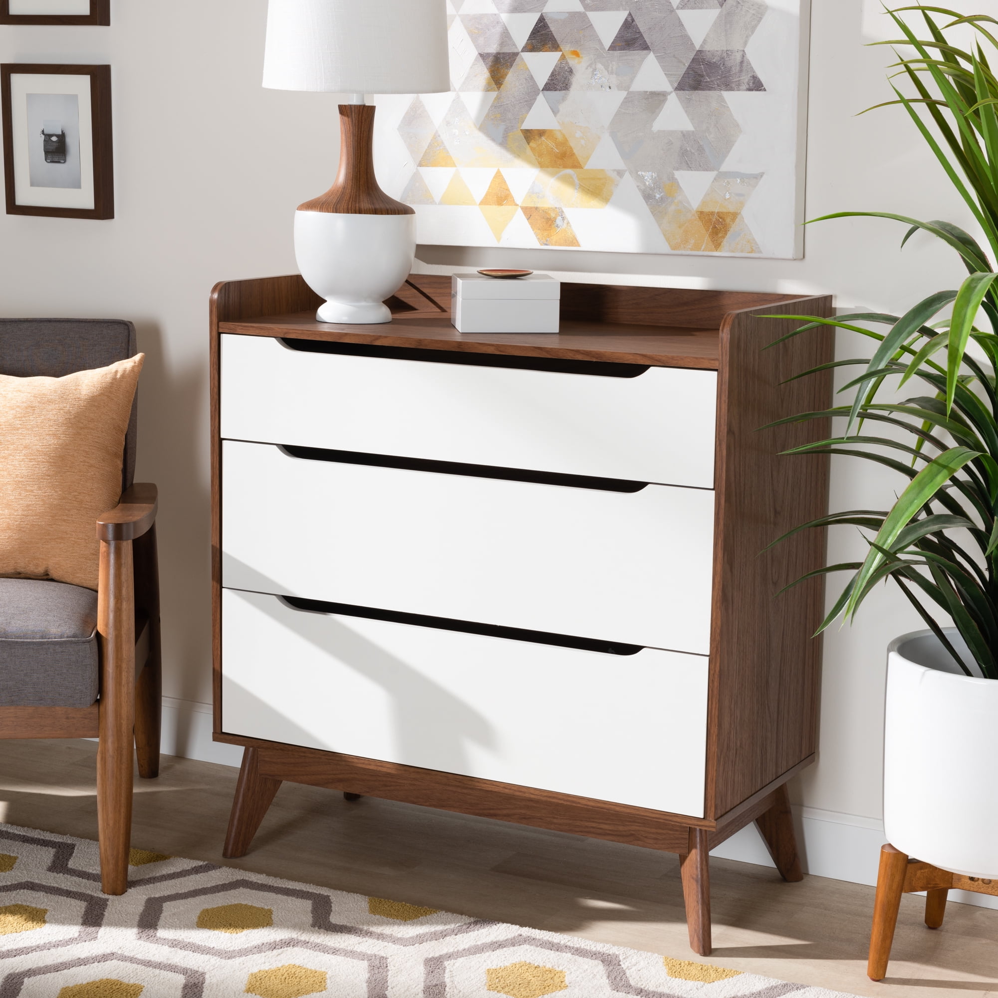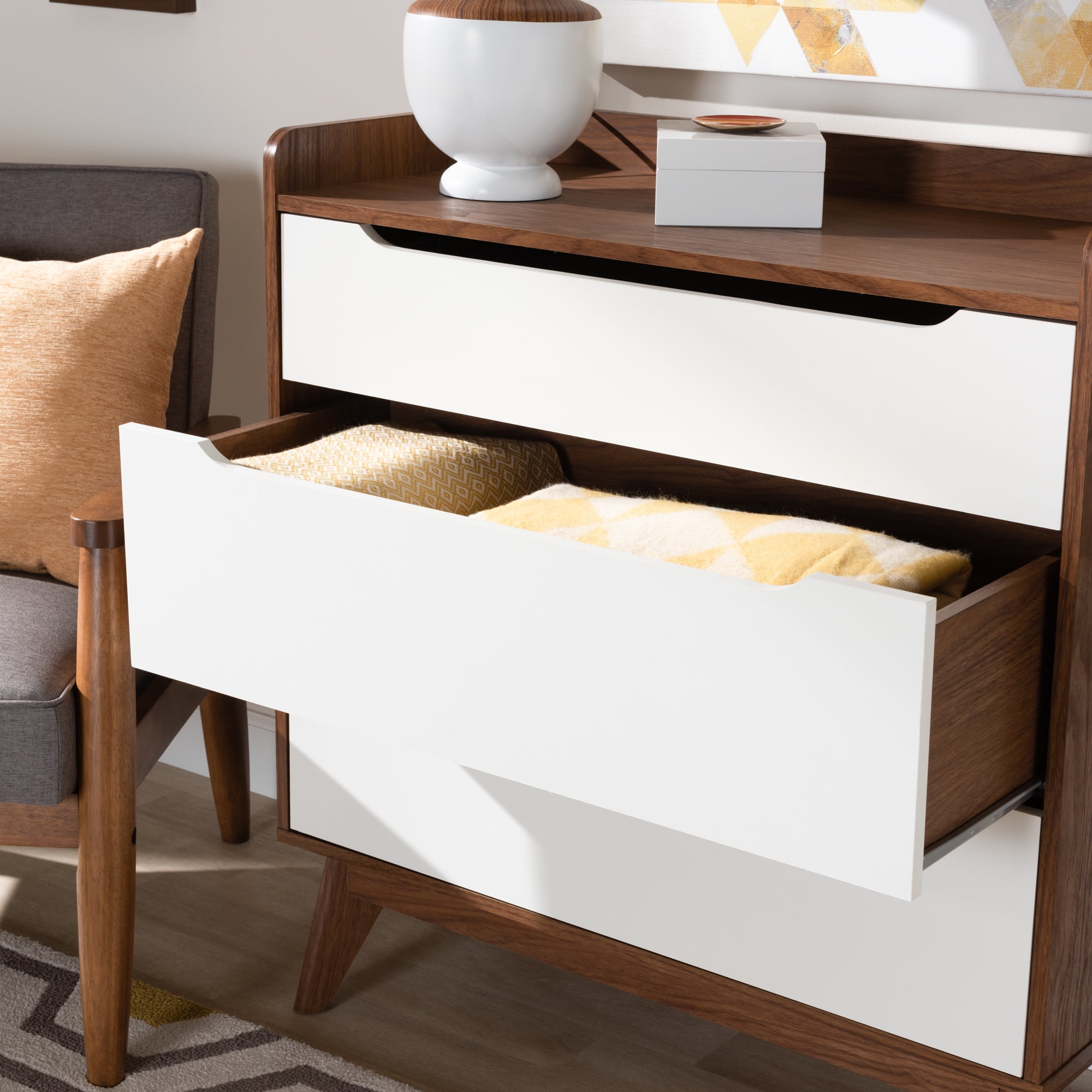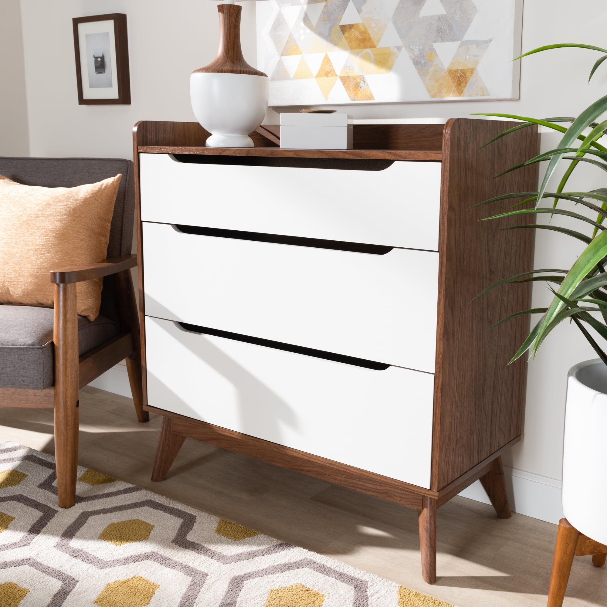 Bartel collection is a remake of a mid-century classic and bestseller, offering versatile storage with its drawers and shelf. Constructed of engineered wood and MDF, the Bartel 3-drawer storage chest is finished in white and walnut veneer for lasting good looks, suiting interiors from Scandinavian to contemporary. Featuring drawers with cut-out handles for a sleek and clean look, the Bartel provides storage solution for your clothes, lingerie’s, linen and your bedroom essentials. Practical top shelf surface allows you to decorate with flowers, photo frames and as an additional spot for books. Angular legs, for Scandinavian vibes in your space complete the look. Made in Malaysia, the Bartel 3-drawer chest requires assembly.