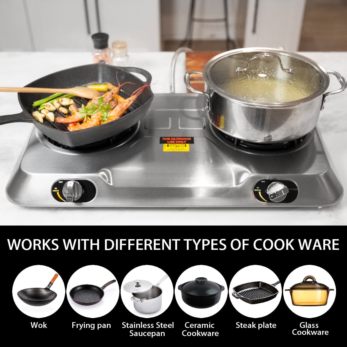 Twin High-Efficiency Burners: Each burner delivers 15,000 BTUs of power, heating food quickly and evenly with inner and outer flame rings for improved heat distribution and lower gas consumption. Polished Stainless Steel Cooktop: The sleek, easy-to-clean stainless steel surface adds a modern touch to your outdoor setup while standing up to weather and repeated use. Piezo Ignition for Easy Start-Up: No matches or lighters needed—just push and turn to light your flame with the built-in Piezo ignition system. Stable and Secure Design: Four non-slip rubber feet provide added grip and stability, keeping the stove firmly in place on any flat surface during use. Portable & Versatile: Compact enough for on-the-go cooking, yet powerful enough to handle large meals. Ideal for stews, seafood, searing meats, and more. Whether you’re cooking for a campsite crew or backyard guests, the Barton Stainless Steel 2-Burner Stove offers power, style, and convenience in one compact setup