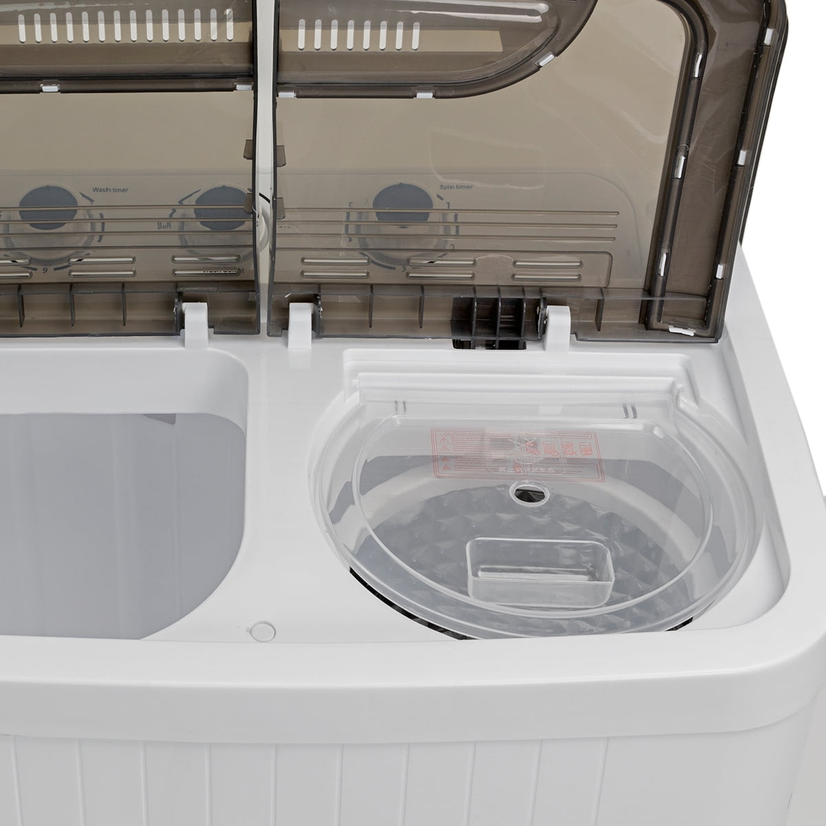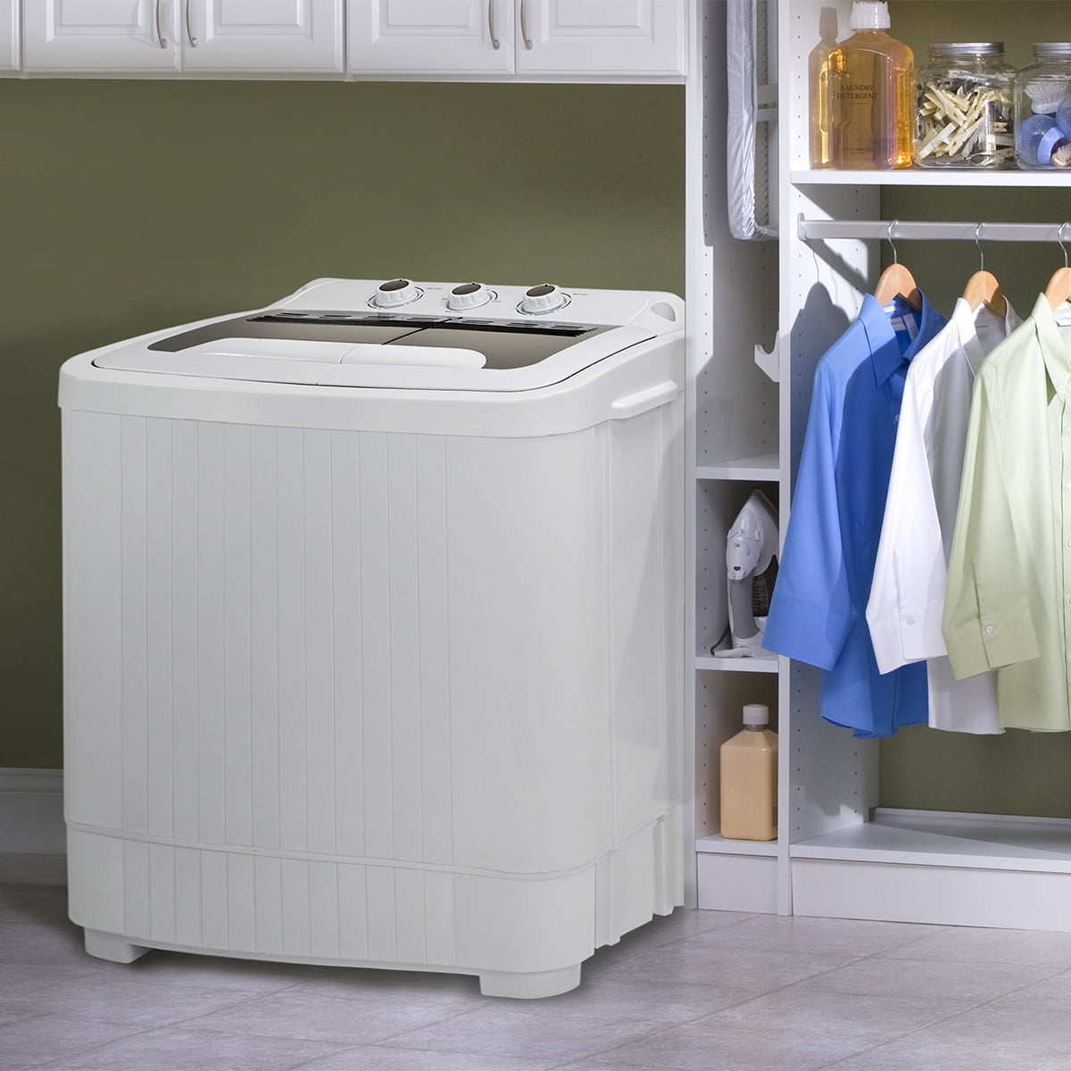 ? Powerful Cleaning – Compact Mini Twin Tub Washer is effective enough to leave your clothes smelling pleasantly clean and fresh. This washer/dryer combo performs with the reliability of a professional grade machine. A compact yet functional design makes this washer/dryer combo a lifesaver ? Save Time & Money – Designed to save time and money with two built-in units, one tub for washing clothes and a separate tub for spinning out excess water. The compact mini twin tub washing machine is perfect for those with a need to multi-task, save space and may want to save themselves a trip to the expensive laundromat ? Constructed of High-Density Body and Upgraded Motor – Make it well built to use for years. Easy to move & transport to anywhere, lightweight & space-saving design allows it easily fit in a bathroom or closet, ideal for dorms, apartments, condos, motor homes, RV?s, camping trips or anywhere with limited space! ? Built-in Drain Pump – Washing Machine with a Built-in drain pump drains dirty water by more longer drainage tube from washer. ? Easy Operation – Simple design of the operation panel, wash timing, wash options, drain options, and spin timing, more easier to use. Allows you to simply put in your load of clothes, fill with water, set the timer and start washing, completely suitable for everywhere!