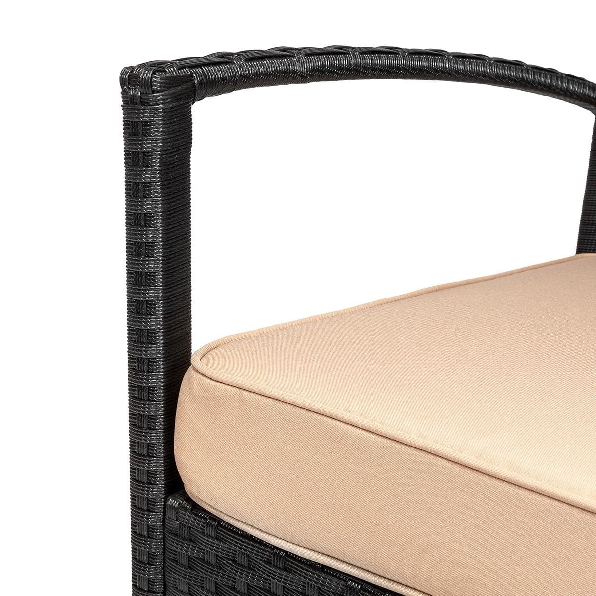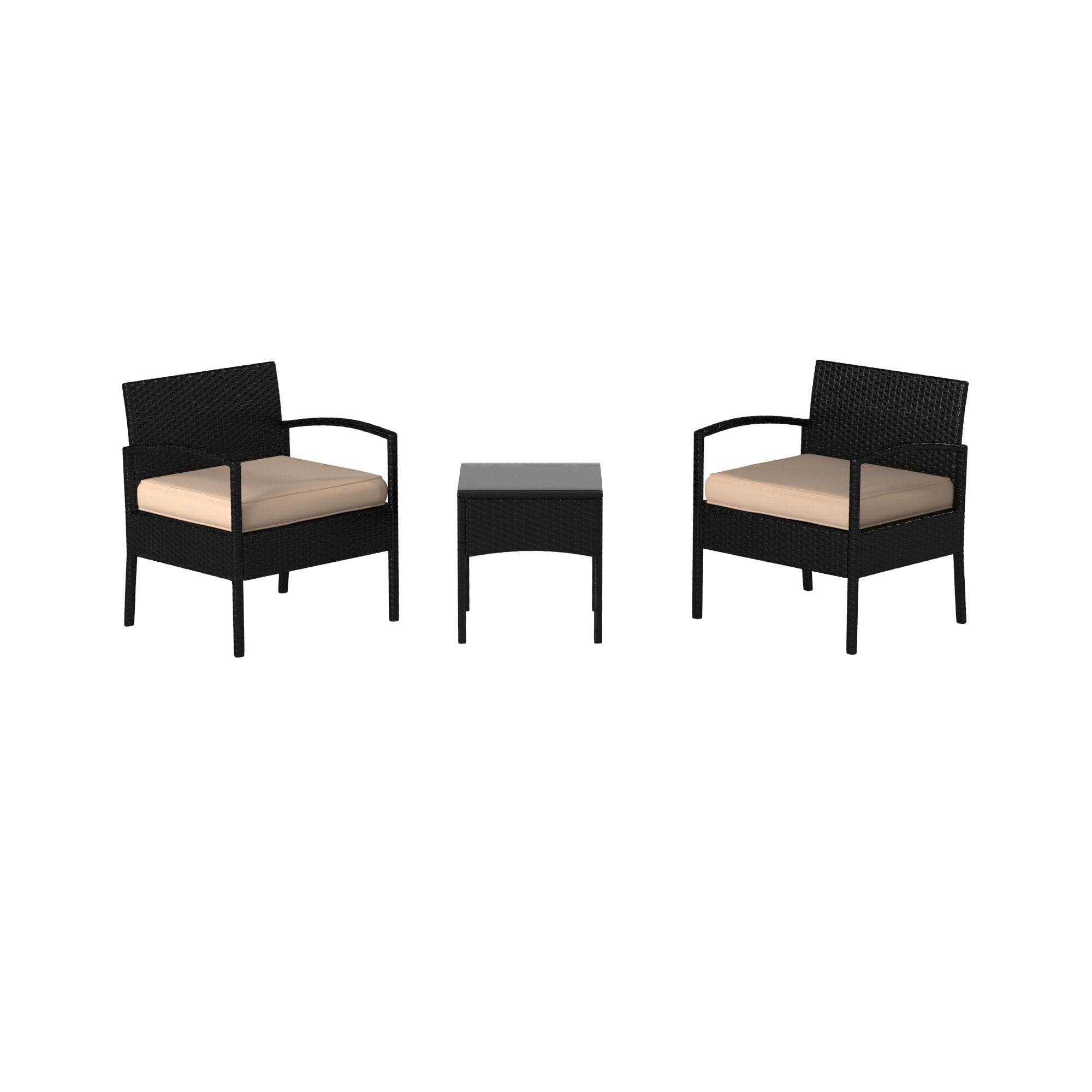 Complete 3-Piece Set: The set features a 16-inch square side table and two wicker armchairs with removable cushions. Whether you’re sharing coffee or lounging in the sun, this compact bistro setup is perfect for cozy outdoor moments. Stylish Glass Tabletop: The table includes a black tempered glass top framed in durable wicker. Its sleek, easy-to-clean surface adds a polished look to your patio without compromising on practicality. Comfortable Seating: Both chairs are designed with ergonomic curves and wide armrests for relaxing support. Thick, soft seat cushions provide added comfort and include slipcovers for easy machine washing. Weather-Resistant Design: Built with UV-resistant wicker and steel framing, this set stands up to sunlight and outdoor elements. It’s crafted to resist wear, fading, and moisture for year-round use. Whether you’re hosting friends or enjoying quiet time outdoors, this stylish and low-maintenance bistro set provides an inviting place to sit back and unwind.