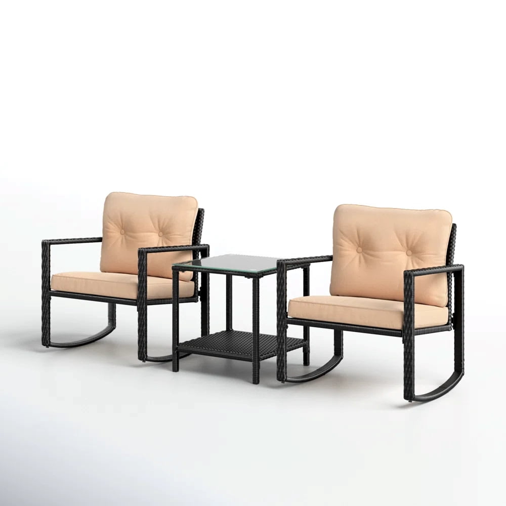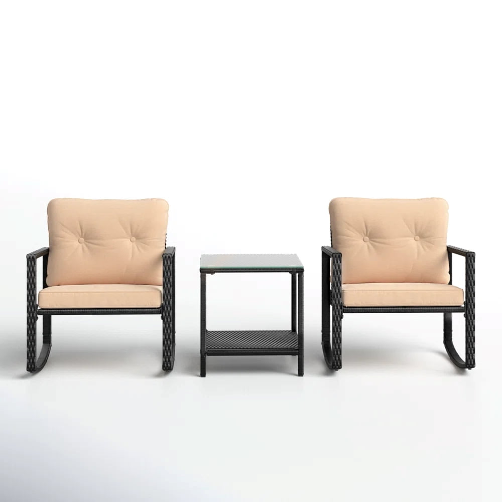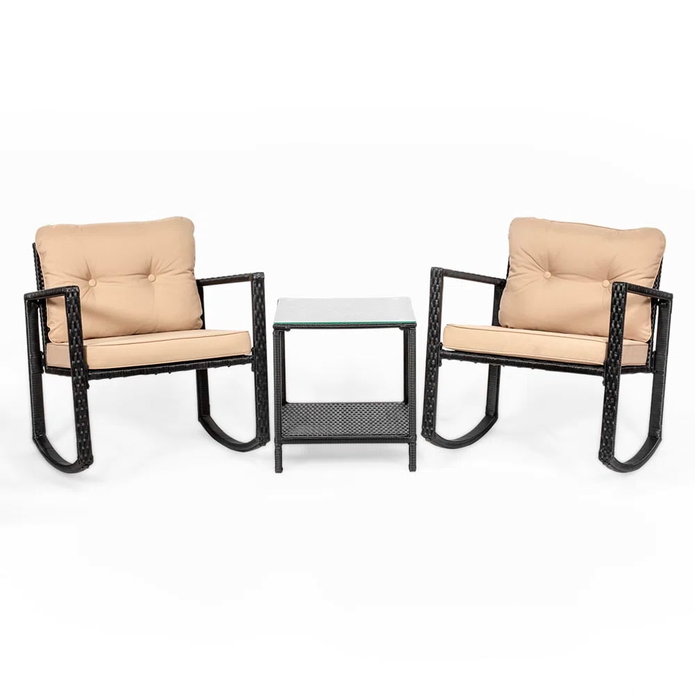 Specifications: Type: Rocking Wicker Patio Set Table Finish: Black Tabletop Material: Glass Each Chair Weight Capacity: 220 lbs Material: Wicker Seating Capacity: 2 Person Table Dimensions: 21″(L) x 20″(W) x 28″(H) Seat Height: 19″ Chair Dimensions: 67″(L) x 60″(W) x 44-1/2″(H) Seat Cushion Dimensions: 20-1/2″(L) x 19-1/4″(W) x 3″(H) Cushion Included: Yes Assembly Required: Yes Package Contents: 2 Rocking Wicker Chairs 1 Wicker Side Table Hardware Set Manual Upgrade your patio or backyard space with this Barton 3PC Rocking Set. Designed for comfort and durability, it features a contemporary black wicker finish, a sleek glass-top side table, and two ergonomically designed rocking chairs with extra-thick cushions. Whether you’re enjoying your morning coffee or winding down in the evening, this patio set provides a perfect place to unwind.