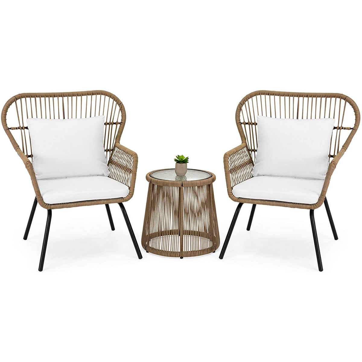 Modern Silhouette: The clean lines and rounded edges of this chat set strike a balance between contemporary design and cozy charm. Finished with slim angled legs, the set offers a stable structure that’s equally appealing to the eye. Comfortable Woven Seats: Each chair features a handwoven rattan body with durable construction and plush cushions that offer exceptional comfort and support, making it ideal for hours of lounging. Tempered Glass Tabletop: The included round side table features a tempered glass surface that is smooth, easy to clean, and perfect for setting down drinks, snacks, or decor. Sturdy Steel Frame: Reinforced with a powder-coated steel frame, this set delivers reliable support and long-lasting performance through every season. Easy Outdoor Styling: With a natural beige tone and curved contours, this compact set is made to fit effortlessly into balconies, porches, or backyard corners. Relax in style with the Barton 3-Piece Outdoor Rattan Wicker Bistro Set—an elegant and space-saving furniture set built for outdoor comfort and modern living.