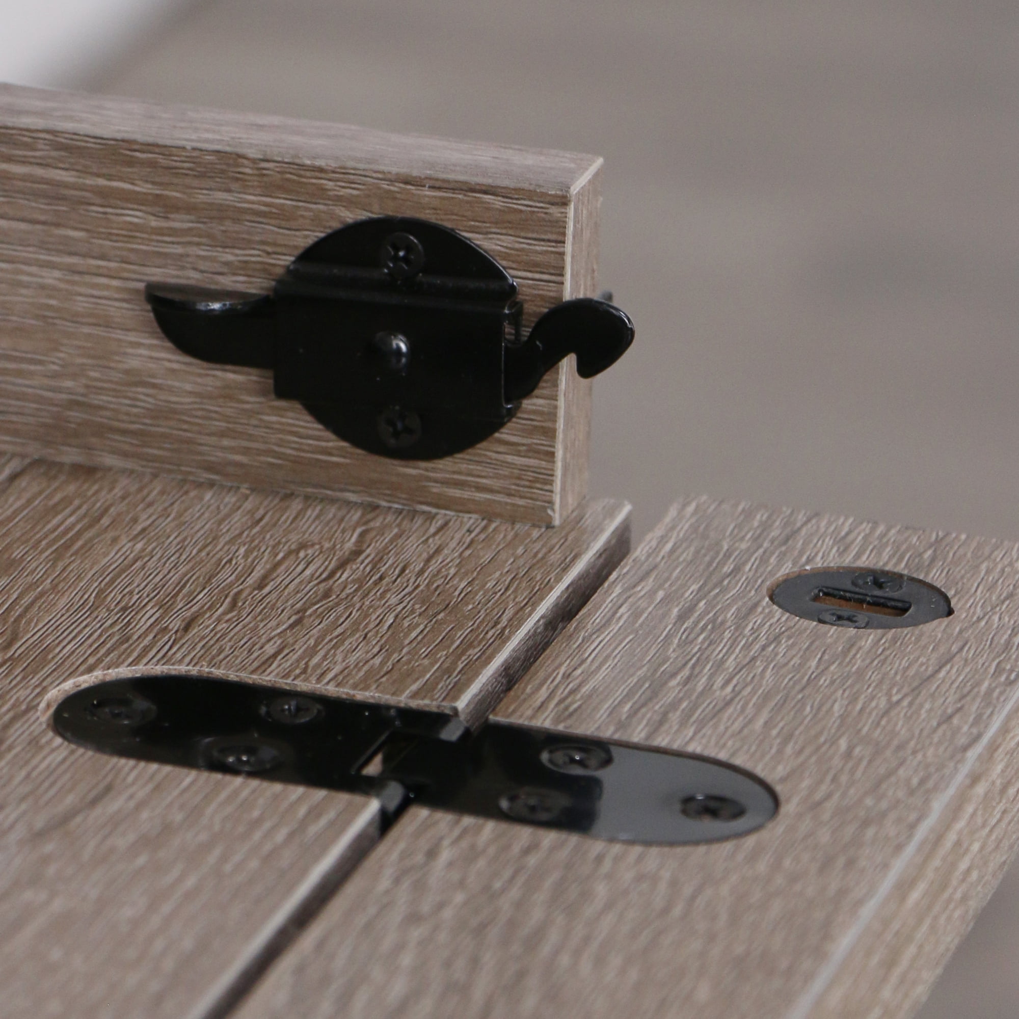 Barton 1-drawer Driftwood desk by River Street Designs Single wide drawer Two shelves on the left AC plug-in unit USB port Assembled Dimensions: 30″ H x 48″ L x 24″ W Packaged Dimensions: 11” H x 50” L x 28” W Assembly: Some assembly required Materials: High-grade MDF, premium laminate, painted metal Ships in 1 box