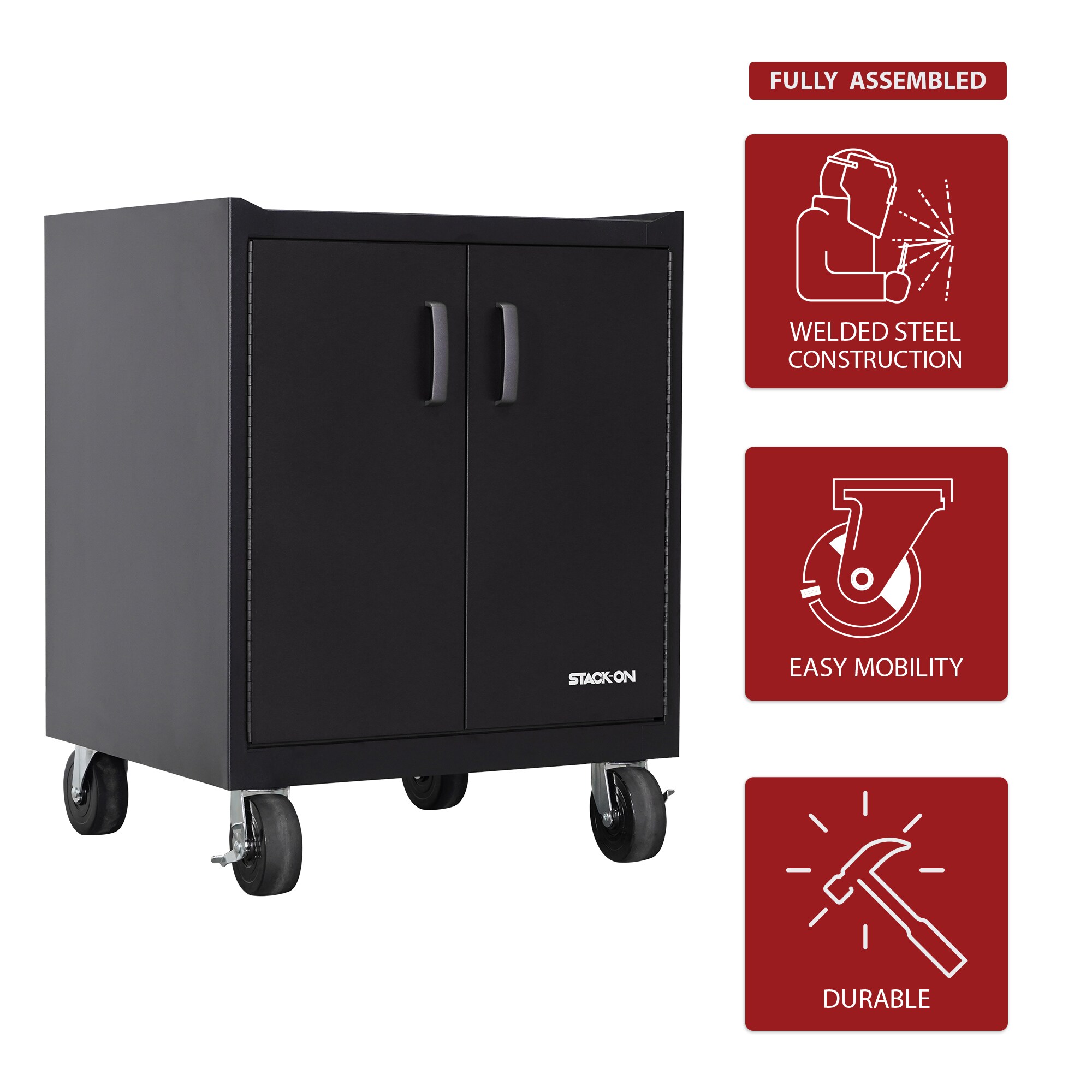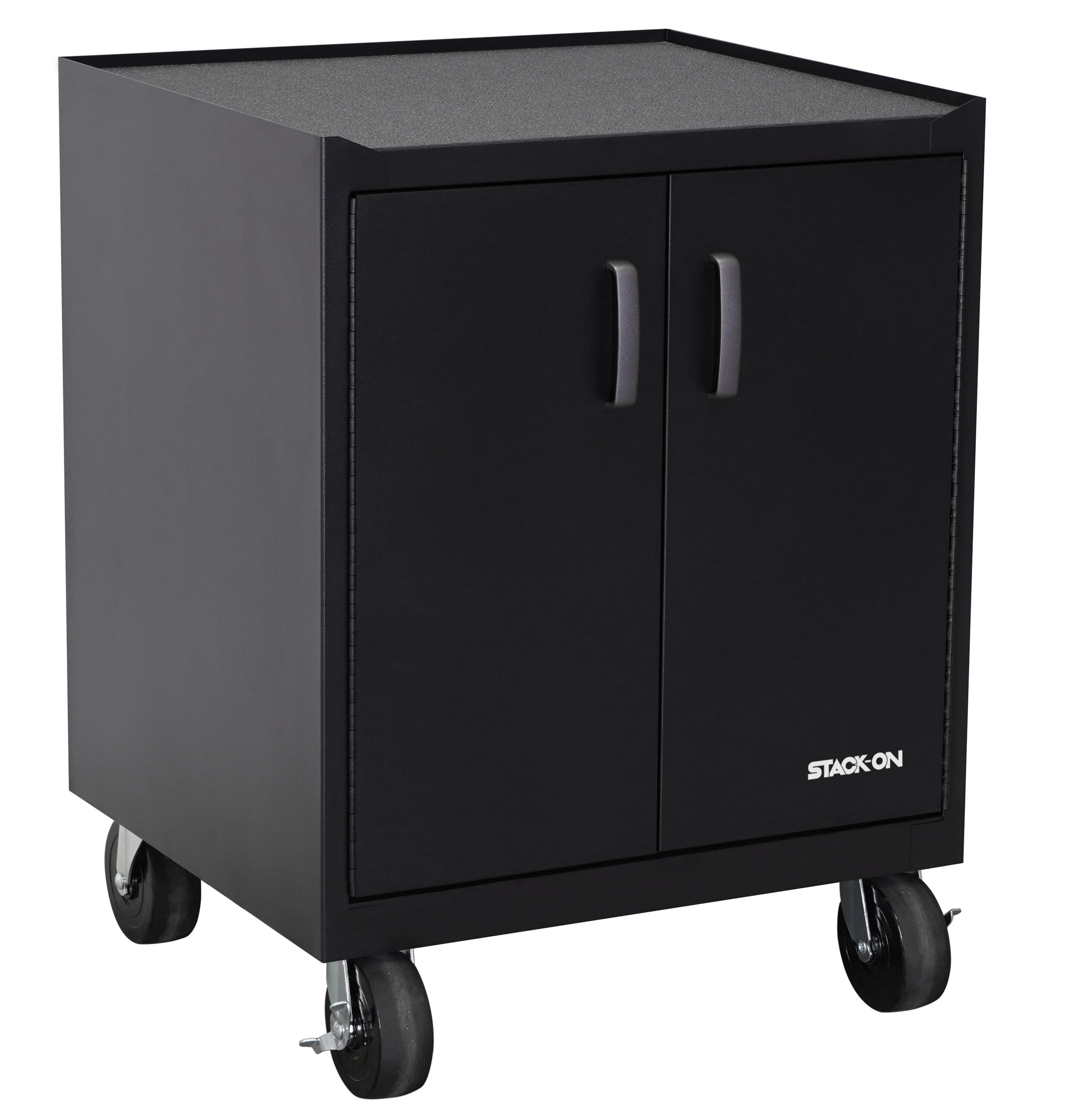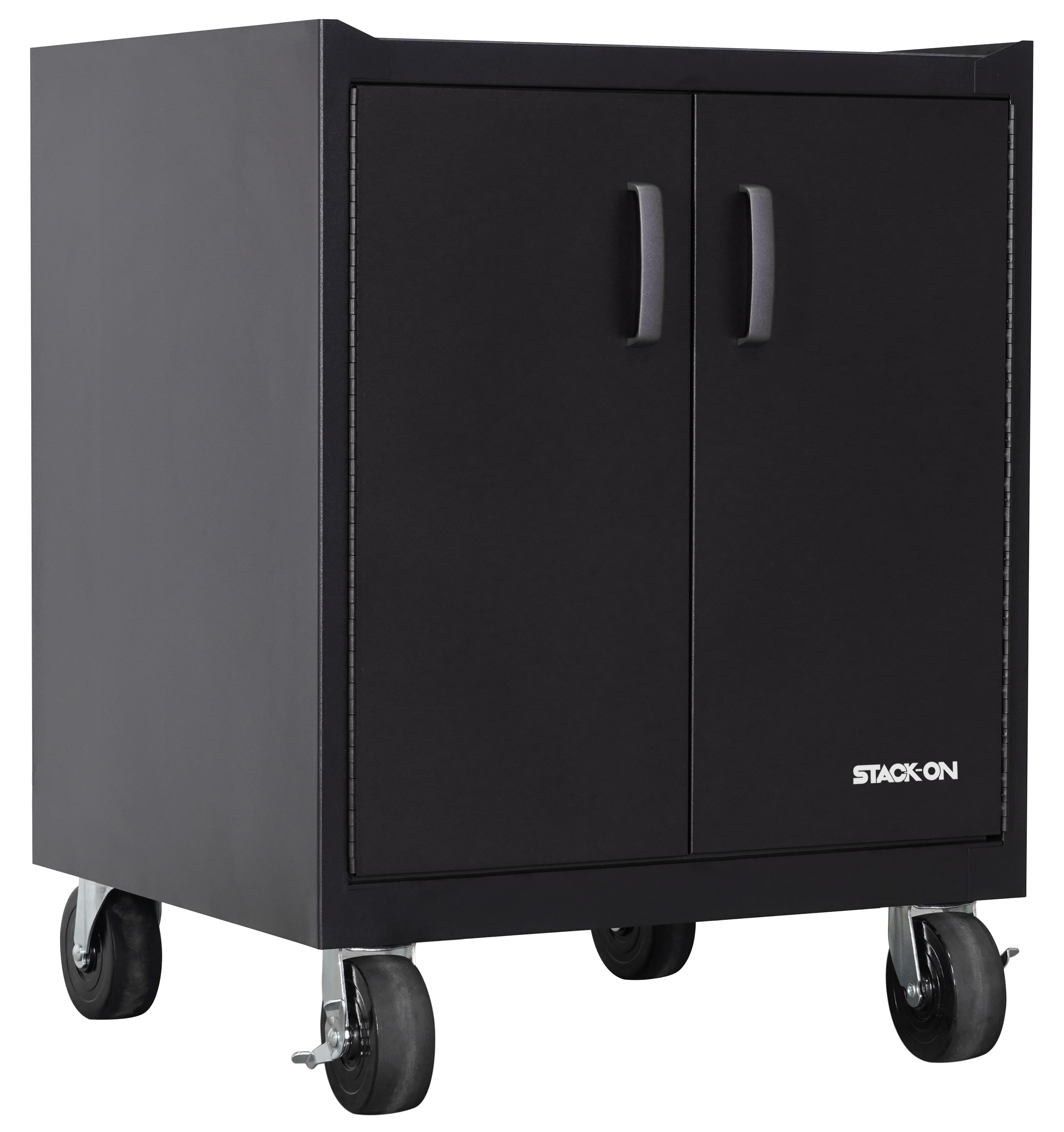 Keep your workshop or garage organized with a Stack-On, free-standing, two-shelf base cabinet. This welded steel cabinet comes mostly assembled. The casters and hardware can be mounted in minutes! A solid top with anti-slip mat, provides extra workspace for can be used for additional storage. Can be used as a free-standing cabinet or docked under a Stack-On wall cabinet. Four casters, with two locking to provide both stability and mobility, can rotate 360 degrees, making the cabinet an ideal piece of equipment for workspaces. Two fixed steel shelves can hold up to 65 lbs. each. Doors close with double enforced powerful magnetic strip that holds the cabinet door securely closed. This cabinet can be combined with other Stack-On garage storage units to create a clean, organized look for your garage or workshop.