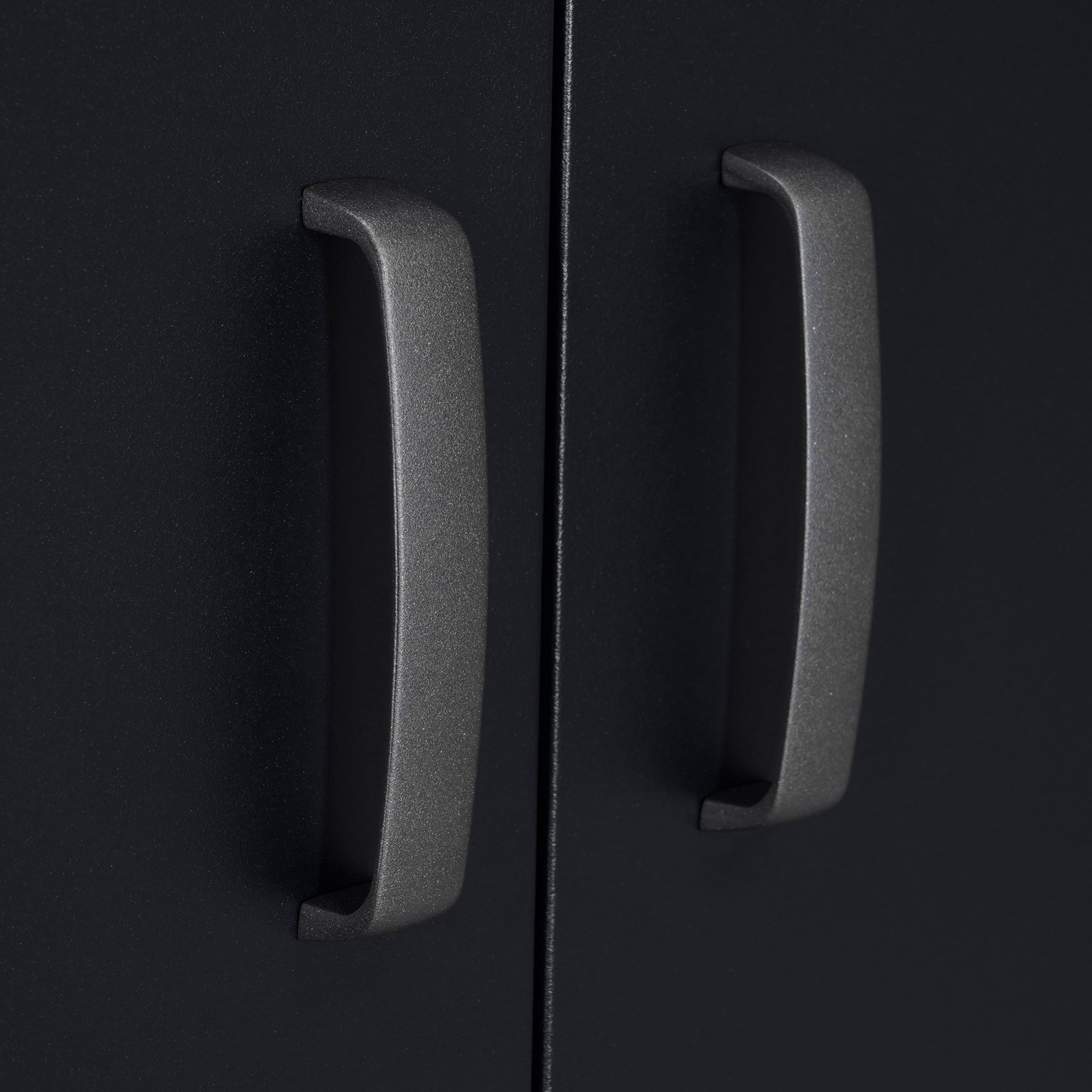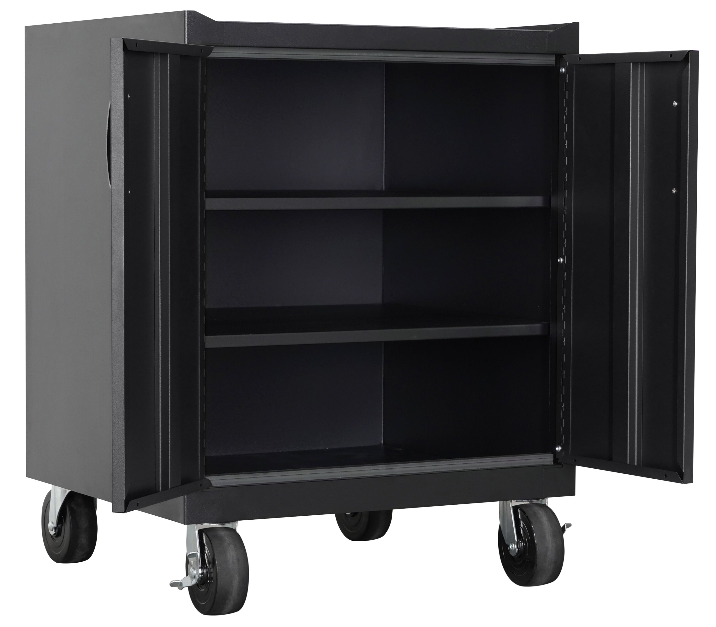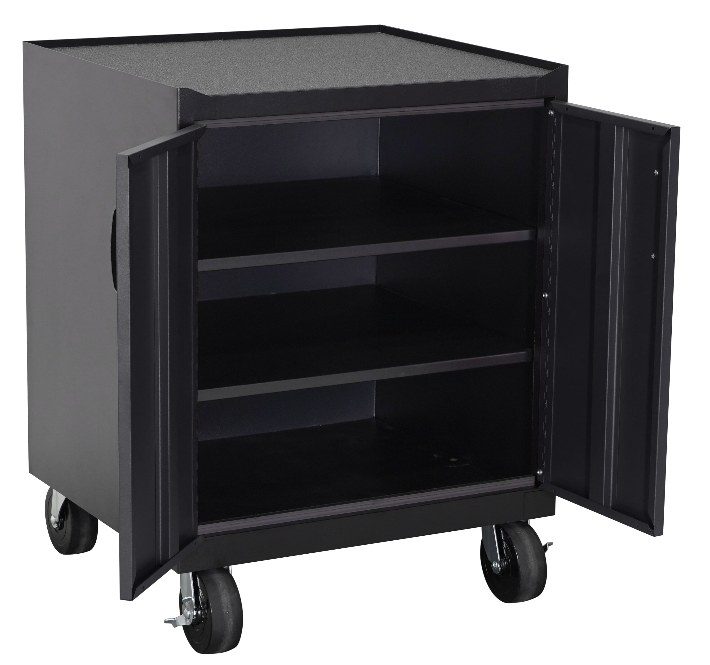 Keep your workshop or garage organized with a Stack-On, free-standing, two-shelf base cabinet. This welded steel cabinet comes mostly assembled. The casters and hardware can be mounted in minutes! A solid top with anti-slip mat, provides extra workspace for can be used for additional storage. Can be used as a free-standing cabinet or docked under a Stack-On wall cabinet. Four casters, with two locking to provide both stability and mobility, can rotate 360 degrees, making the cabinet an ideal piece of equipment for workspaces. Two fixed steel shelves can hold up to 65 lbs. each. Doors close with double enforced powerful magnetic strip that holds the cabinet door securely closed. This cabinet can be combined with other Stack-On garage storage units to create a clean, organized look for your garage or workshop.
