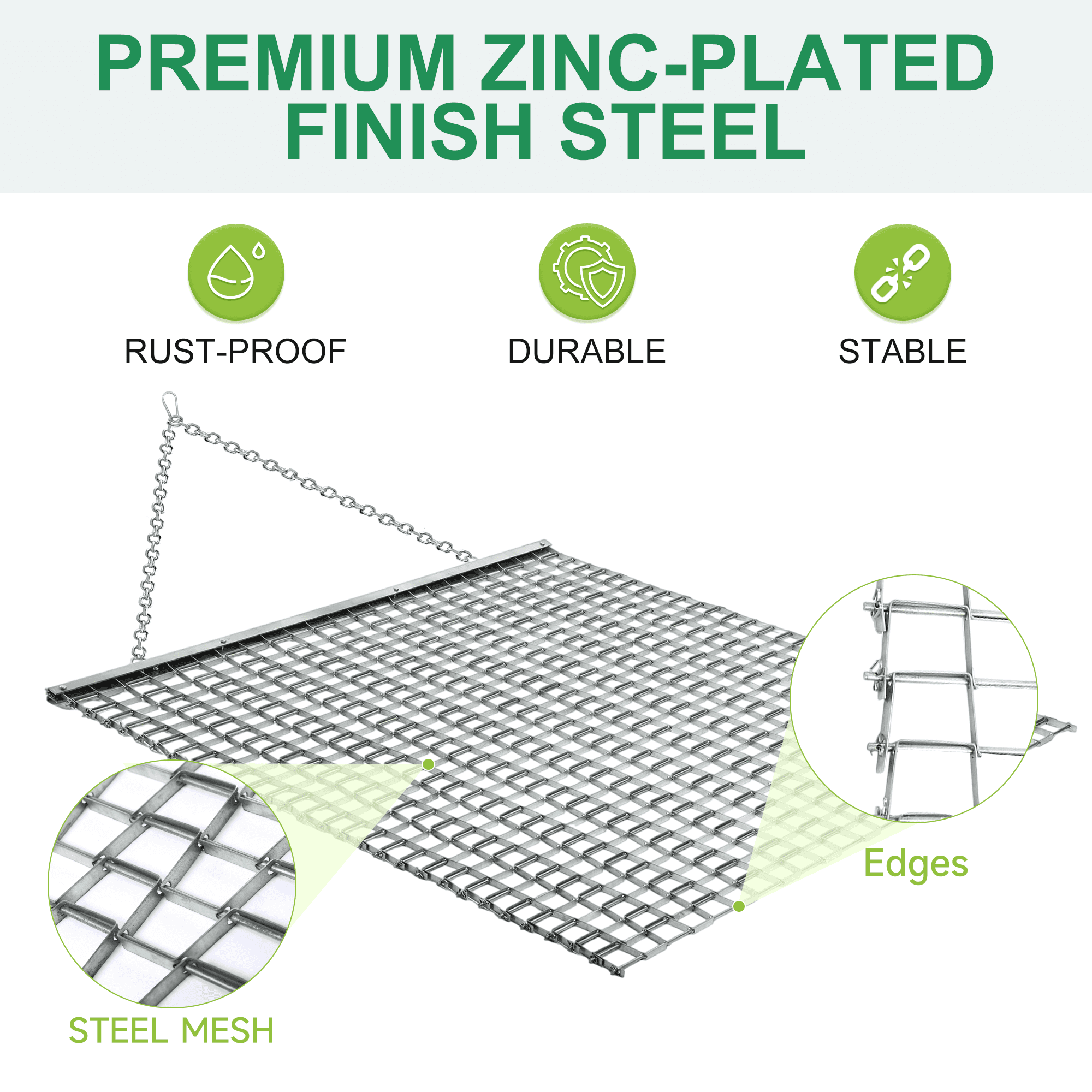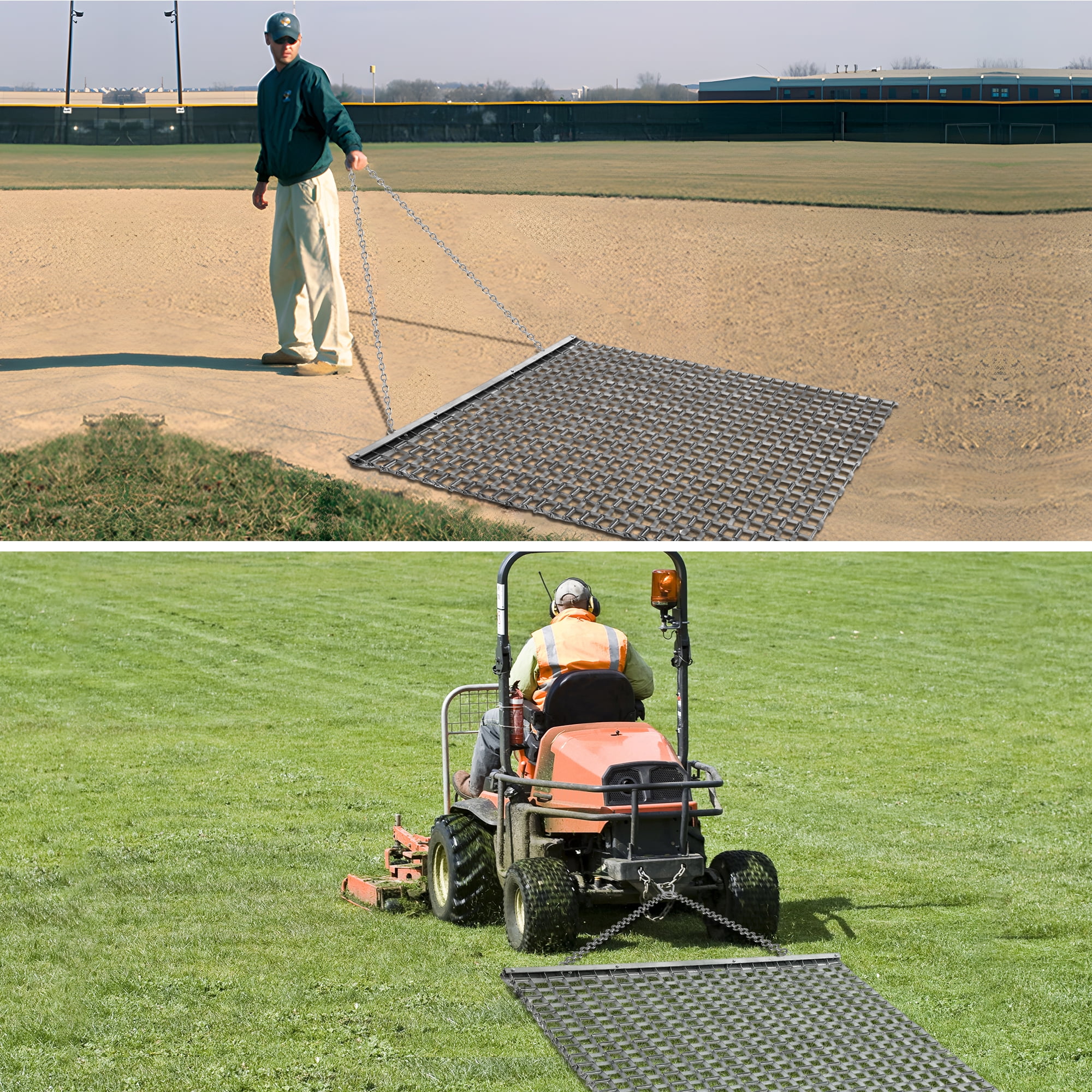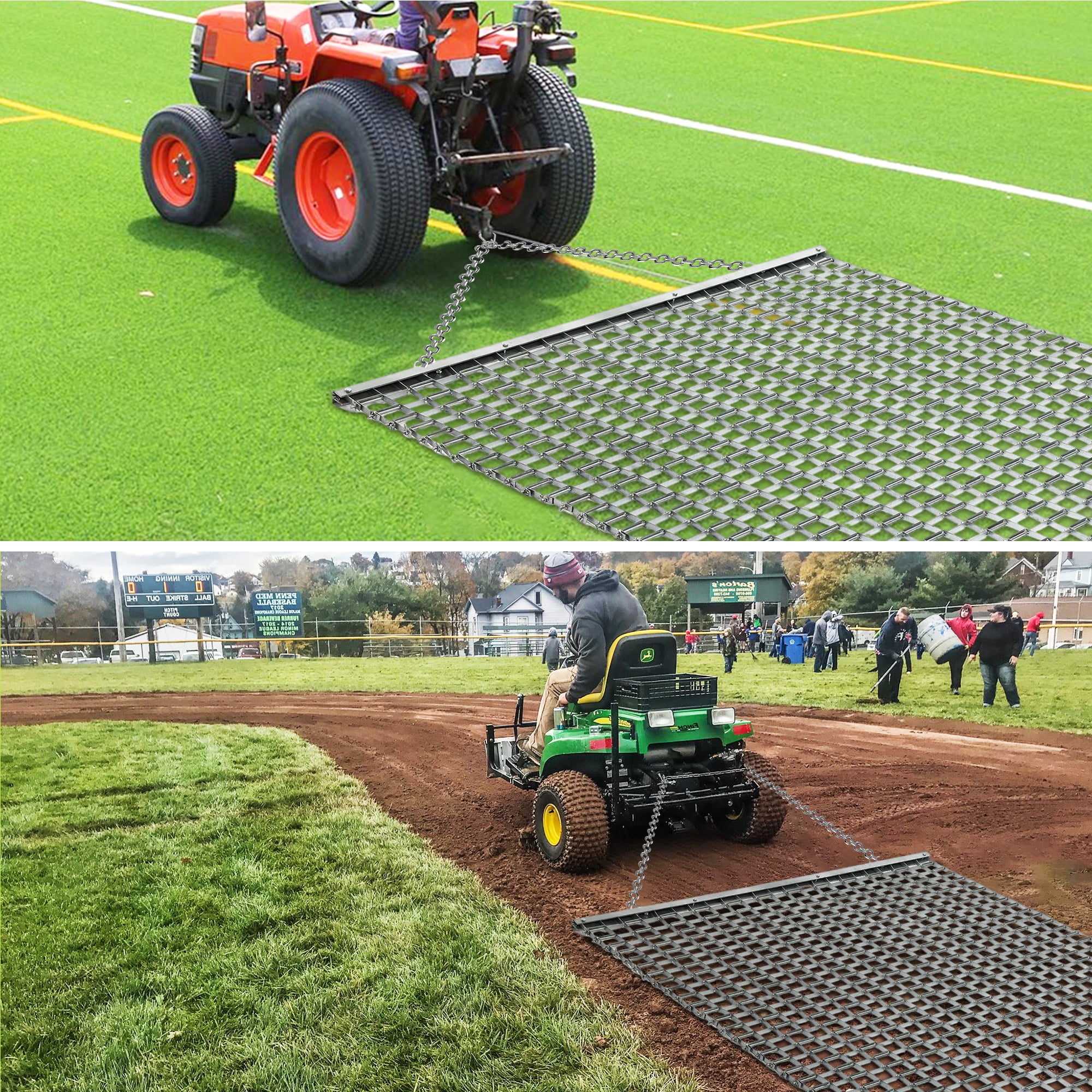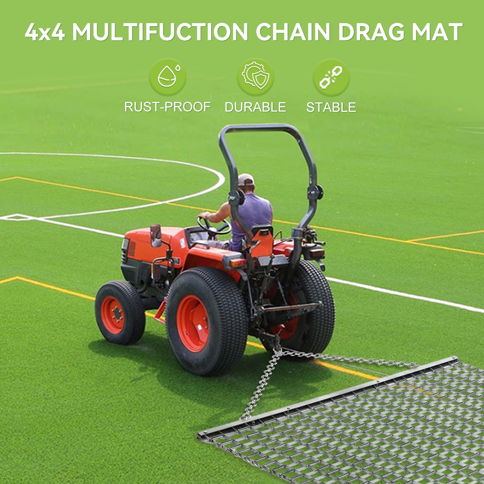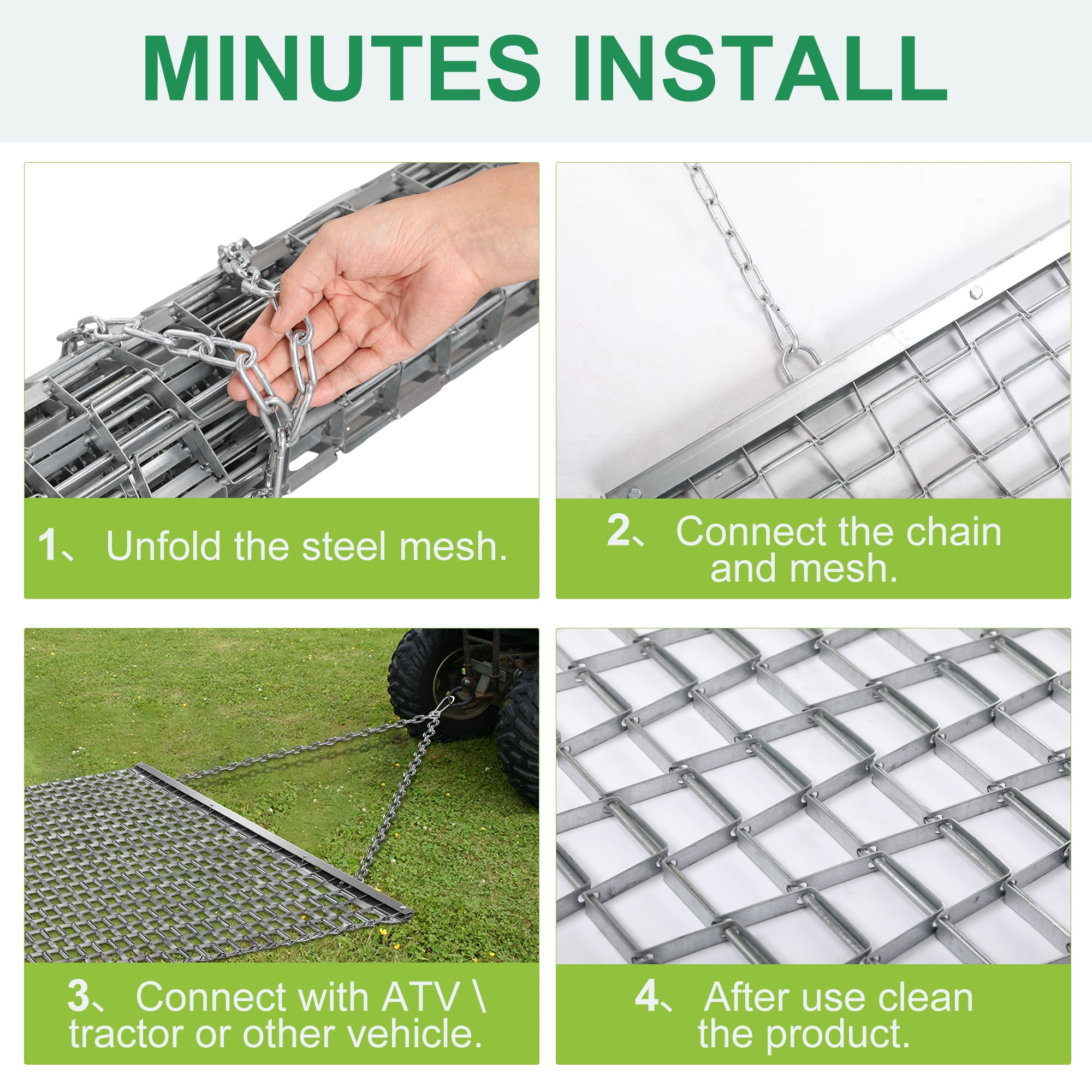 【ATV/UTV 4 x 4 Football Baseball Softball Field Drag Mats, Lawn Leveling Steel Mesh Zinc Plated Heavy Duty Durable Field Surface Leveling Drag Mat for Manual or Vehicle Driveway Farm Garden Base】 DURABLE STEEL CONSTRUCTION, SUITABLE AS TRACTOR ATTACHMENTS, MULTI SURFACE LAWN LEVELING TOOL, SIMPLE TRANSPORTATION & STORAGE. How to install the drag mat: 1. After opening the package, first open the bundled iron chain and unfold the drag mat. (Warning: handle with care to prevent the mat from scratching your hands) 2.Connect the chain and mesh. 3.Connect with ATV/TRACTOR or other vehicle. 4.Clean the product when not in use for a long time. Package Included: 1.Drag mat x 1 2.Drag Chain x 1 3.Plug x 1 4.Connect Ring x 2