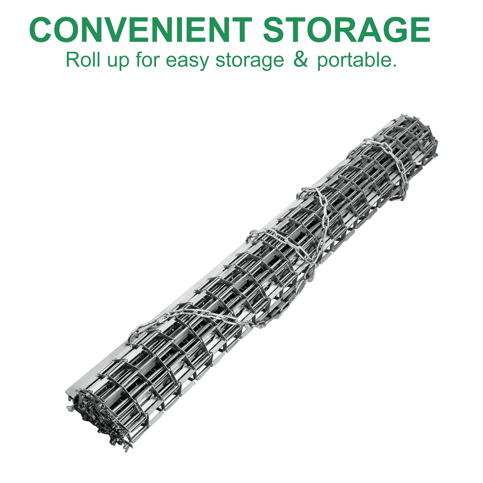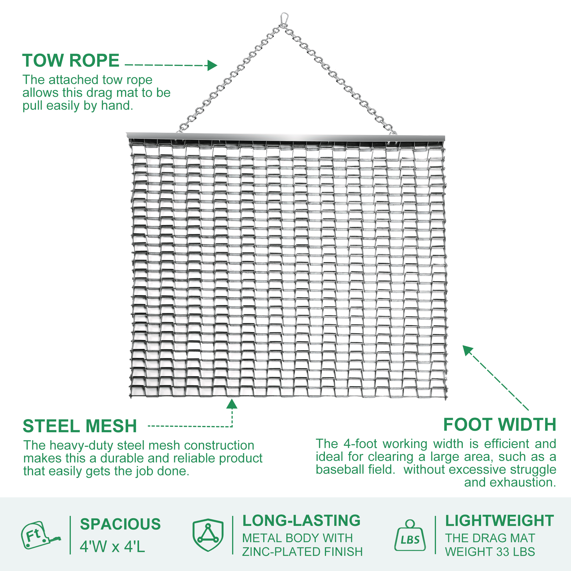 DURABLE STEEL CONSTRUCTION: Our drag mat is made from premium-grade heavy-duty galvanised steel construction, the field drag combines unrivalled performance with excellent longevity, as it is fully rust and corrosion resistant. SUITABLE AS TRACTOR ATTACHMENTS: This 4 x 4 foot baseball field drag comes with chain and plug which easily attaches on to any style of tractor ATV, UTV, even can drag the mat manually by hand. MULTI SURFACE LAWN LEVELING TOOL: This lawn drag is perfect for levelling the playing field, can be used on a wide variety of surfaces, such as driveways, baseball diamonds, golf fairways, grading fine soil, clay tennis courts, soccer pitches and more. SIMPLE TRANSPORTATION & STORAGE: 4×4 drag mats, efficient and ideal for clearing a large area, such as a baseball field, without excessive struggle and exhaustion. You can roll up the product for easy portability when you are not using it or transferring it. The product uses galvanized materials and will not rust even if it is stored for a long time. According to needs, no more than 50 pounds of heavy objects such as tire stones can be added to the mat to make the mat work more efficiently.