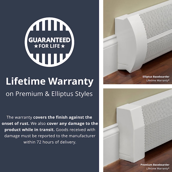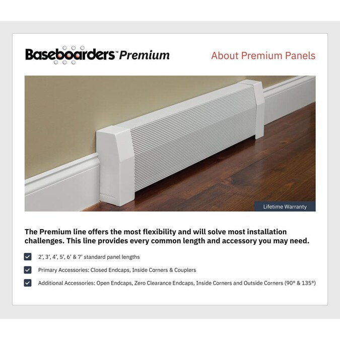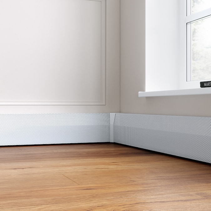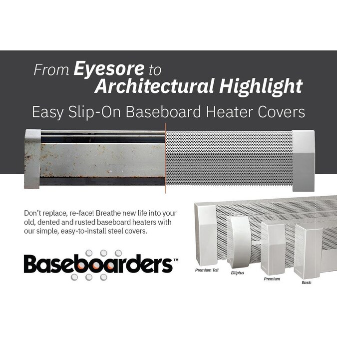 The easy slip-on baseboard heater cover that instantly rejuvenates ugly old, yet perfectly functional baseboard heaters. Baseboarders are the only one-size fits-most perforated steel baseboard heater covers that just slip over your existing baseboard heaters. Only the original front plate and end caps are removed/recycled. Installation takes a couple of minutes and does not require the use of tools or hired help. The one-piece design uses heavy-duty 22 gauge (0.033 in. thick) galvanized steel that stands up to years of physical and chemical abuse. The pristine semi-gloss white powder coated finish can also be painted with a color of your choice using a roller or spray can application for a custom look. Baseboarders are considered child safe for their complete lack of exposed sharp edges while blocking access to the heating element from the top. Baseboarders can also be installed in new construction environments or when the original covers have been completely removed and all that remains is the bare finned tube heating element.