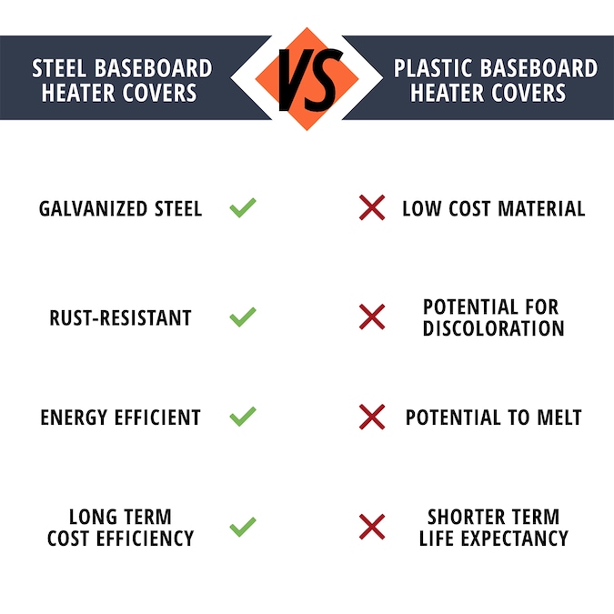 - Galvanized steel baseboard heater cover with a powder coated semi-gloss white finish