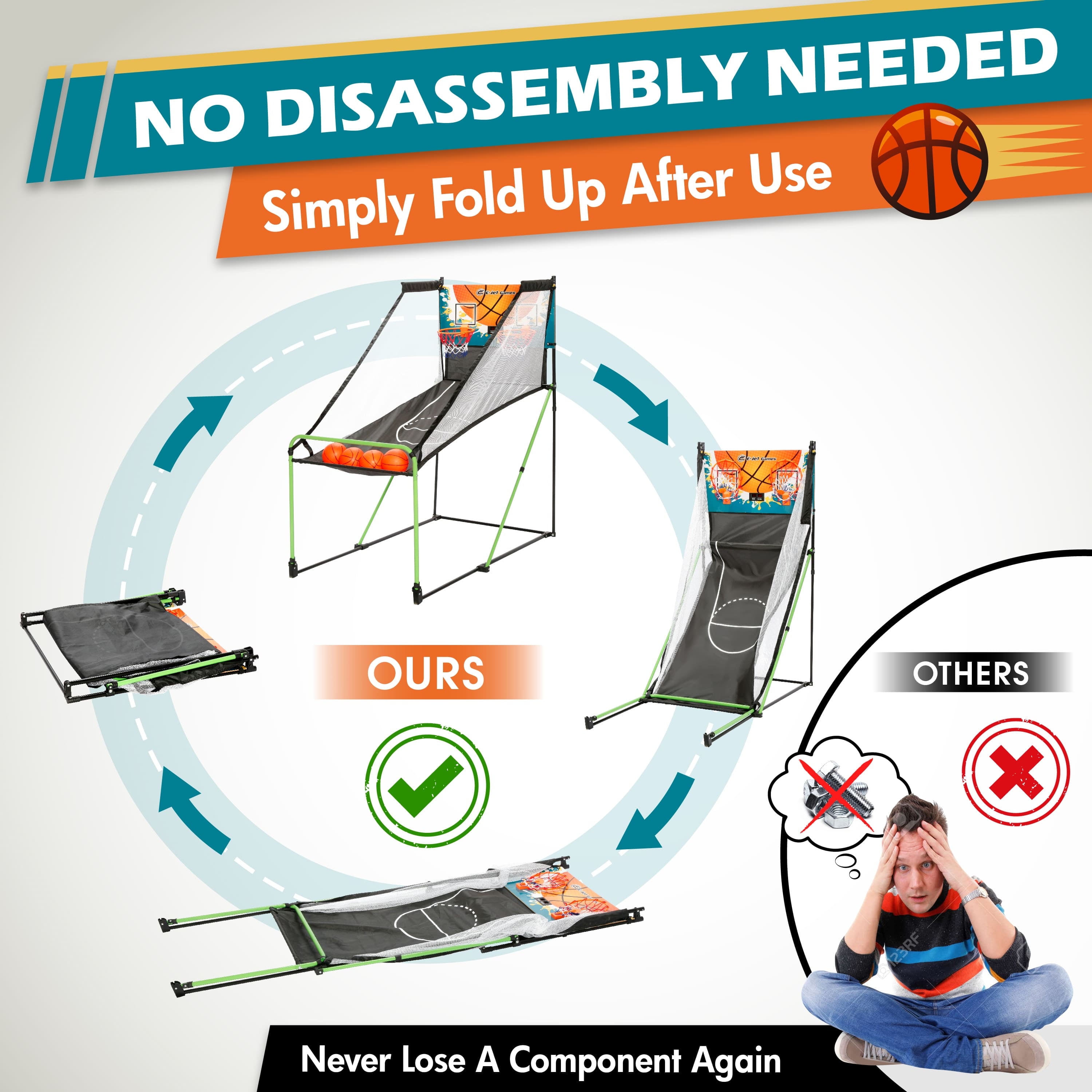 Kids are so bored at home and found nothing to do? E-Jet Games Electronic Basketball Arcade Game is the best game for kids both indoor & outdoor. Give them a set of this electronic basketball arcade game and surprise them this year! Featured in foldable design that allows you to bring it anywhere for fun, and save space for storage. It is collapsible so that you can fold it down effortlessly. More importantly, the quick setup function let you start your instant game anywhere, anytime. You can even zip it into the back of your SUV car and bring it to almost everywhere for game. Place it in your living room for some exercise after dinner, move it to your bedroom for individual practice before showing off to your friends about your flashy skills, or put it in your own backyard for your kids to play. Speaking of family day, it doesn’t always have to be sitting in front of TV. Having a little competition could also be a great idea for keeping your entire family healthy in a fun and entertaining way. The basketball arcade game is specially designed for 2 players, let your kids have fun with their friends with our basketball arcade game safely at home, also particularly suitable for the entire family to have some family competition after dinner or during your precious family day. Bringing kids to visit their grandparents might be a terrible nightmare for every parent, it’s just so hard to find something for kids to kill time! Now you have our basket arcade game. It is able to fold into a suitable size that lets you easily take it with you to their grandparents house effortlessly. If you’re finding the best gift for your kids & family this year, this basketball arcade game will be your perfect choice. Believe me, it’s worth anything just to see kids smile. Product Details: (1) Well-made Basketball Frame (4) Kid-sized Basketballs, Dia. 5″ (1) Exclusive Carrying Bag, 80 x 80 x 9cm (1) Instruction (1) Air Pump, 4″ Assembled: 60″ x 30″ x 60″ (L, W, H) Folded: 31″ x 4″ x 31″ (L,W,H)