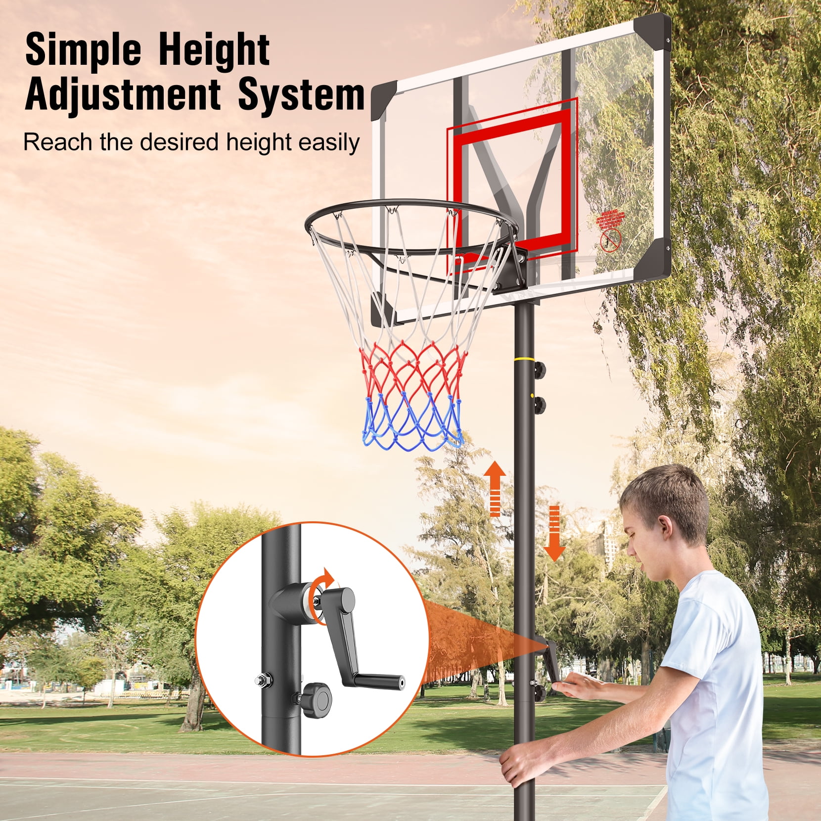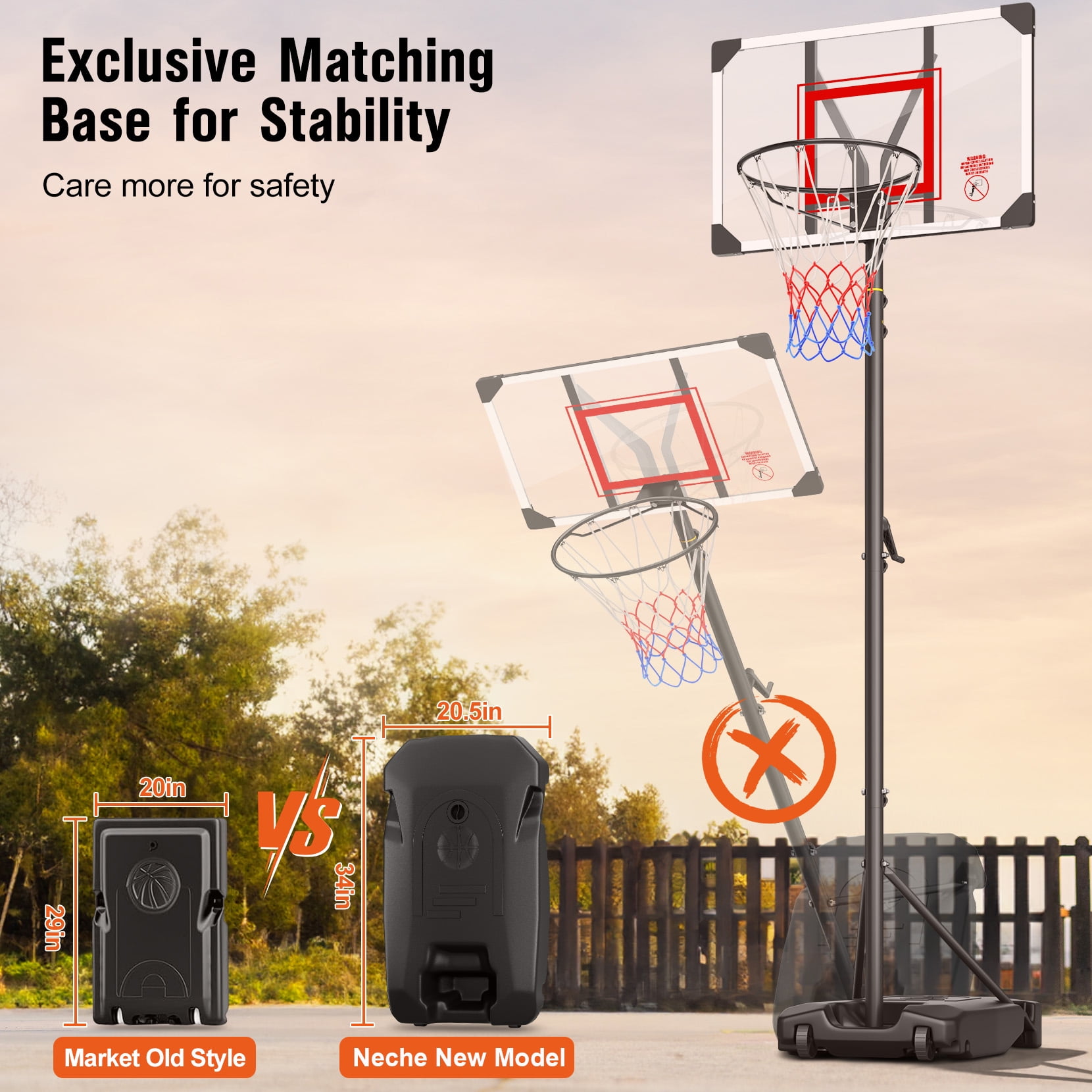 ⛹[CONVENIENT QUICK ADJUSTMENT HEIGHT ROCKER 5.05FT-8.53FT]: With with quick-adjust rocker and raised maximum height 8.53ft, The kids basketball hoop outdoor is truly fit for growing kids. 5.05ft to 6.5ft with two poles installed, 7.05ft to 8.53ft with three poles installed. ⛹[ENLARGED BASE & PC BACKBOARD FOR STABILITY&DURABILITY]: In order to provide enough support to match the raised maximum height, we enlarged the base which could be filled with water or sand up to 93lbs. Plus, we also enlarged the PC backboard for better durability and shooting the ball. ⛹[CUSTOMIZED FOR KIDS]: The basketball goal provides entertainment for kids after school and distraction from technology for more exercise. Kids will enjoy shooting and learning the basketball game easily. Designed with sturdy construction and vivid colors to make kids’ life full of fun. ⛹[USE AT OUTDOOR/INDOOR]: The built-in wheels at the front of the base make this hoop easy to move to any area like driveway, backyard, front yard, park, playground, garage, gym, inside the house, etc. ⛹[PERFECT GIFT FOR KIDS]: The Neche basketball hoop outdoor is a wonderful gift for kids to enjoy leisure time, go outside to play with friends!