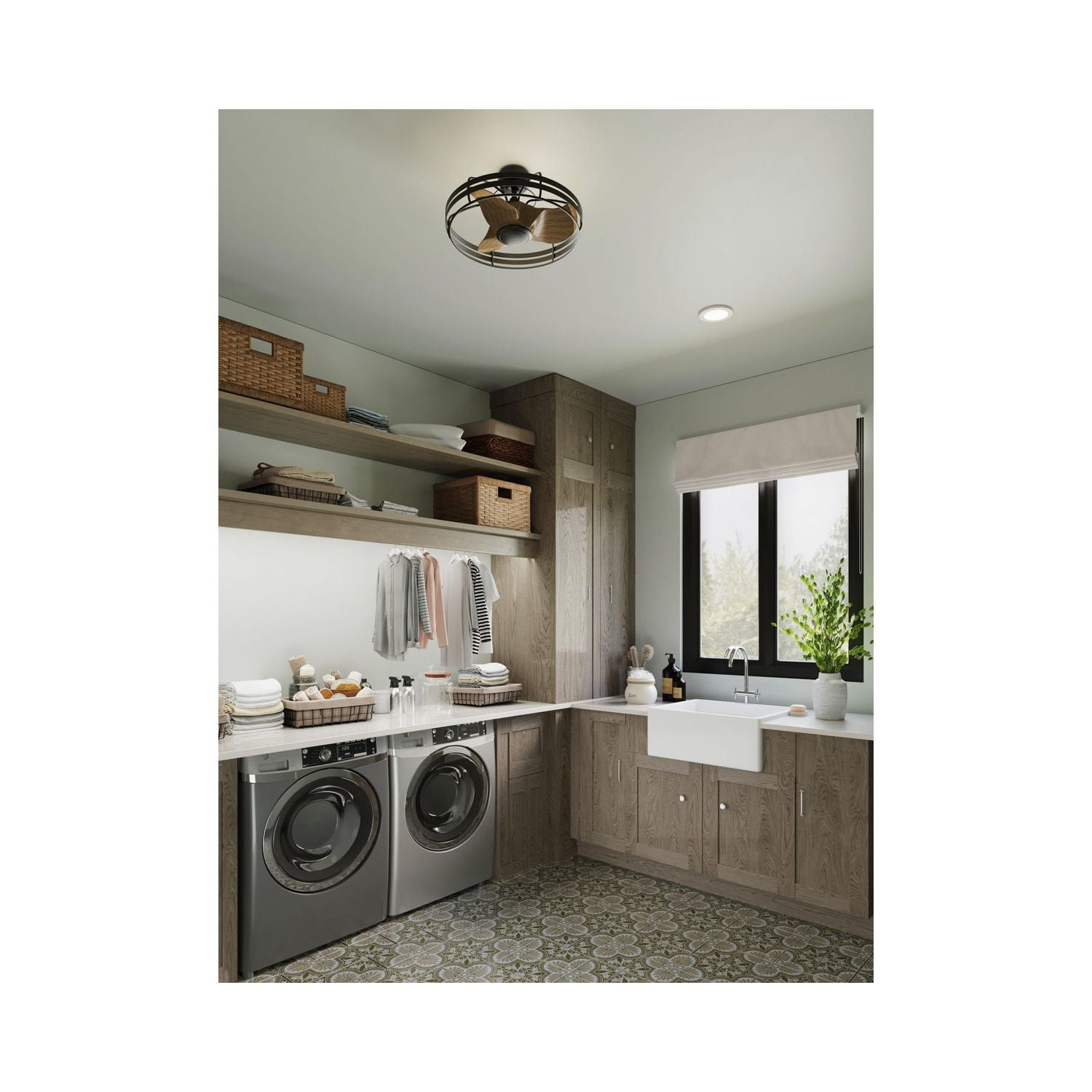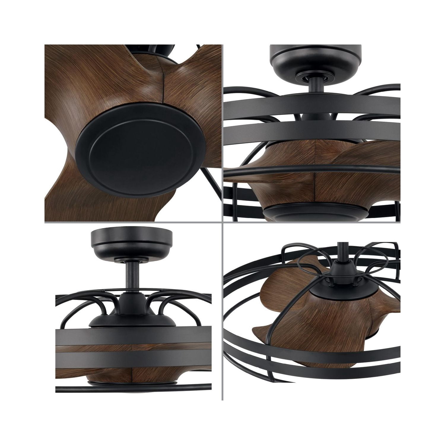 Cage-style fan is ideal for living rooms, bedrooms, dens, offices, patios, and porches Rustic industrial styling brings a vintage touch to transitional, urban industrial, rustic and vintage electric settings Three curved ABS fan blades for better air movement, blades are hand finished in an Aged Oak with an outer cage finished in Graphite Measures 26 in. Dia x 13.6 in. H Includes 3 speed handheld remote control with battery and wall bracket.