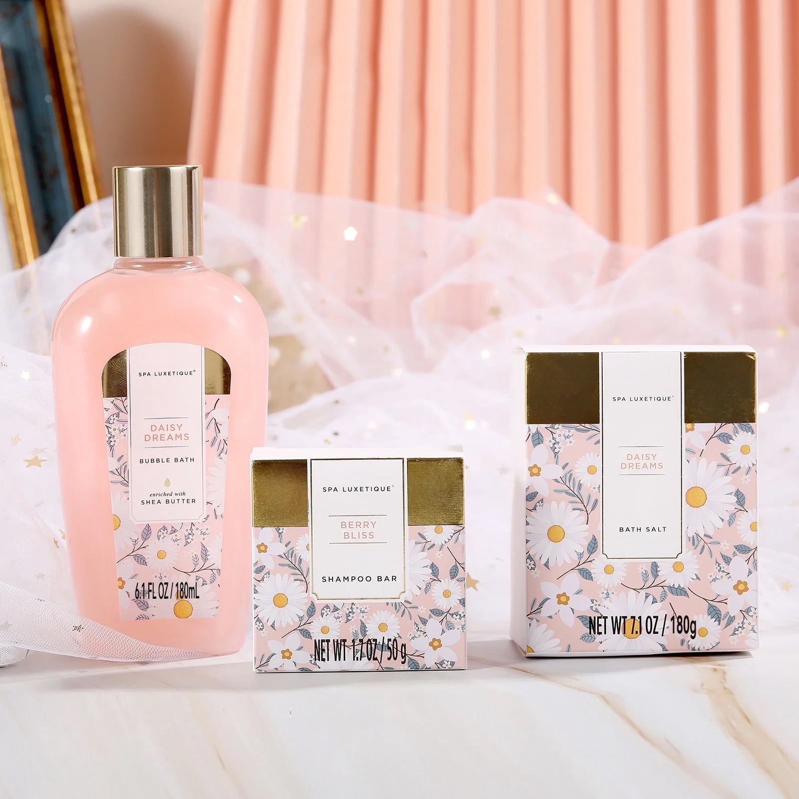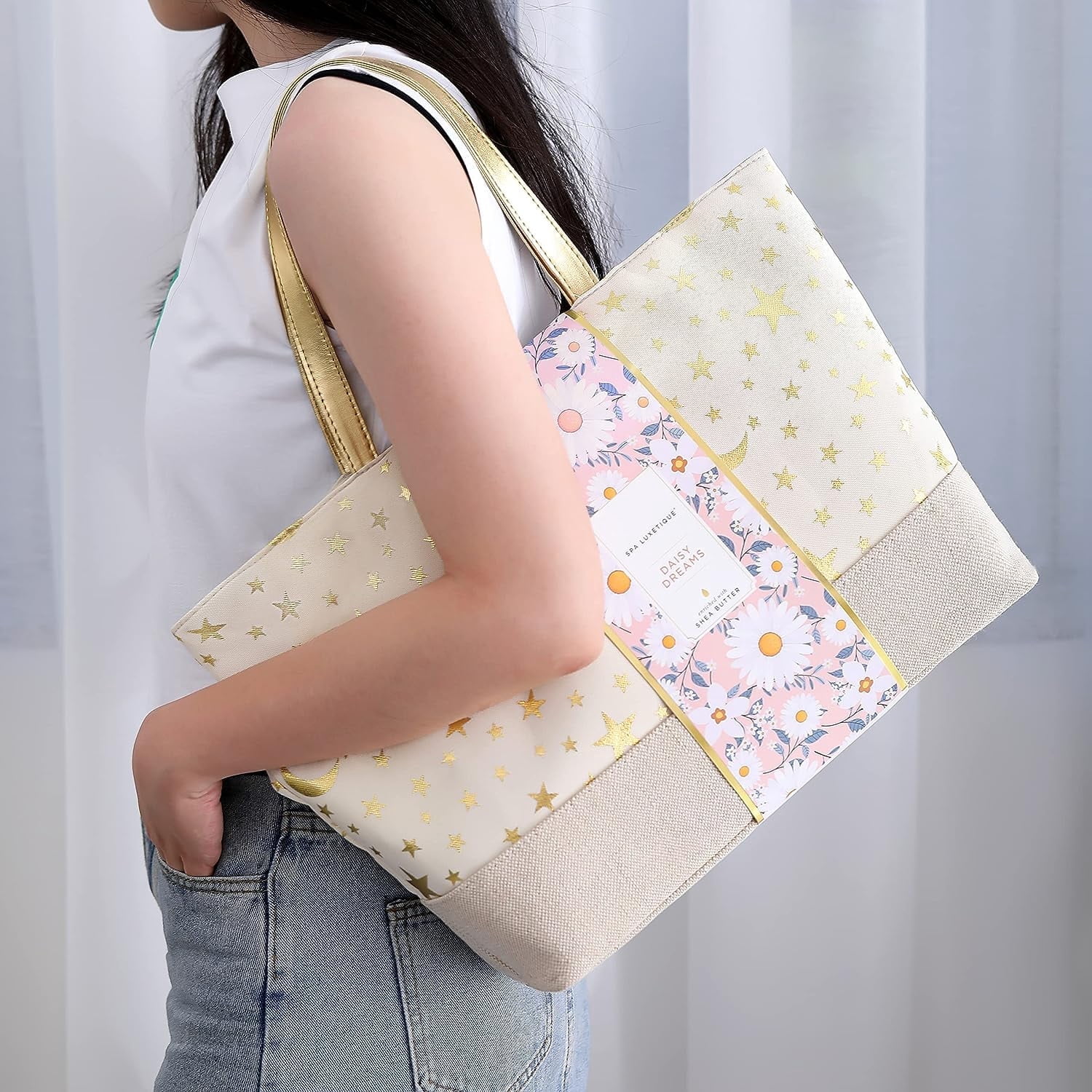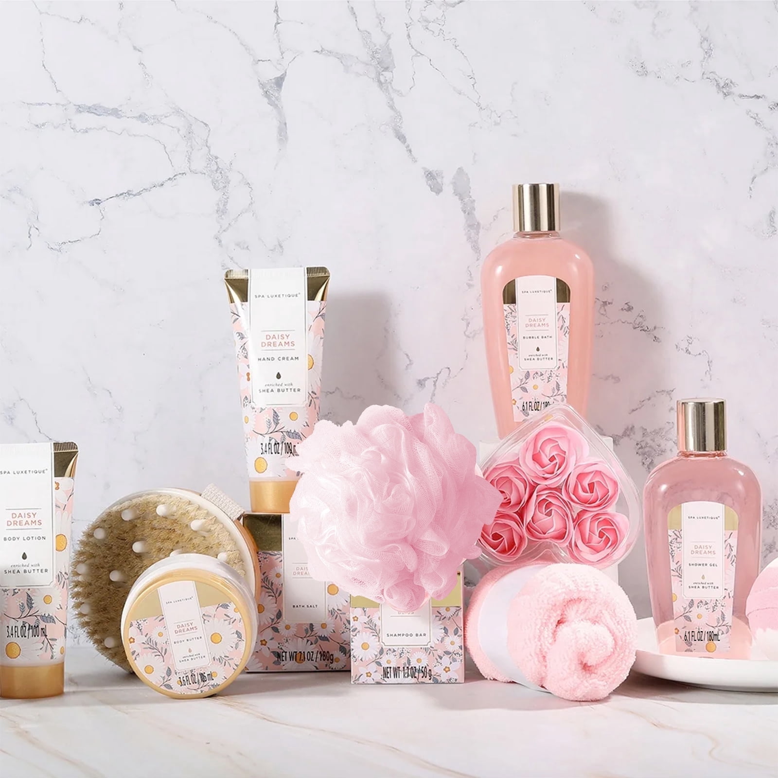 【Every Day Is a Good Day for Spa】 SPA Luxetique luxurious spa bag contains a variety of bath items to meet all your needs, and you can enjoy advanced spa treatment at home. 【Rejuvenate Your Skin】Don’t neglect your delicate skin, they deserve more attention. Clean gently, moisturize your dry skin deeply and lastingly with the natural and nourishing ingredients. 【Sweet Daisy Fragrance】Imagine opening it, you will smell a faint sweet daisy fragrance, the whole bathing time is surrounded by a sweet atmosphere, every woman will enjoy and relax it. 【Luxurious 15pcs Home Spa Set】Item includes: Shower Gel, Bubble Bath, 6 Soap Petals, Hand Cream, Body Lotion, 2 Jelly Bath Bombs, Body Butter, Bath Salt, Essential Oil, Shampoo Bar, Pouf Sponge, Shower Cap, Body Brush, Cloth Tote Bag. 【Make Your or Her Heart at First Sight】Our beautiful gift bag of bath is made of durable burlap and oxford cloth. A wonderful present for Birthdays, Holidays, Anniversaries, Christmas, Valentine’s Day and Mother’s Day.