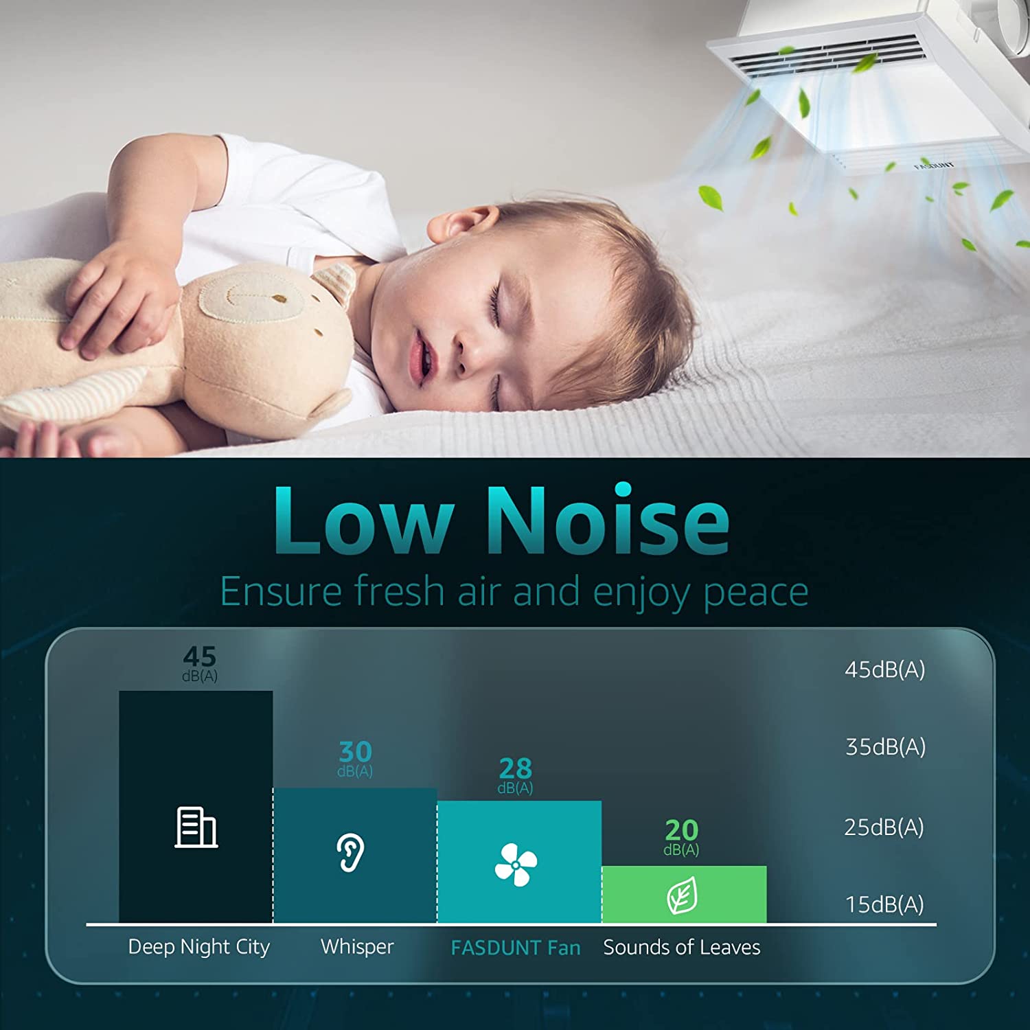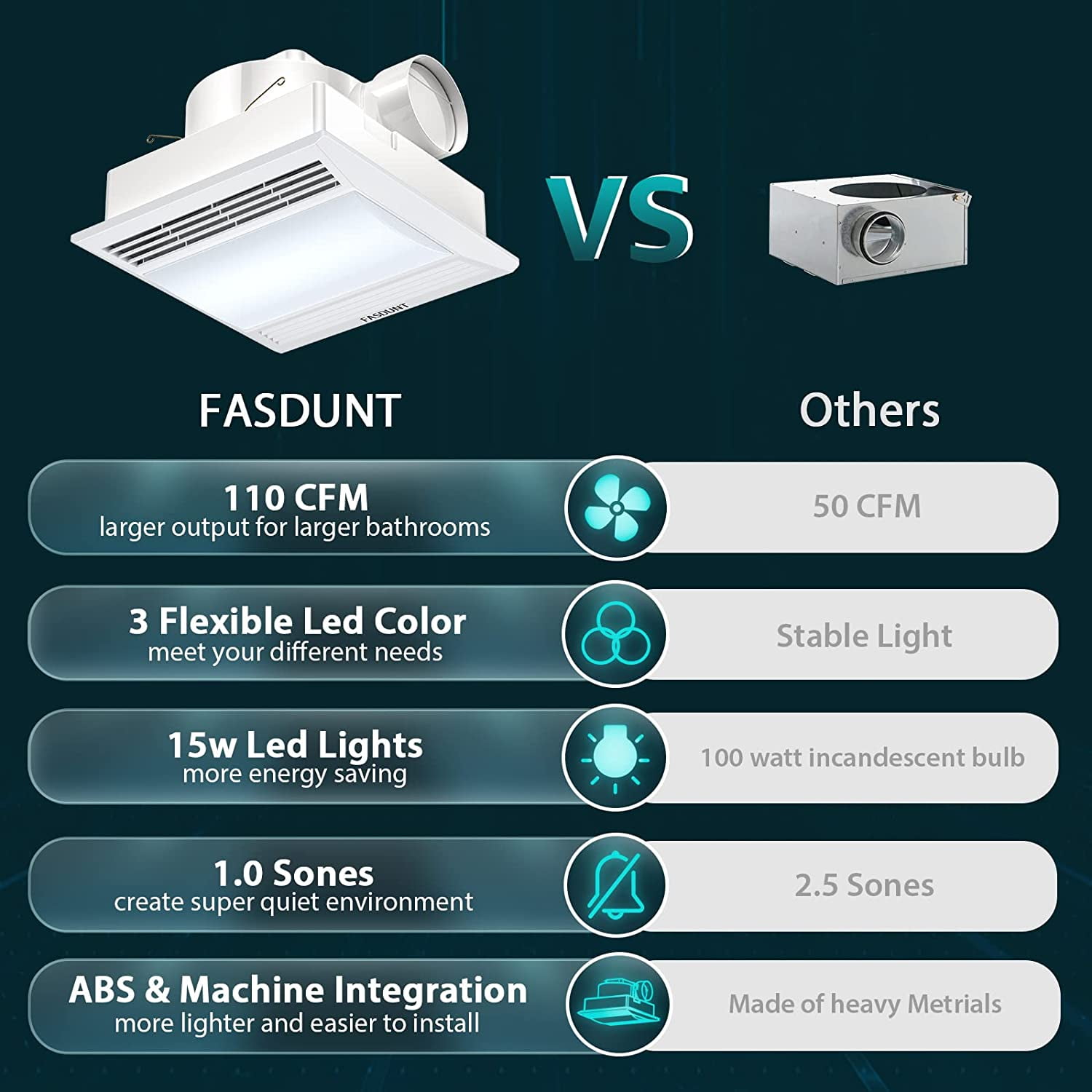 TRANSFORM YOUR BATHROOM Upgrade your bathroom with DOQAUS’s ultra-quiet ventilation fan and light combo. Say goodbye to fog and odor and hello to a fresh, clean space.&; EASY INSTALLATION Our ABS material design makes it lighter and more durable, with fewer installation steps. Detailed instructions and videos help you complete the installation quickly. Fits ceiling openings of 10.43 x 10.43 inches / 26.5 x 26.5 cm (L x W)&; EFFECTIVE VENTILATION With a powerful air volume of 110 CFM, our high-quality bearing motor is characterized by low power consumption, low-temperature rise, long life, high efficiency, and energy-saving. Perfect for rooms up to 105 sq. ft.&; 3 COLORS ADJUSTABLE Choose your favorite light color (Warm White/Daylight/Cool White) anytime with our 3 colors of LED light (3000K/4000K/6000K). Control the fans and lights through two wiring methods, independent control & unified control. Comes with beautiful and thicker packaging for better protection.&; ULTRA-QUIET Our 1.0 Sones sound rating for the bathroom ventilation fan is ultra-quiet when working. Made with advanced technology and a high-performance spiral centrifugal impeller, our fan easily removes odor and humidity with its powerful ventilation capacity&;