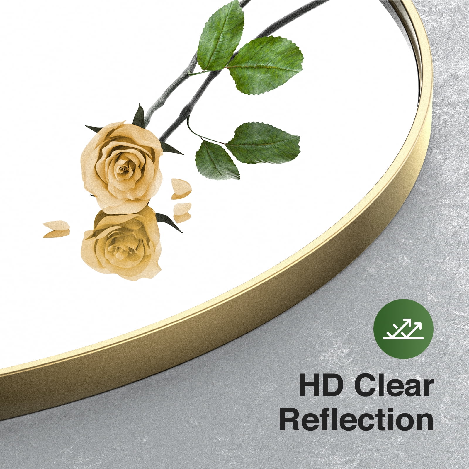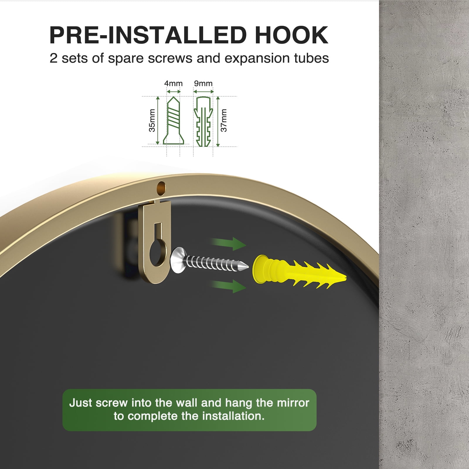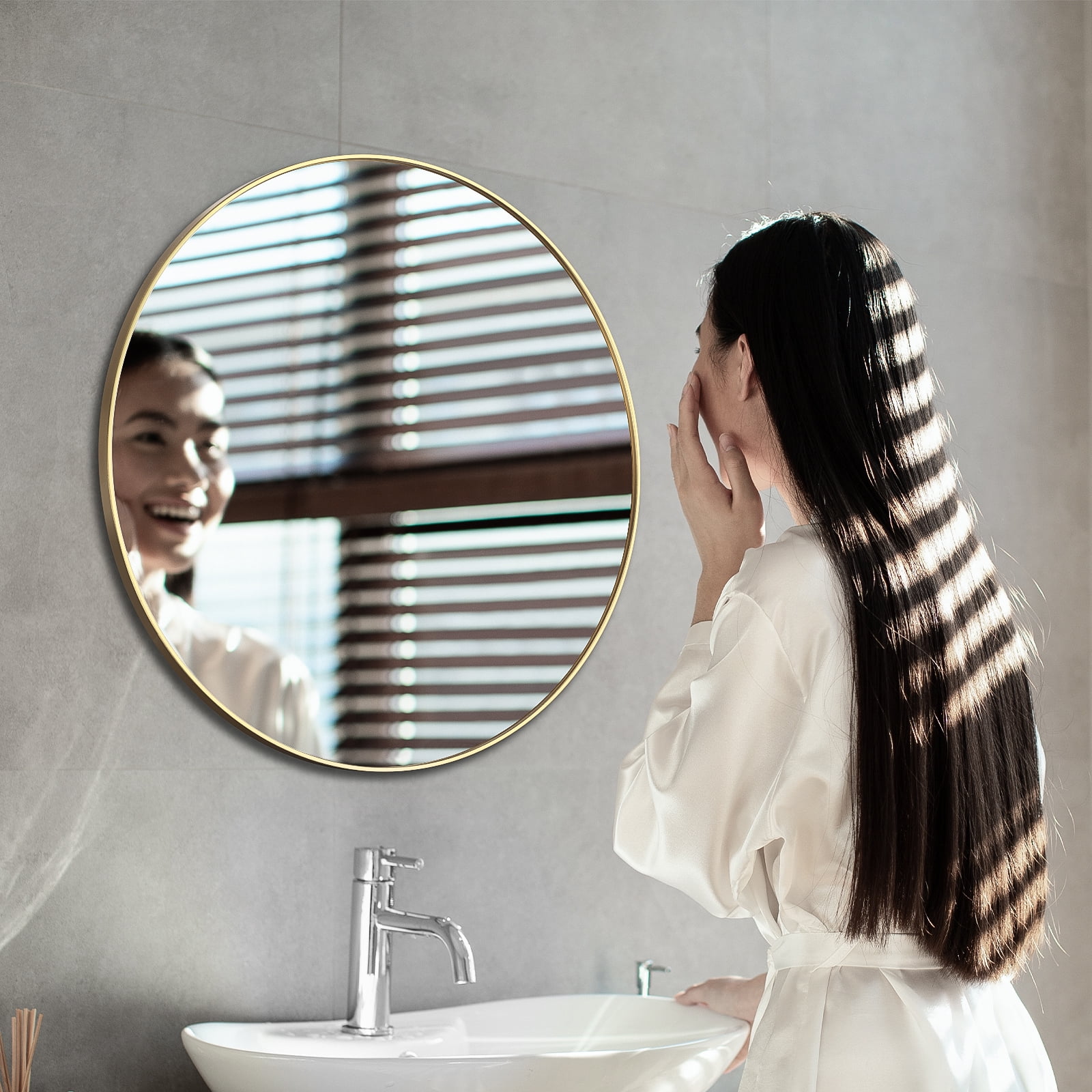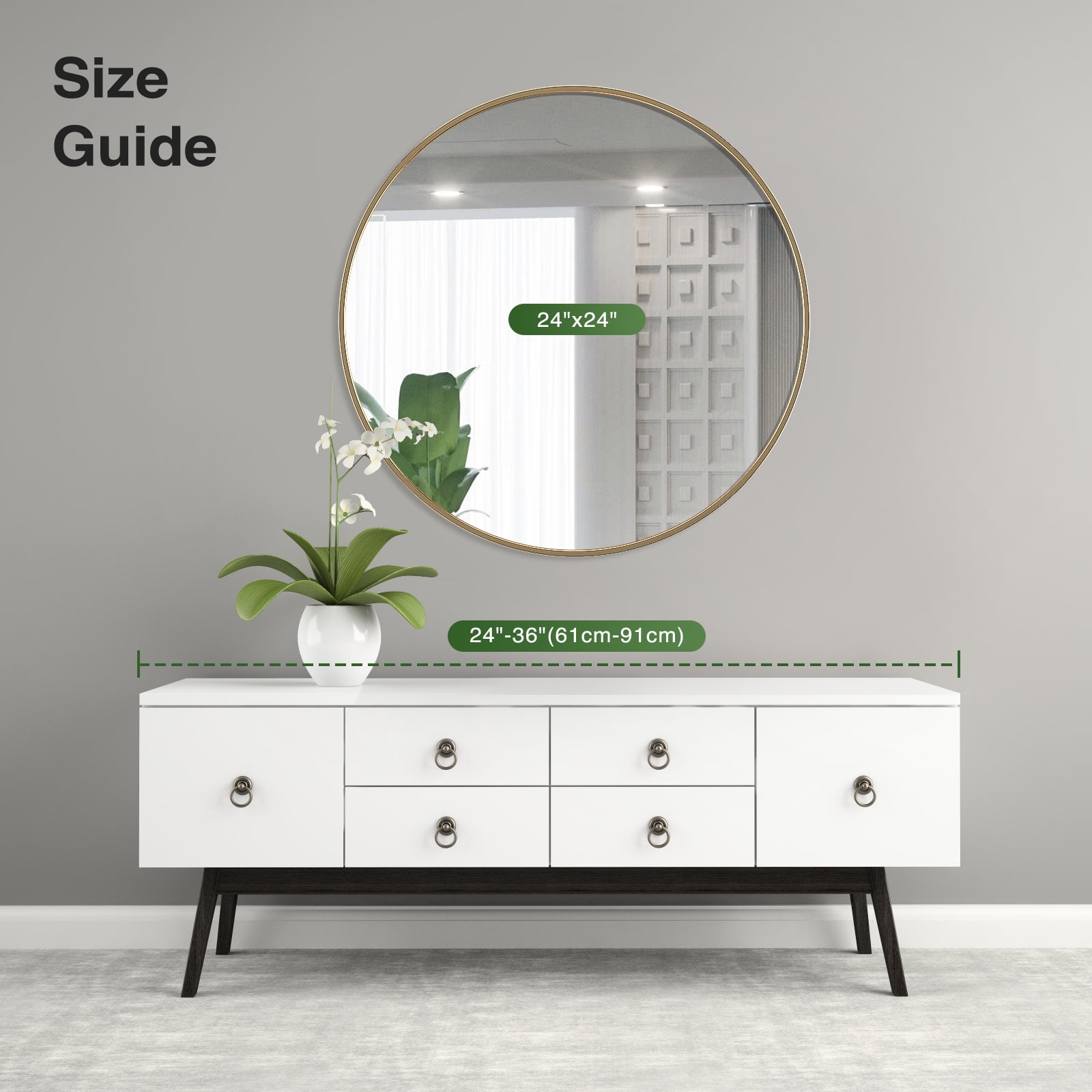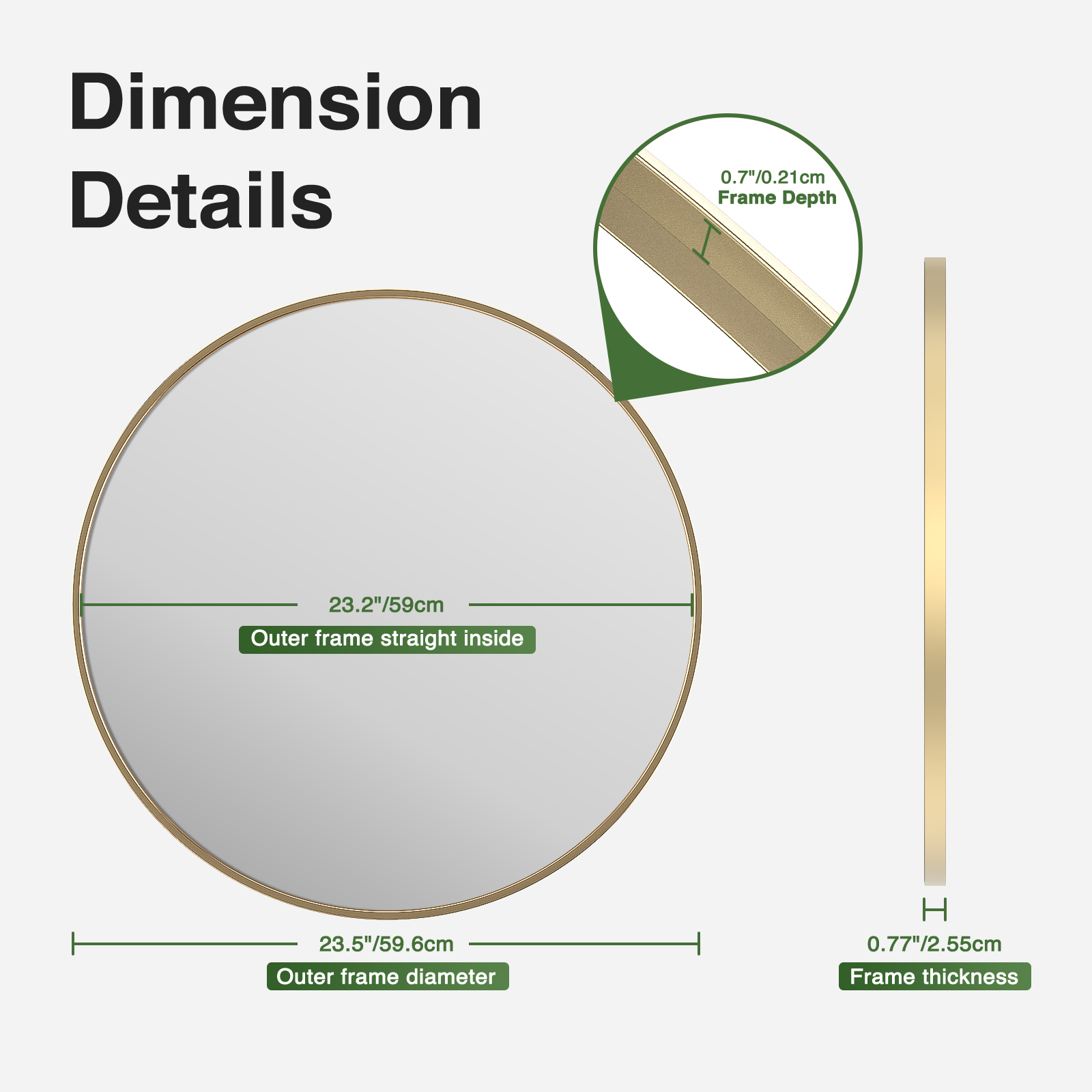 【Mirror Size】Circle 24*24 inch . It can visually make your home more spacious The wall mounted mirror provides a crystal-clear, distortion-free reflection. A best choice for your entryway,bedroom, living room wall decor or over a dresser. 【Excellent Design】This round wall mirror is designed with a kind of fashion and modern industrial style. The frame is made of brushed gold metal with an angled design to protect the mirror. Besides, the gold mirror is anti-stripping, anti-cracking and anti-water,and it is safer and more premium than traditional recessed frames. 【Modern Brushed Metal Frame Mirror】The classic clean and round lines of this frame mirror accent any room or hallway in moden style. Suitable for using in bathroom, vanity, farmhouse, bedroom, living room, dinning room, entryway, fireplace. A great decorative wall mirror choice.Featuring an ultra-thin (0.39 x 0.98 inch) metal frame in deep profile, you add depth to a room and give it more life. 【Easy to Install】Install the expansion screws (contained in the package) into two drilled holes, and then hang the mirror on the screws, which is easy to install quickly following the instruction. Please make sure that the mirror is mounted properly in order to ensure it is safe to use. If you have any problems , we will provide you with the professional answers. 【Worry-Free Purchase】We’ve strengthened our mirror package for safe delivery. If you find the round mirror was broken as arrived, please contact us to get a full refund or a free replacement