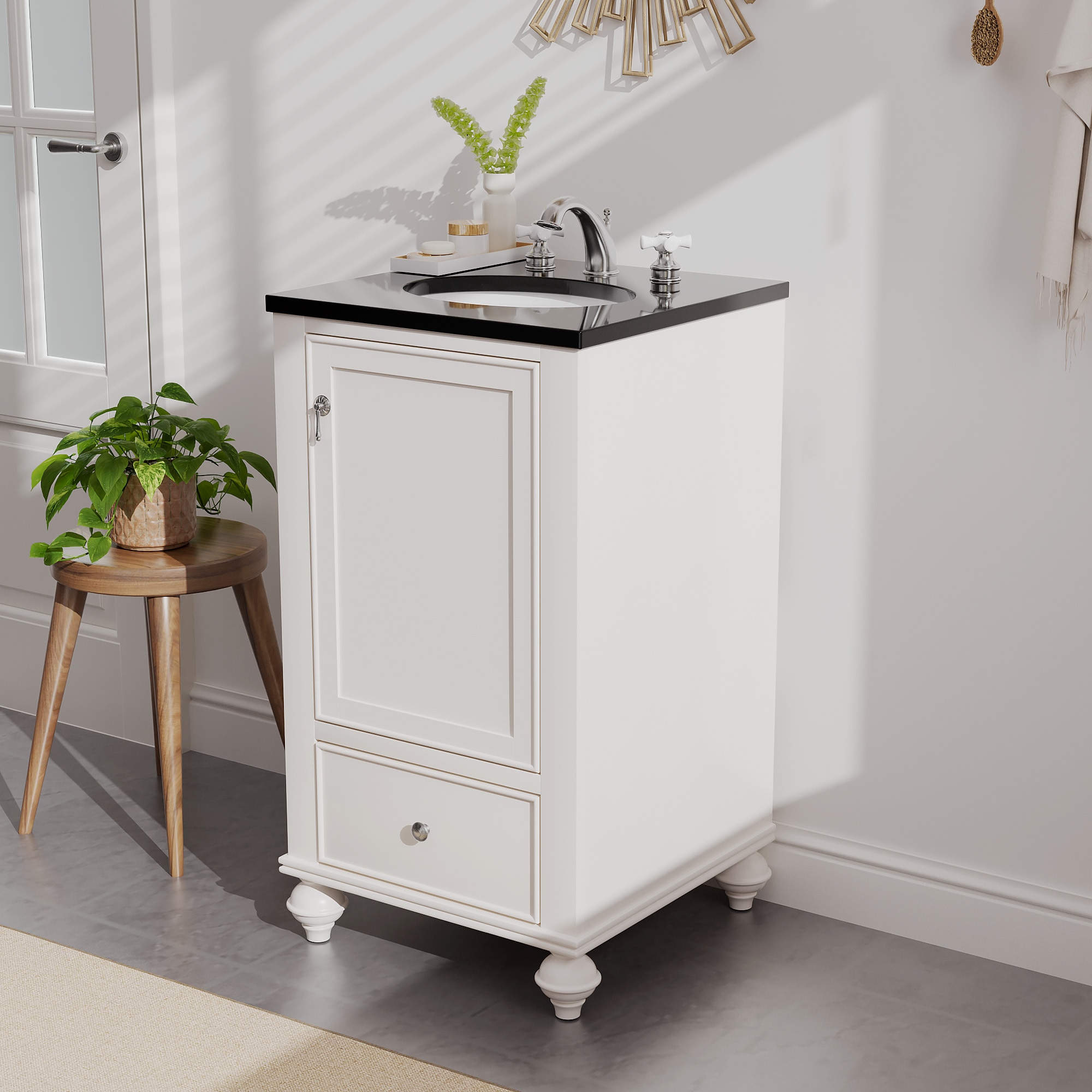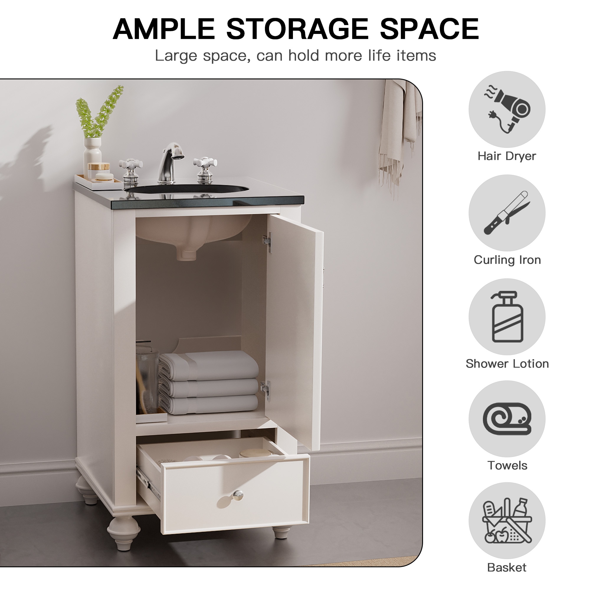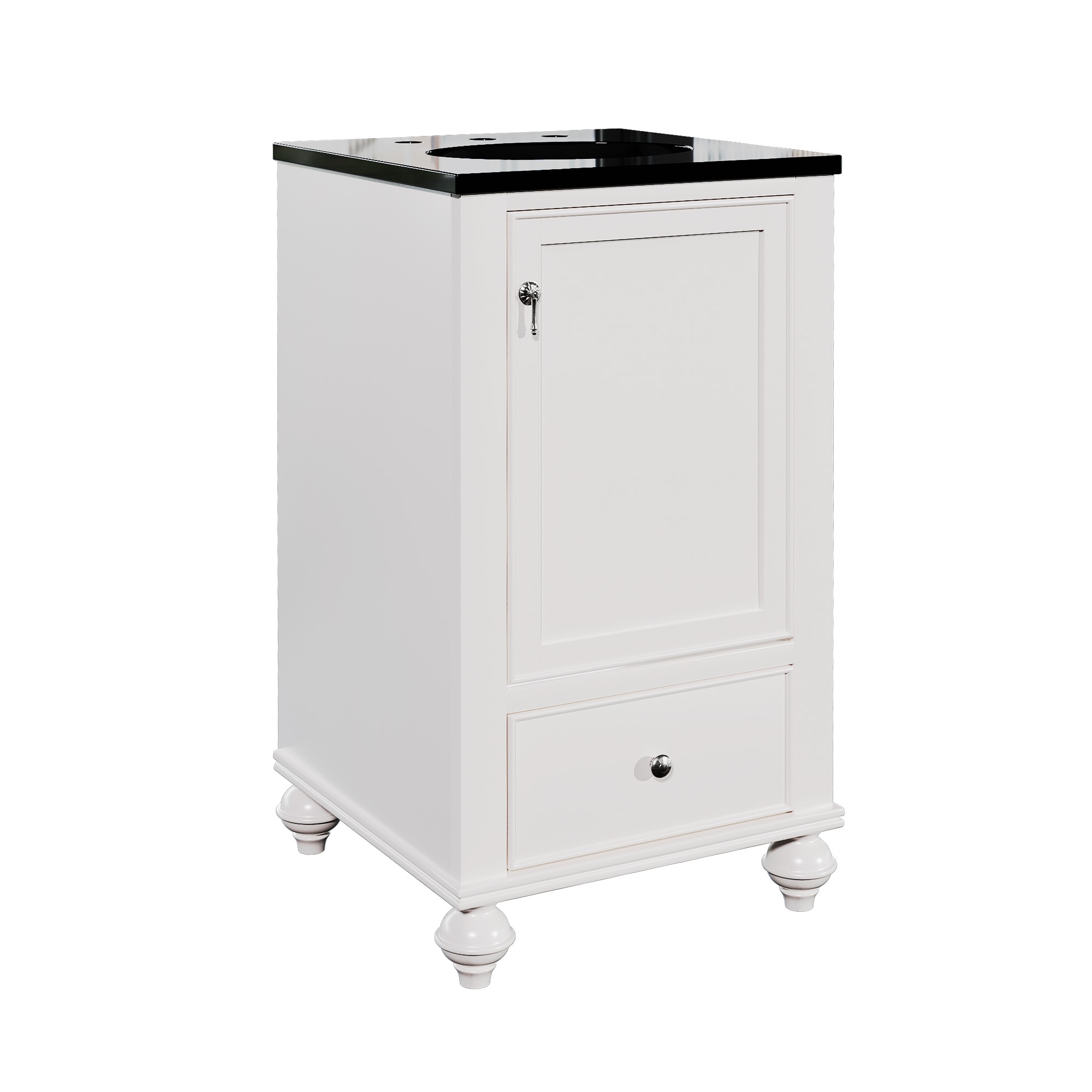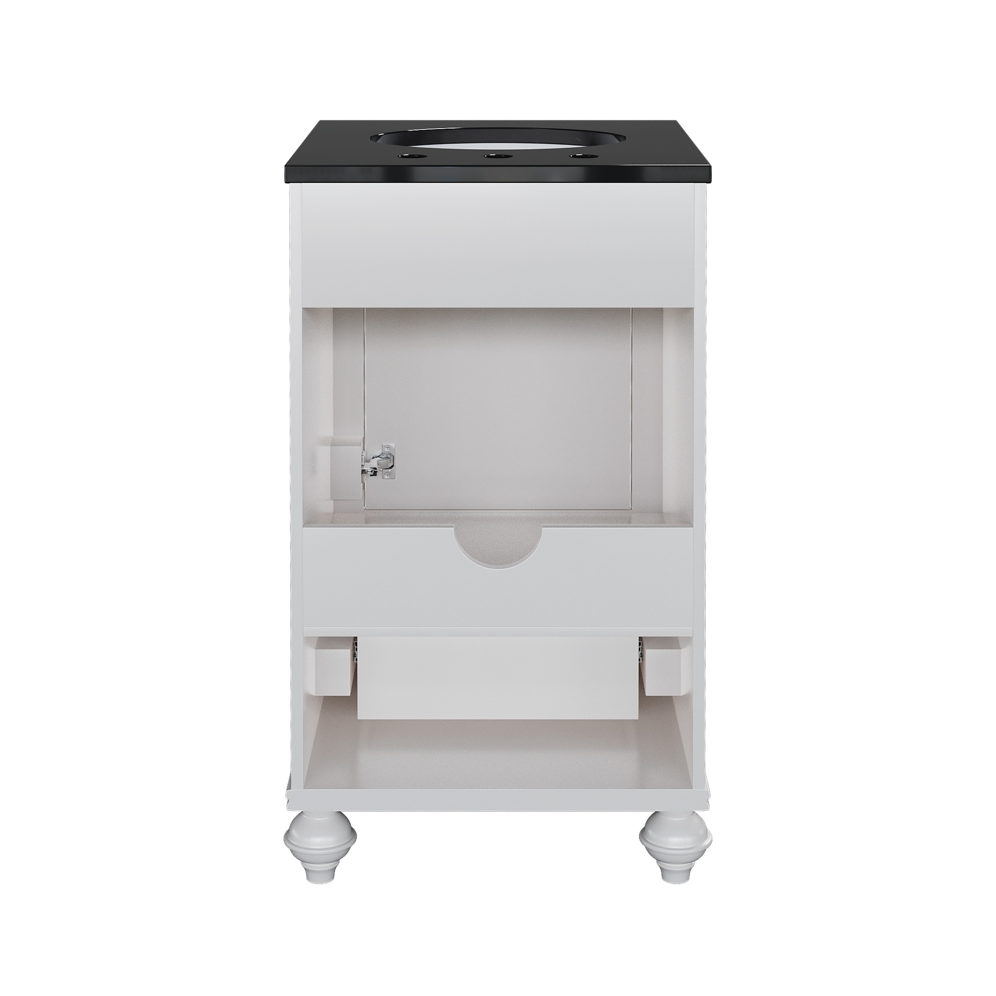 Discover our Classic White Bathroom Vanity — an exquisite blend of elegance and practicality. Its sleek black countertop contrasts beautifully with the pristine white finish, infusing sophistication into any bathroom. The convenient drawer and roomy cabinet offer ample storage, keeping essentials organized and your space clutter-free. Charming traditional legs add a touch of timeless appeal, making it a perfect fit for both classic and modern homes. Crafted for durability, this vanity isn’t just a purchase — it’s an upgrade. Transform your bathroom into a haven of style today!