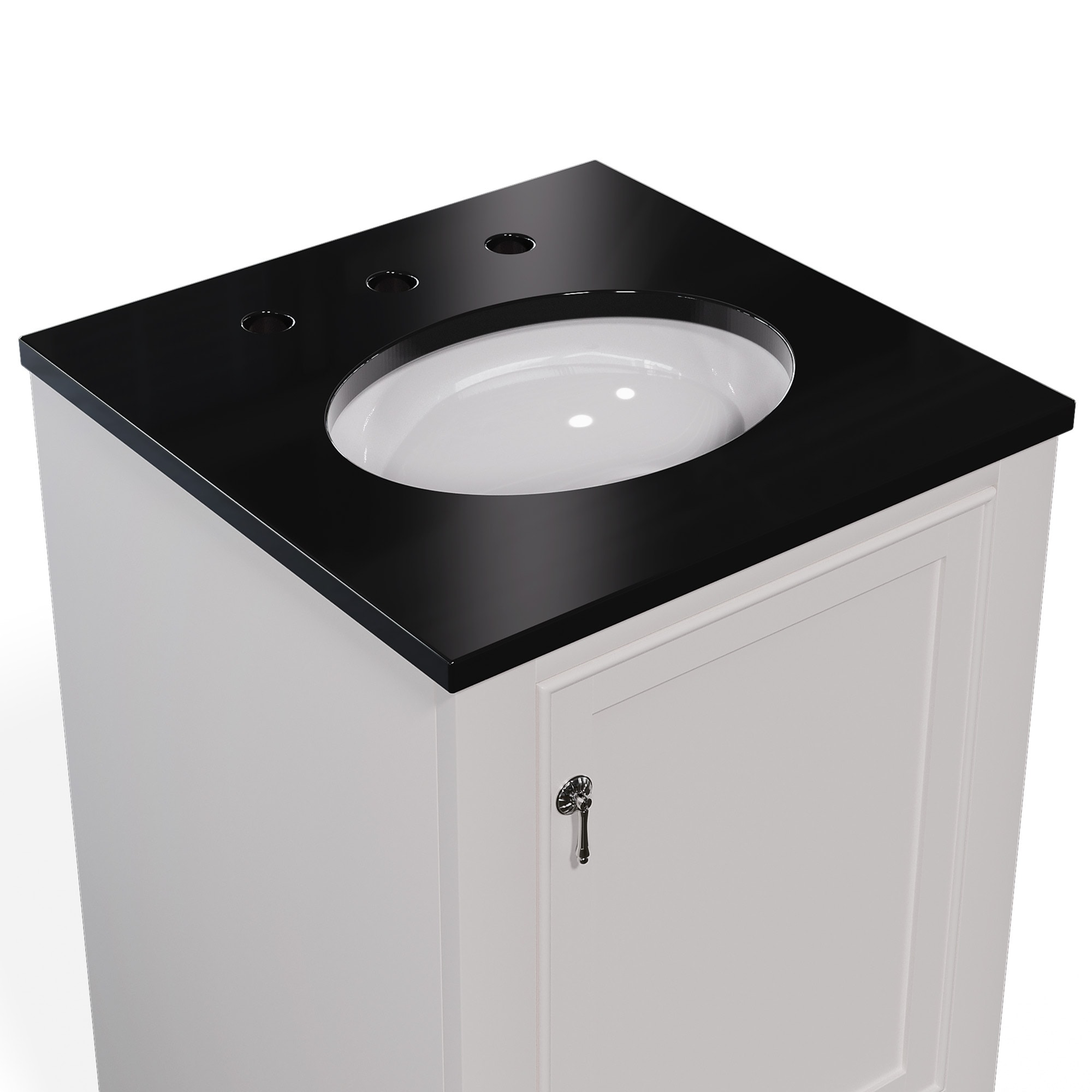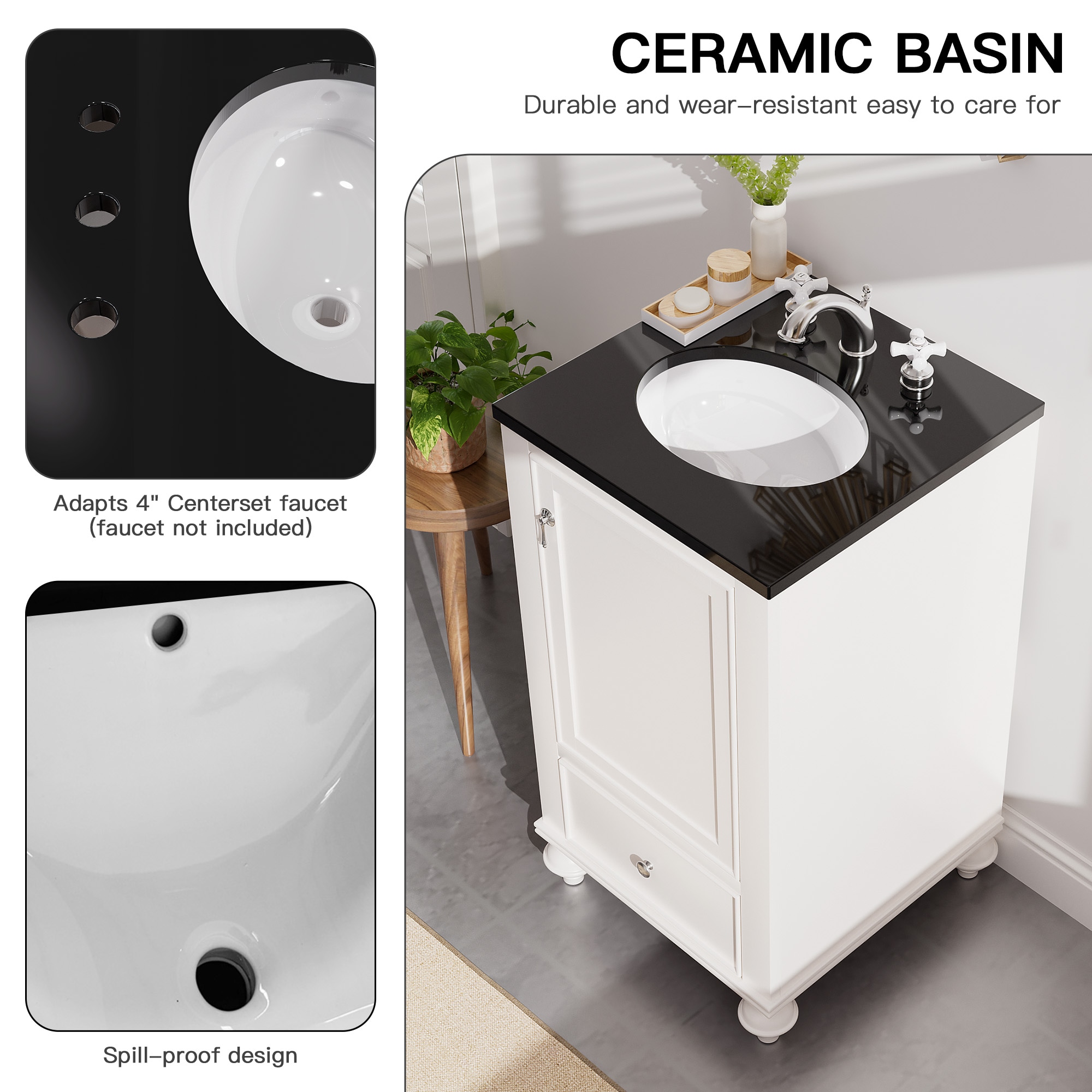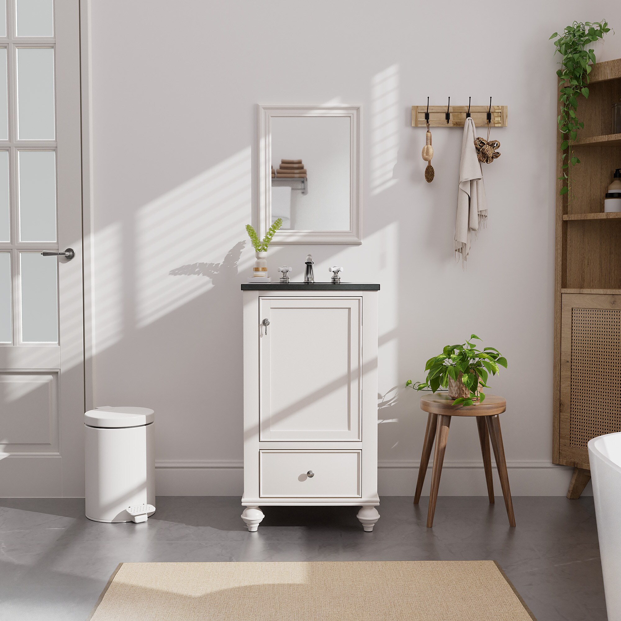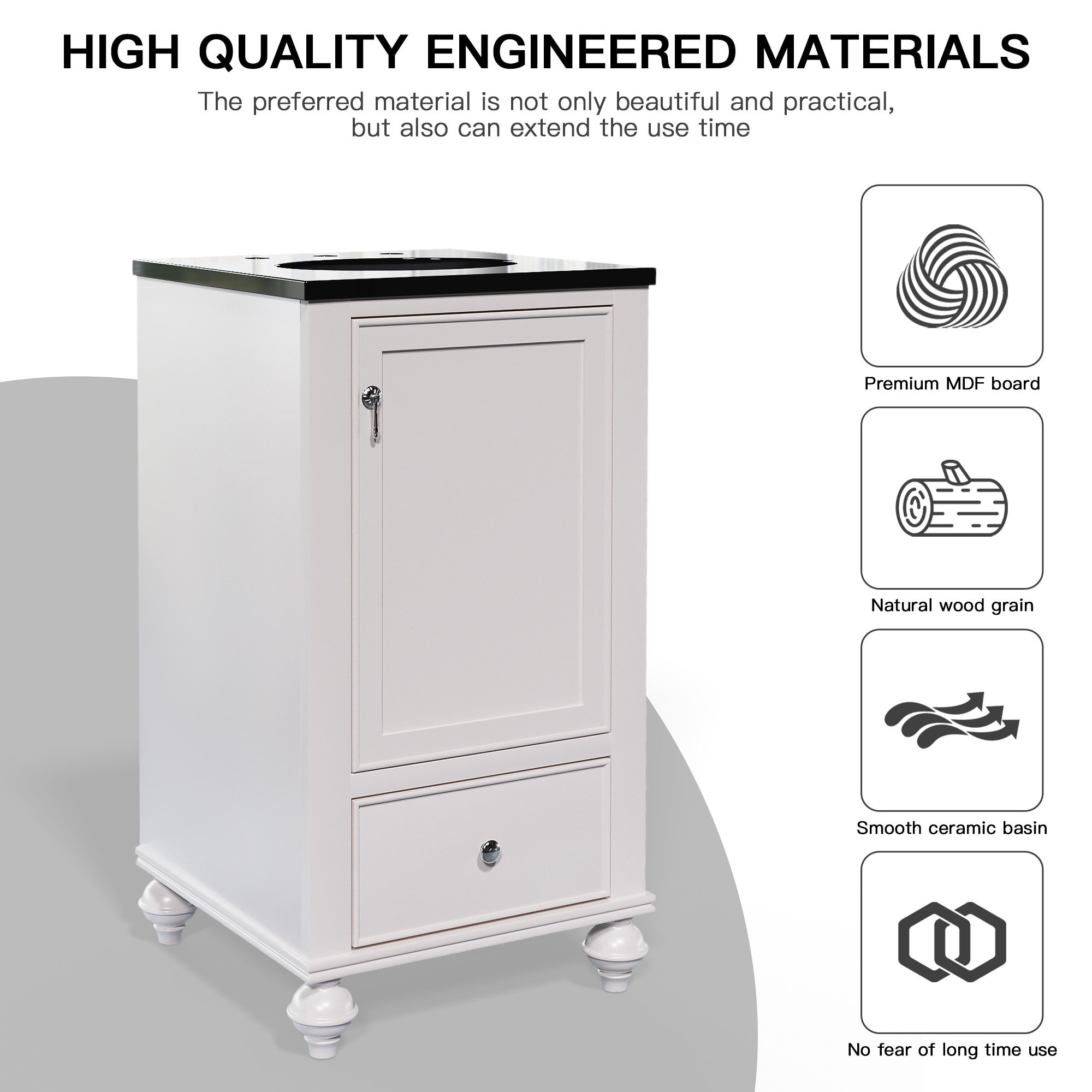 Discover our Classic White Bathroom Vanity — an exquisite blend of elegance and practicality. Its sleek black countertop contrasts beautifully with the pristine white finish, infusing sophistication into any bathroom. The convenient drawer and roomy cabinet offer ample storage, keeping essentials organized and your space clutter-free. Charming traditional legs add a touch of timeless appeal, making it a perfect fit for both classic and modern homes. Crafted for durability, this vanity isn’t just a purchase — it’s an upgrade. Transform your bathroom into a haven of style today!