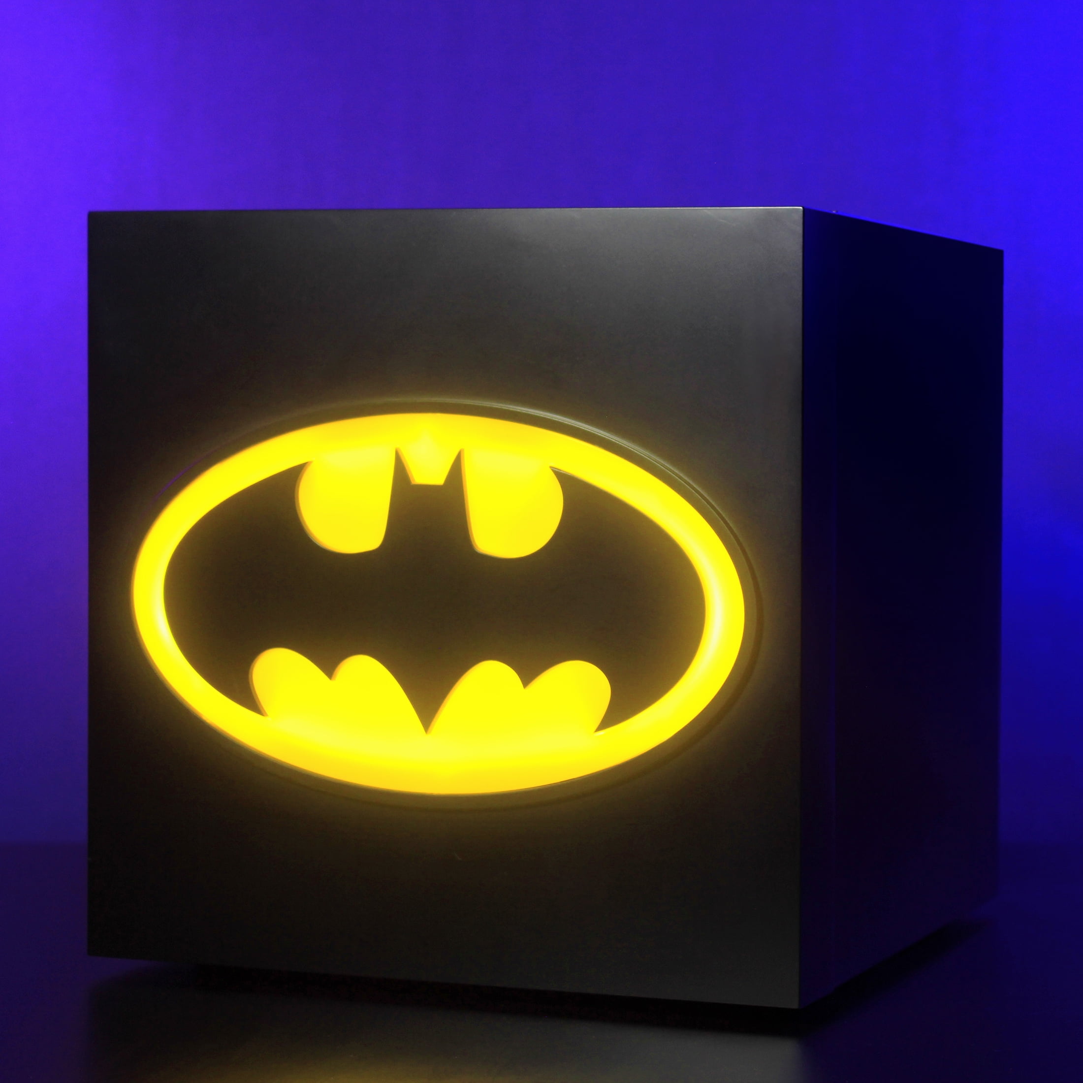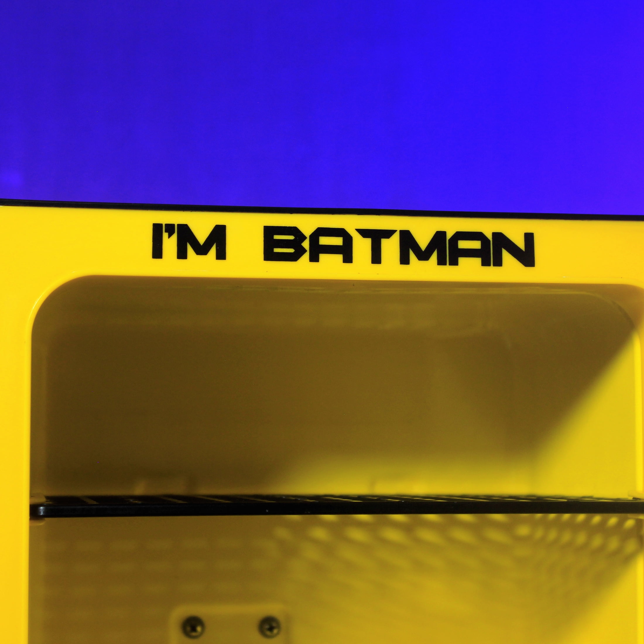The Batman logo in classic yellow and black graces the front of this compact thermoelectric cooler. The dimensional bat logo on the door lights up; the inside declares “I’m Batman”. Perfect for your own personal batcave (aka dorm, gaming area, comic book library, media room) or even the Batmobile with the 12V adapter. 6.7 L capacity—holds up to 9 12 oz. soda cans. Engineered with thermoelectric technology, free from CFCs and refrigerants. Cools to 36°F below ambient temperature. Includes cooler, 120V AC power cord, shelf, door shelf, 12V DC cable (vehicle power), and instructions. Exterior measures 10.4″ tall x 10″ wide x 10″ deep.