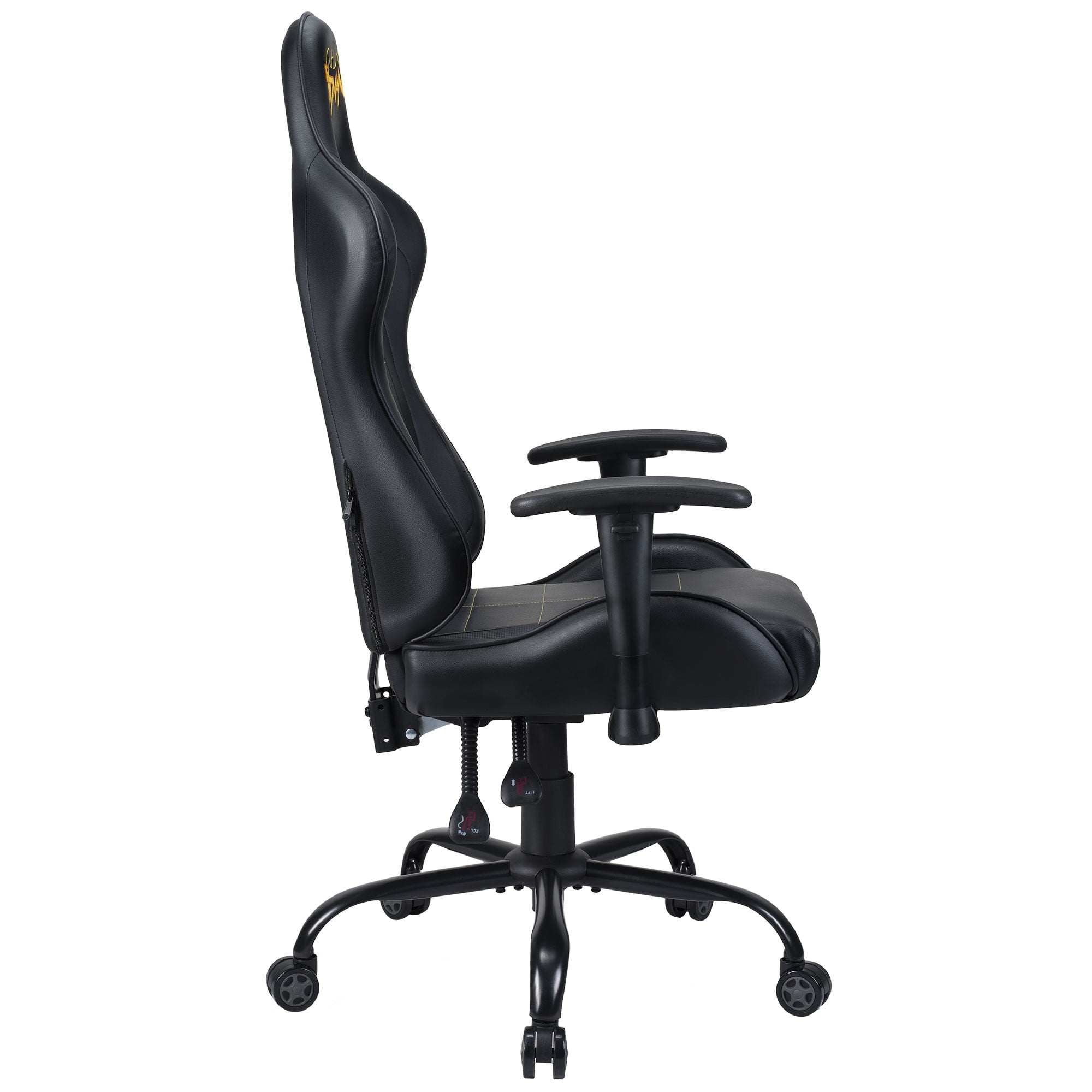 Teen and adult seats that perfectly combine the convenience of a gaming chair with the comfort of a desk chair for Batman fans. Key features: • Ergonomic and comfortable seating • Adjustable armrests: 3D • Easy care leatherette upholstery • High-quality finish with embroidery and stitching • Height and tilt adjustment COMFORT AND ERGONOMICS The Gaming Pro Batman chair is an invitation to learn about eSports. Its bucket backrest perfectly fits the shape of the back, thus preventing back pain and fatigue. Its adjustable armrests optimise comfort and precision. The Gaming Pro chair is ideal for gamers looking for a stylish, eSports oriented chair at an affordable price. QUALITY OF CONSTRUCTION We have selected high quality upholstery that combines strength and design. Made of high-density foam covered with easy-to-clean synthetic leather, the Gaming Pro Batman is adorned with stitching and a fully embroidered logo. Both lightweight and durable, the Gaming Pro has a class 3 gas lift mechanism for everyday use as an office or gaming chair. Finally, Gaming Pro is equipped with a metal star base with 5 castors that provides stability and resistance. DESIGN MADE IN COMICS We have spared no detail in the creation of our Gaming Pro chair. It has been designed to combine ergonomics, comfort and design. Its design, natural curvature and sporty shape give it an elegant and aggressive silhouette at first glance. Genuine embroidery and contrasting stitching add an elegant touch to this gaming chair. With the Gaming Pro chair official Batman license SETTINGS AND FEATURES The Gaming Pro chair has several adjustment functions to find the optimal gaming position. It is equipped with a class 3 actuator that offers excellent stability and allows for precise height adjustment. In addition, this gaming chair has a 3D armrest: height and axis adjustment of the armrest. Finally, the Gaming Pro chair has an adjustable backrest up to 135 degrees, for those who want to take a break between two competitions. The Gaming Pro seat is perfectly suited for teenagers and adults. Recommended size: 160 – 190 cm. Maximum weight 130 kg.