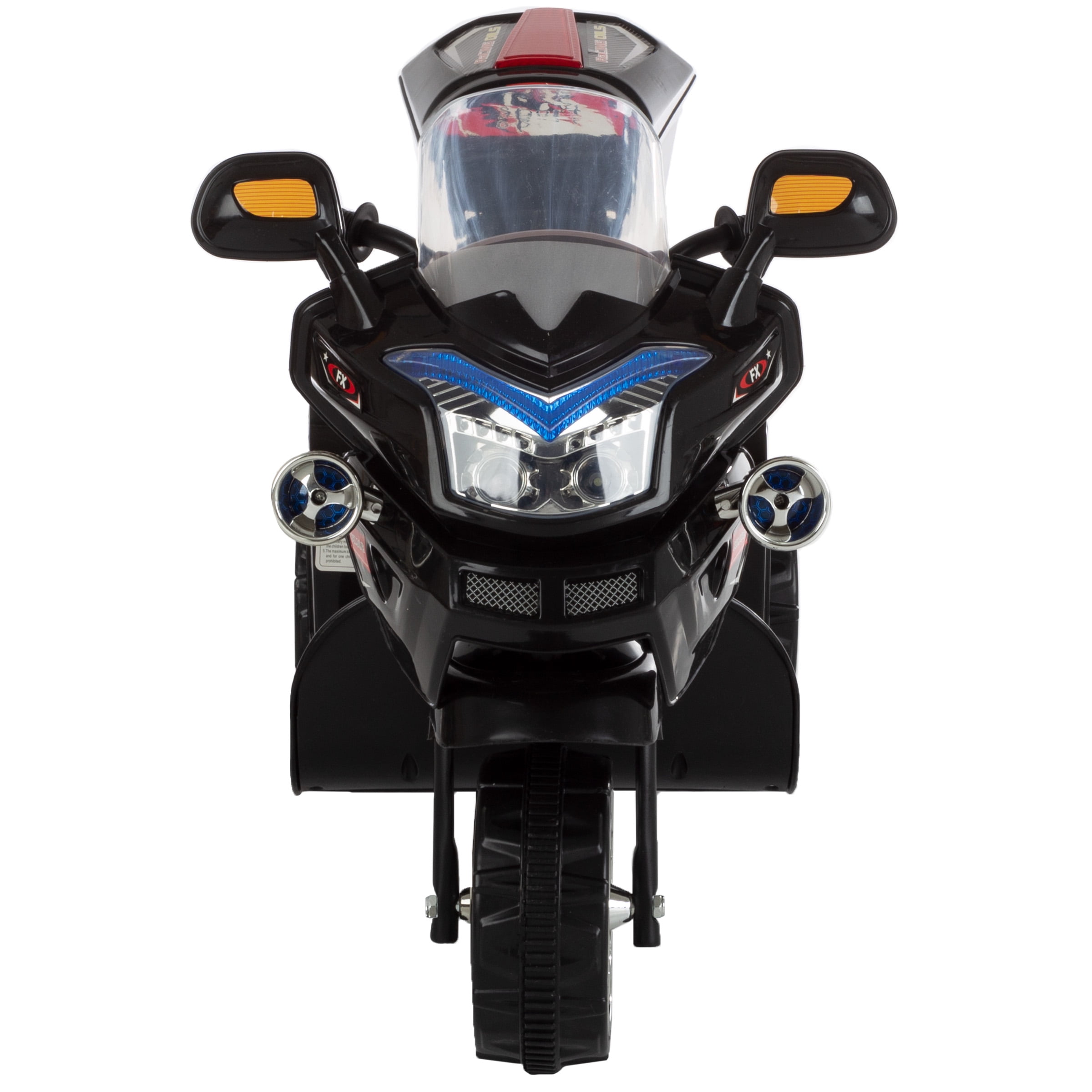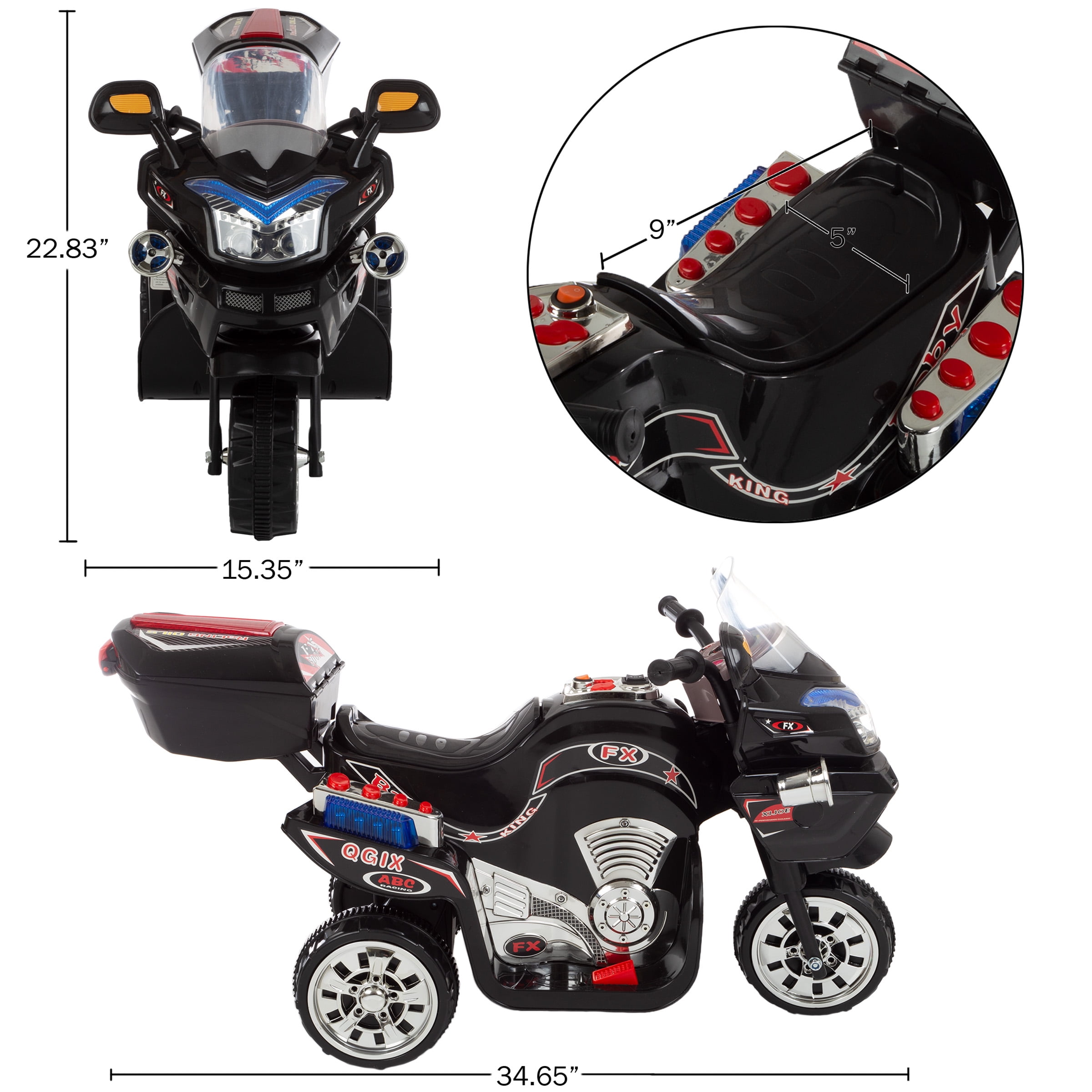 MOTORCYCLE FOR KIDS – The motorcycle for kids aged 3-6 is lightweight and features a compact design for easy transport, perfect for both indoor and outdoor playing on any hard, flat surface. REALISTIC FEATURES – This toddler motorcycle has forward and reverse functions, working headlights, decals, sound effects, a storage compartment, and a top speed of 1.75mph. EASY TO RIDE – Charge the included 6V battery according to the included electric bike for kids’ instruction manual – then simply just turn it on, press the pedal, and go. SAFE AND DURABLE – Made from rugged high-quality plastics and carbon steel that can hold up to 45lbs, the motorcycle toys are free of banned phthalates. MATERIALS – Plastic and Carbon Steel; Specs: 6V Battery, 15W Motor, 4.5ah. DIMENSIONS – (L) 34.65” x (W) 15.35” x (H) 22.83”. COLOR – Black.