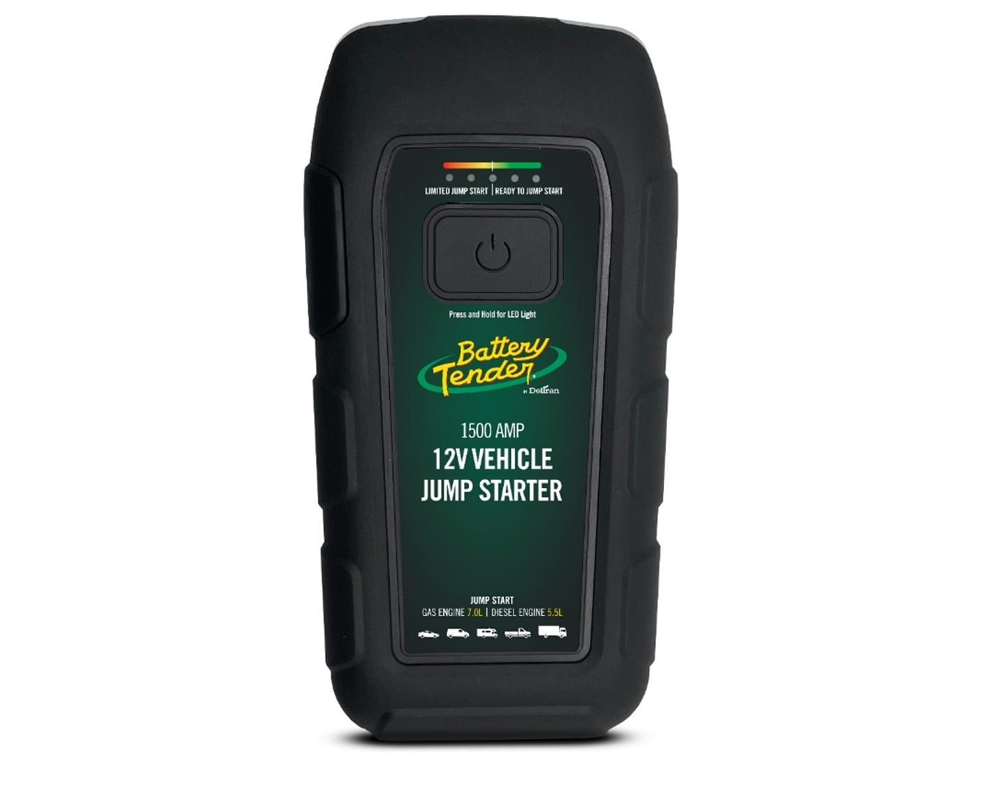 Never feel unprepared again with this durable lithium-powered Battery Tender 1500 AMP Jump Starter and Power Bank. Fits in your glove compartment or under your seat, yet strong enough to start any 12 volt battery on gas and diesel engines up to a V8. This product is safe and easy to use with motorcycles, cars, SUVs, trucks, and RVs. Capable of up to 40 jump starts per full charge. Gone are the days of asking for a jump and connecting to another battery with cumbersome jumper cables. Simply connect each alligator clip to the corresponding terminal on your vehicle’s battery and start up the engine. Spark proof and reverse polarity protection gives you peace of mind and ensures you’re connecting to the correct terminal before the jump starter kicks in. At just 1.5” x 4.25” x 8.0”, 1.3 lbs, this new compact jump starter in it’s hard zippered case easily stores in your vehicle for a boost when you need it. Perfect for all types of vehicles, the Battery Tender 1500 AMP Portable Jump Starter and Power Bank includes an ultra-bright LED flashlight and 3 fast-charging ports to ensure you have the power you need in an emergency. Also includes a type C charging cable, USB wall plug, female cigarette adaptor, and hard carrying case.