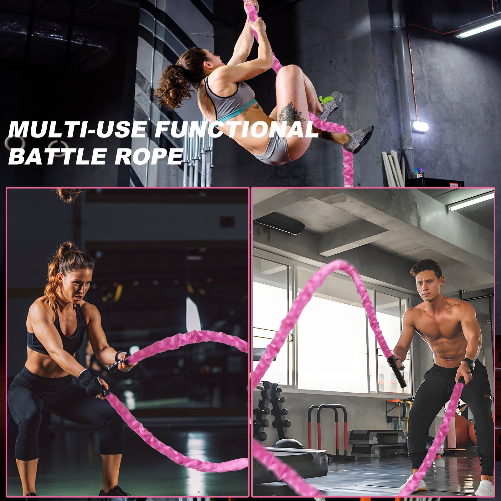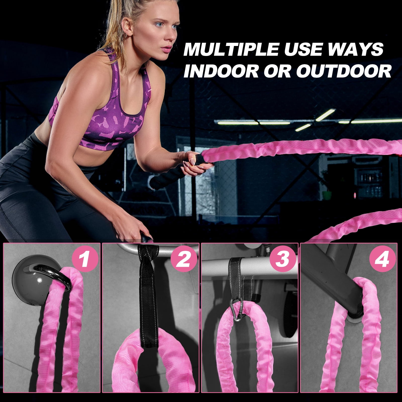 Feature: Lean Mass: Battle ropes are a must-have tool for anyone looking to pack on lean mass. The key to their effectiveness is that they work each arm independently, eliminating strength imbalances as they sculpt your muscle. Protective Nylon Cover: Our heavy duty handle with safe design can protect your hands, make the rope not easy to slide from your hands, keep fit safely, and strengthen the hand moderately. Extra Coated Handle: Design to withstand rigorous use, the cover surrounding the rope will help deter dirt and prevent the rope from fraying. This will greatly increase the life of the battle ropes and allowing it to be used outdoor. Package Include: 1 x Battle Rope(with protective sleeve) 1 x Stable Anchor 1 Pair Battle Gloves 4 x Anchor Bolts 1 x Carabiner 1 x Headband 4 x Straps