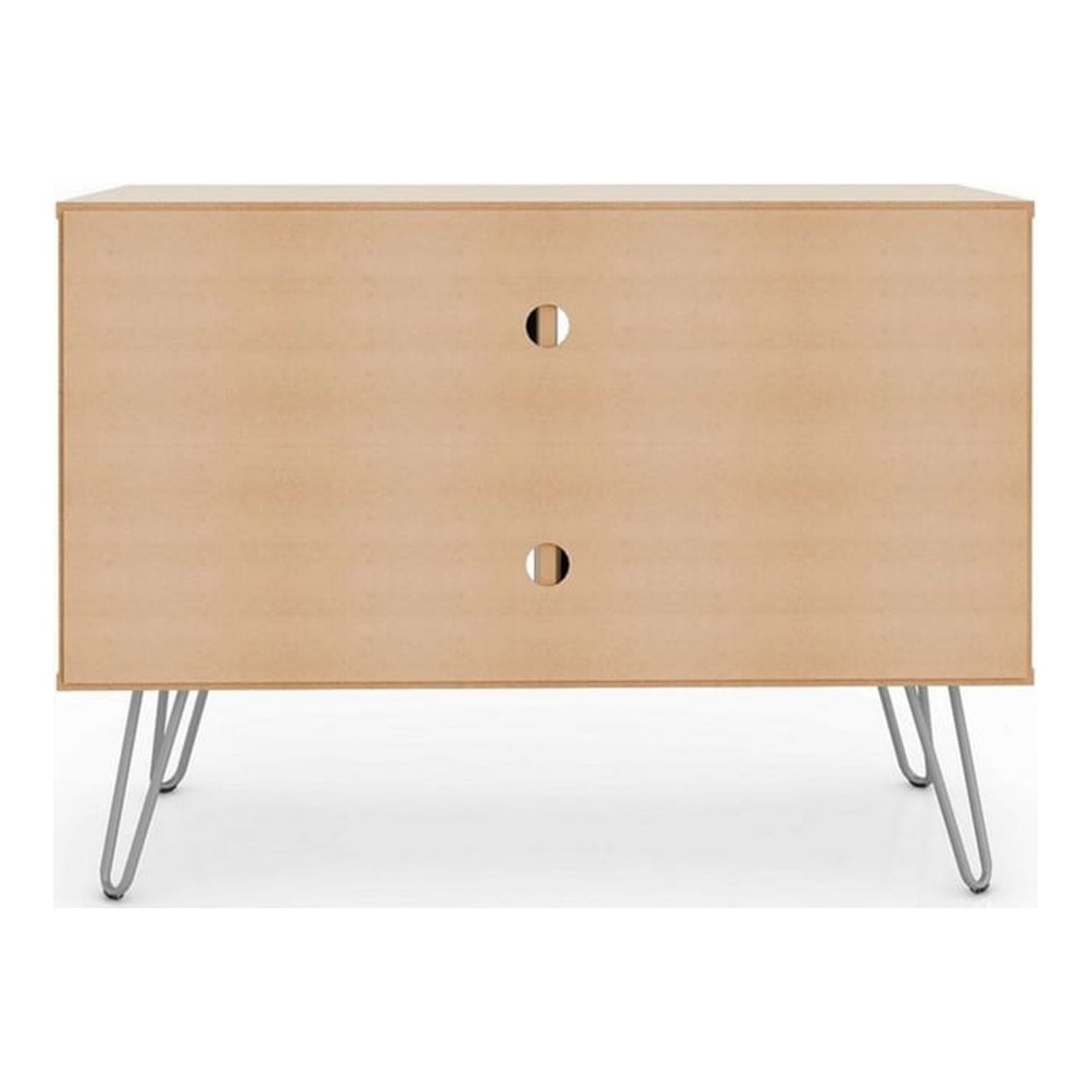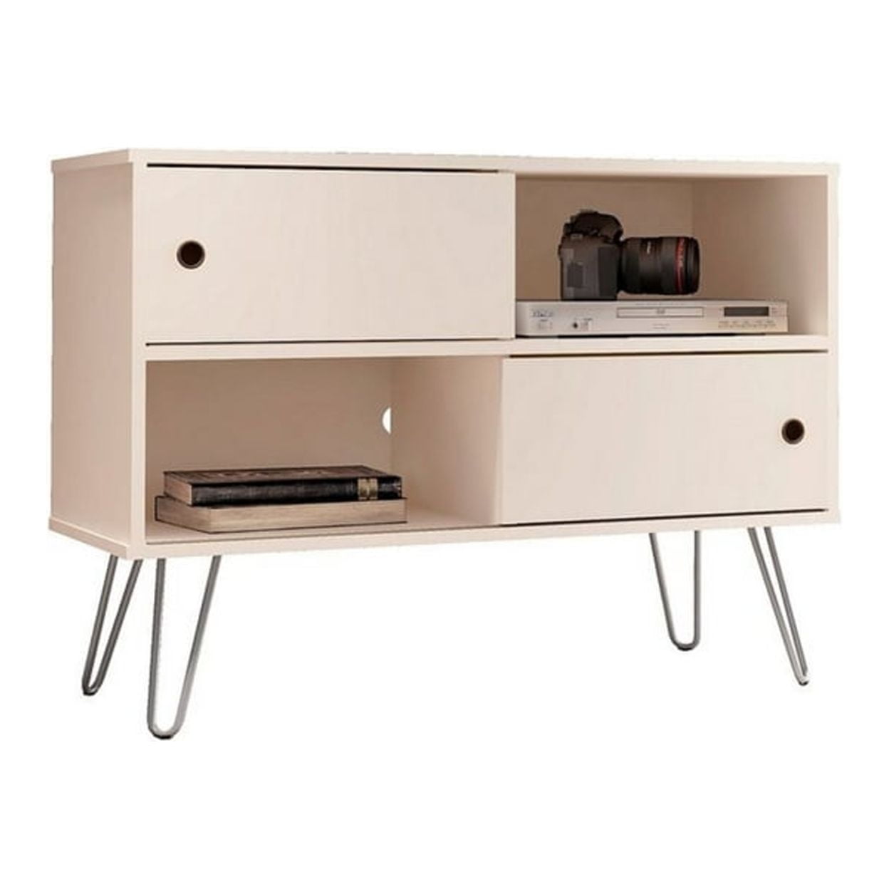 The Baxter TV stand moonlights as an end table and the perfect living or bedroom accent, while functioning as a storage and entertainment center in one subtle and sophisticated display. Four shelves hold your most impressive books or decorative accents to keep the room looking cool and clean, while two sliding doors conceal cable boxes, gaming consoles, and remotes. Circular openings perfect for wire management make it easy to set up and splayed metal legs play up the Mid-Century Modern design for added interest. Specifications: Free Standing Modern TV Stand for Living Room and Bedroom use. Upon Assembly, Measures: 35.43 in. Length, 24.21 in. Height, 14.17 in. Depth. Recommended for a 32″ TV. Includes 2 Media Holes for Wire Management. Features Splayed Wire Metal Legs for Fashion and Durability. Includes 2 Sliding Doors with Hollow Ring Handles. With a total of 4 Storage Compartments, Choose to Hide or Display 2 Shelves at a time. Home Assembly Required. All Hardware Included.