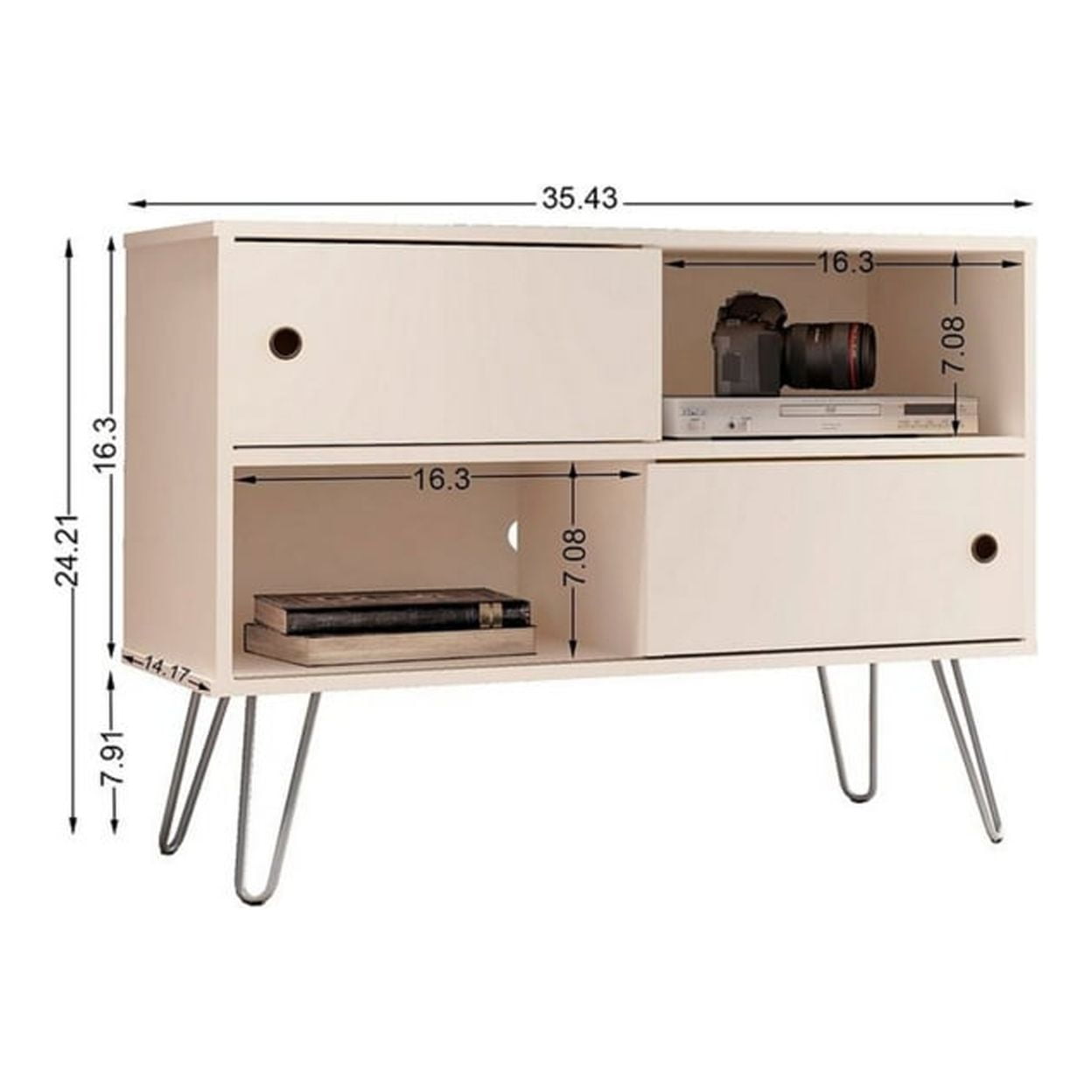 Free Standing Modern TV Stand for Living Room and Bedroom use. * Upon Assembly, Measures: 35.43 in. Length, 24.21 in. Height, 14.17 in. Depth. * Recommended for a 32″ TV. * Includes 2 Media Holes for Wire Management. * Features Splayed Wire Metal Legs for Fashion and Durability. * Includes 2 Sliding Doors with Hollow Ring Handles. * With a total of 4 Storage Compartments, Choose to Hide or Display 2 Shelves at a time. * Home Assembly Required. All Hardware Included.